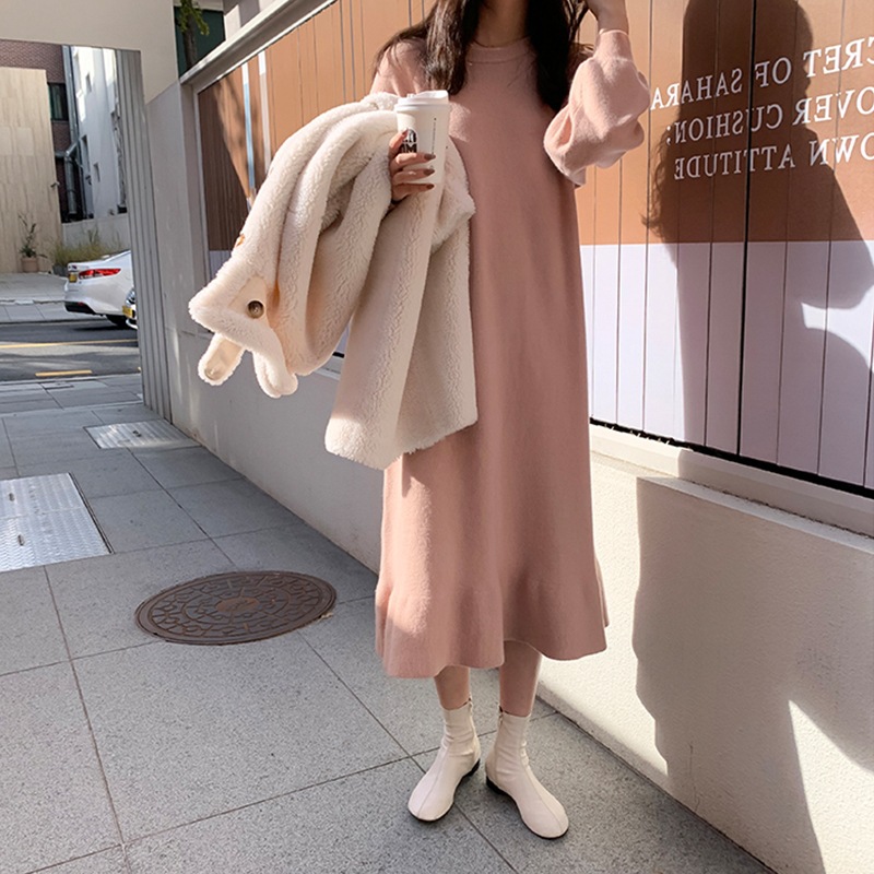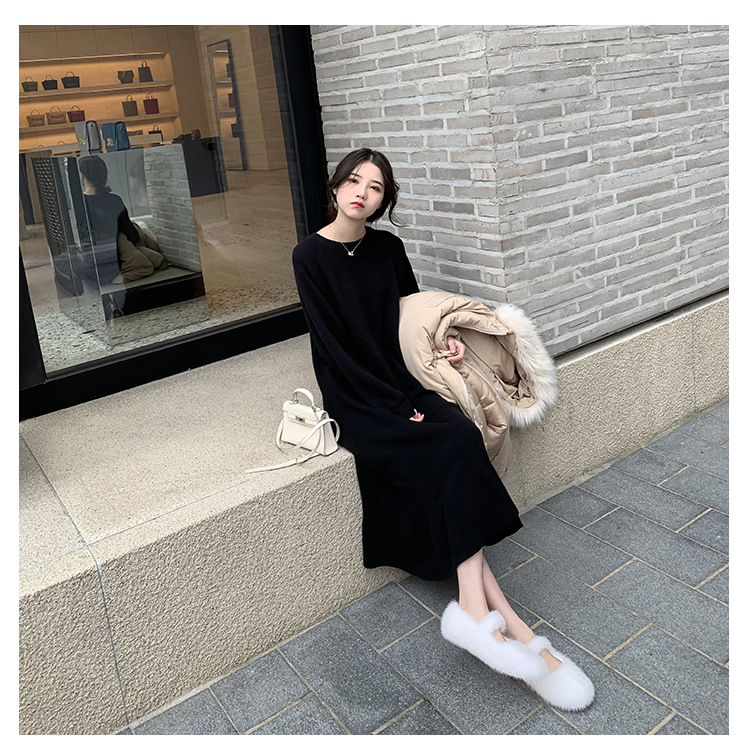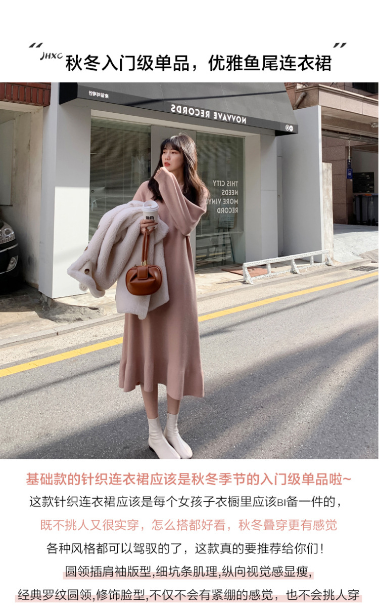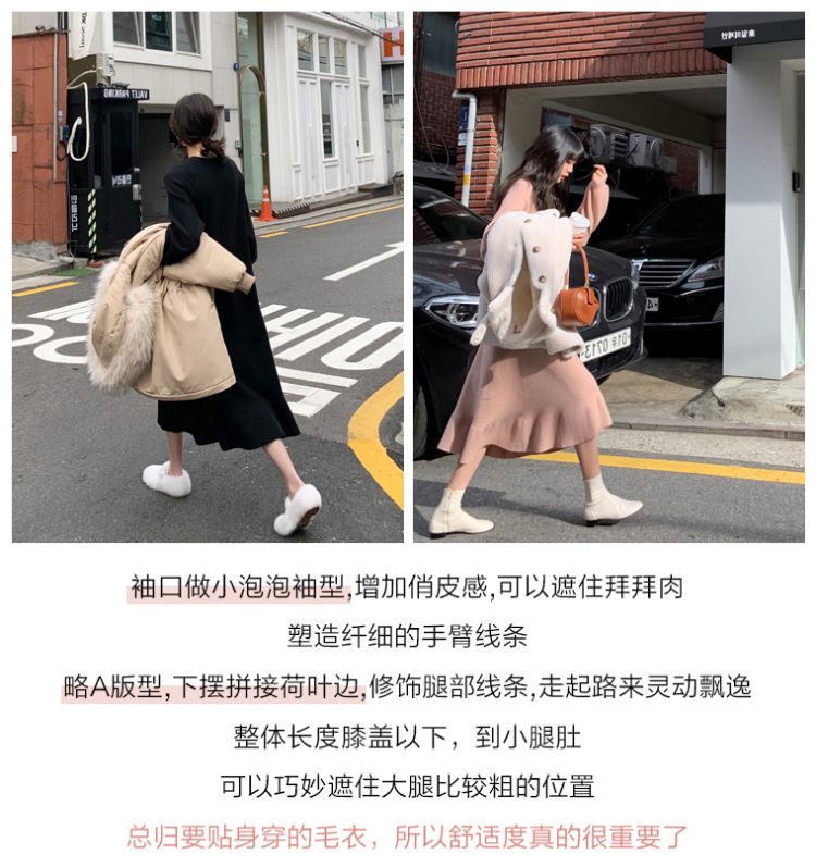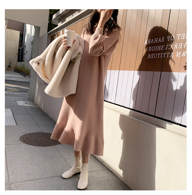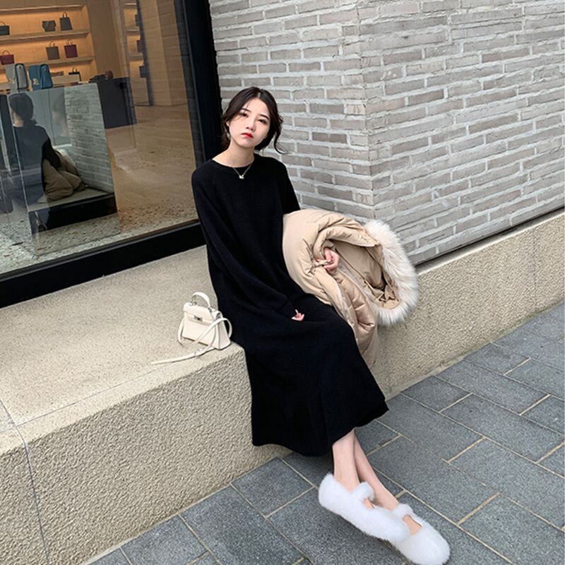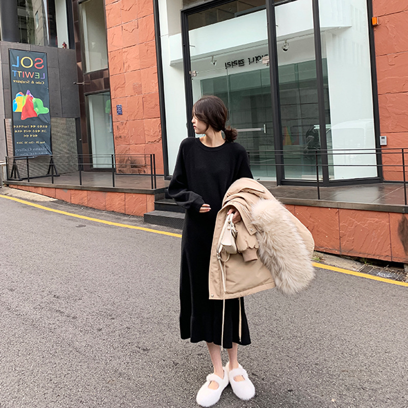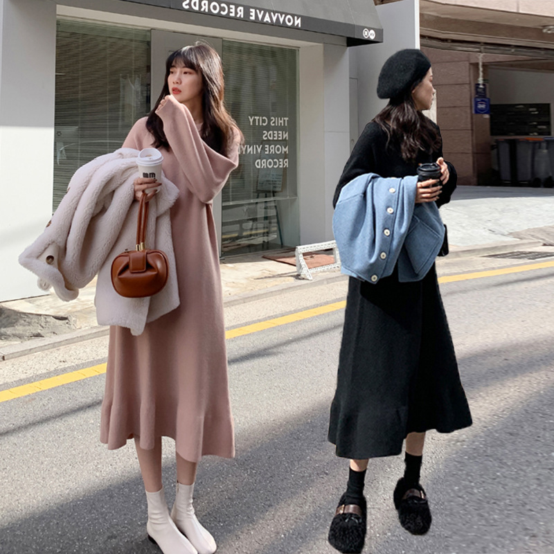 200 Jin Свободный свитер до колена большого размера, осенне-зимнее платье с оборками, юбка-годе, базовое вязаное платье, модное