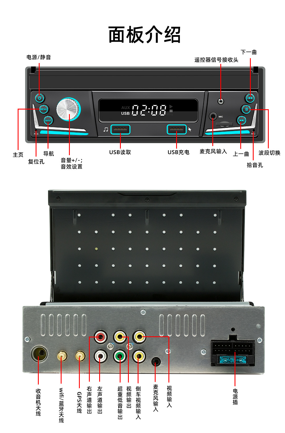 配件:1.主机 2.GPS天线 3. 20P电源线 4.小辣椒天线 5.说明书 (配件、说明书、包装会不定时更新,以实际收到货为准)