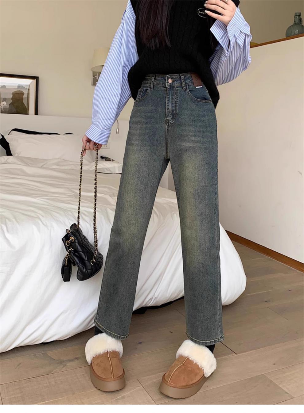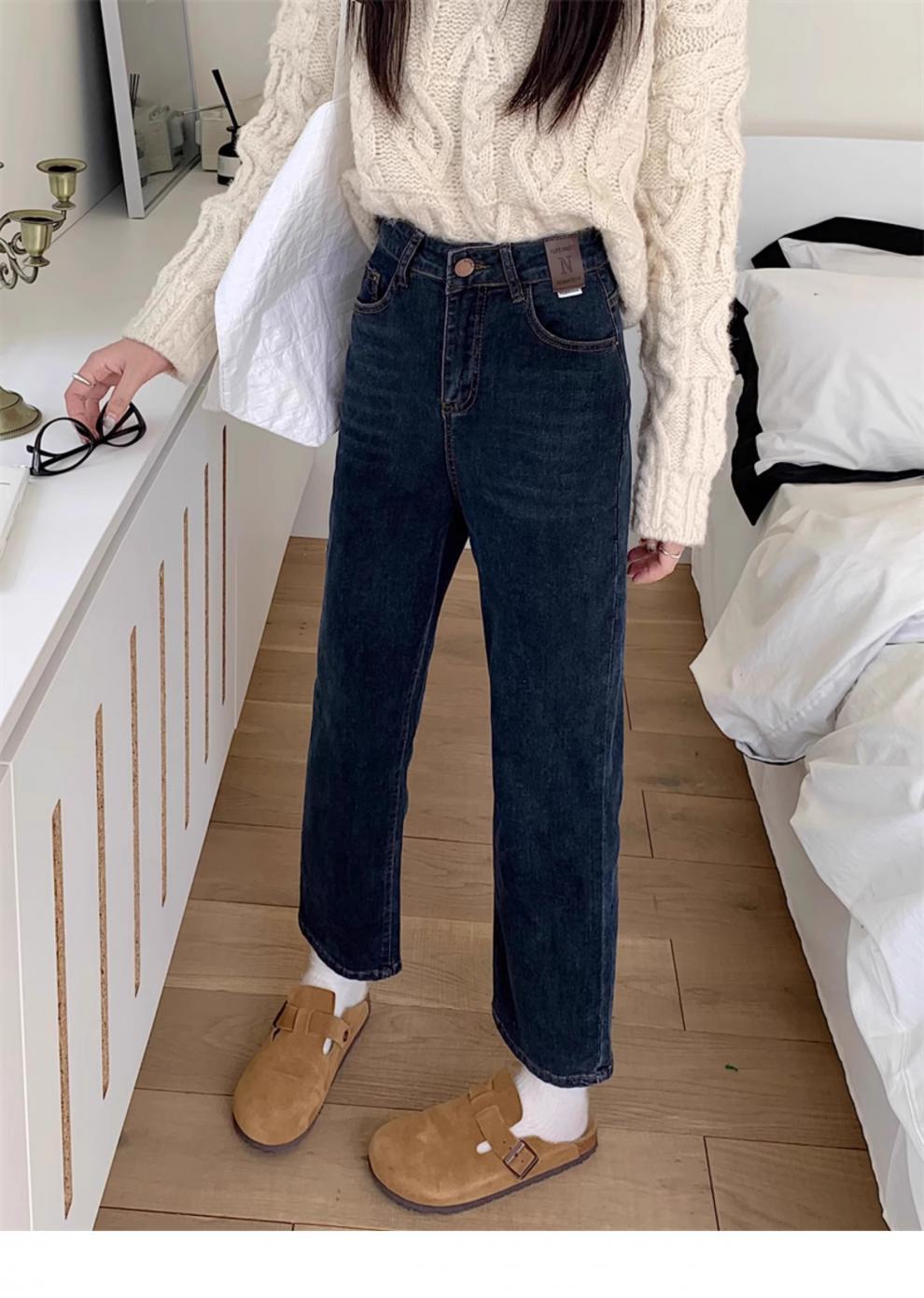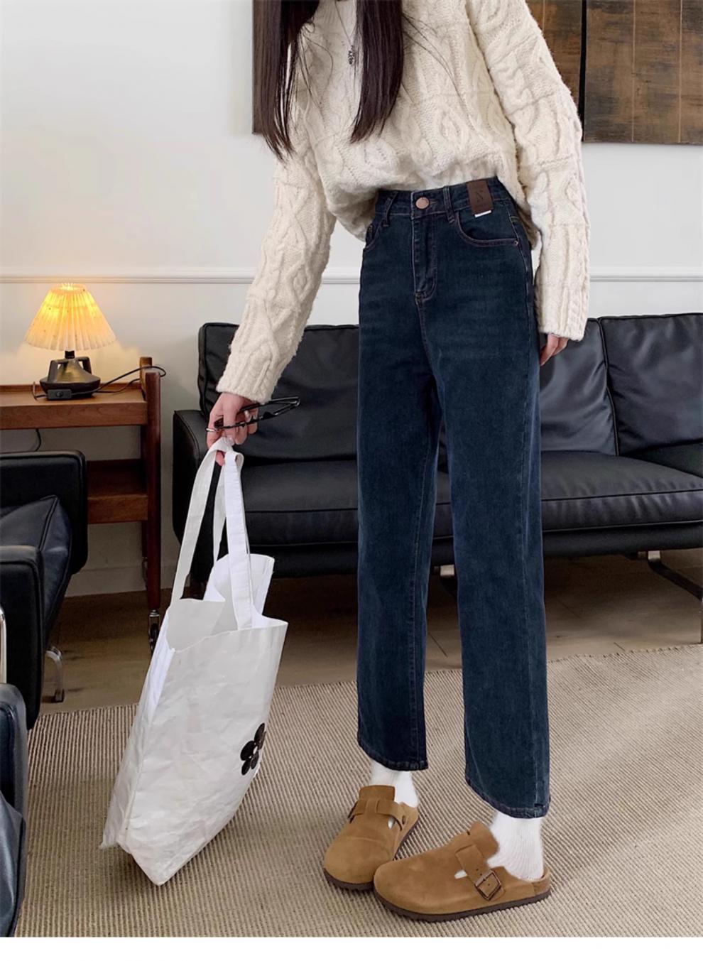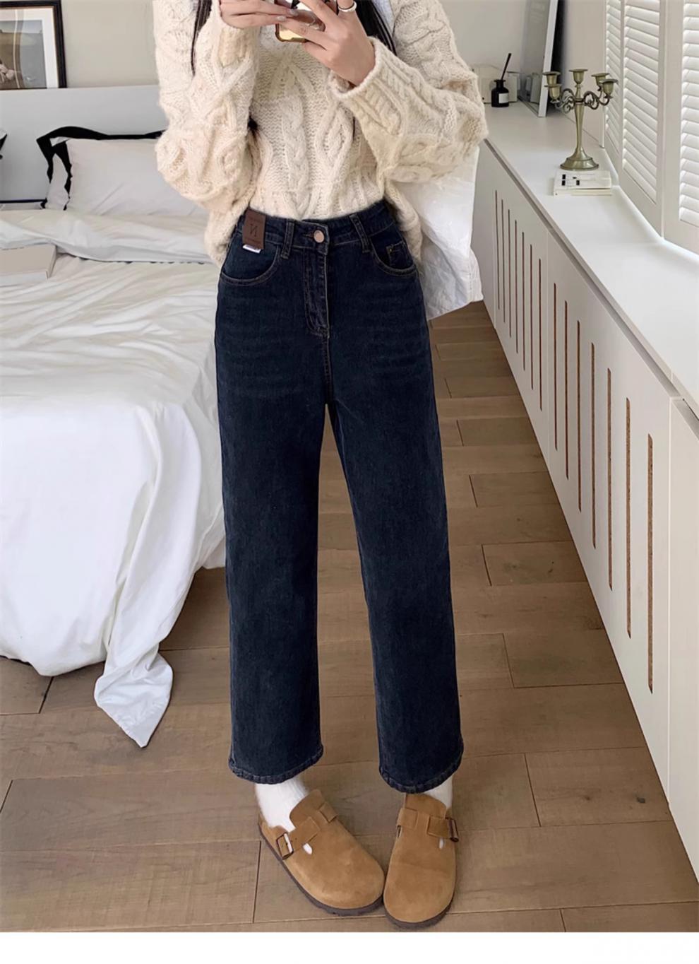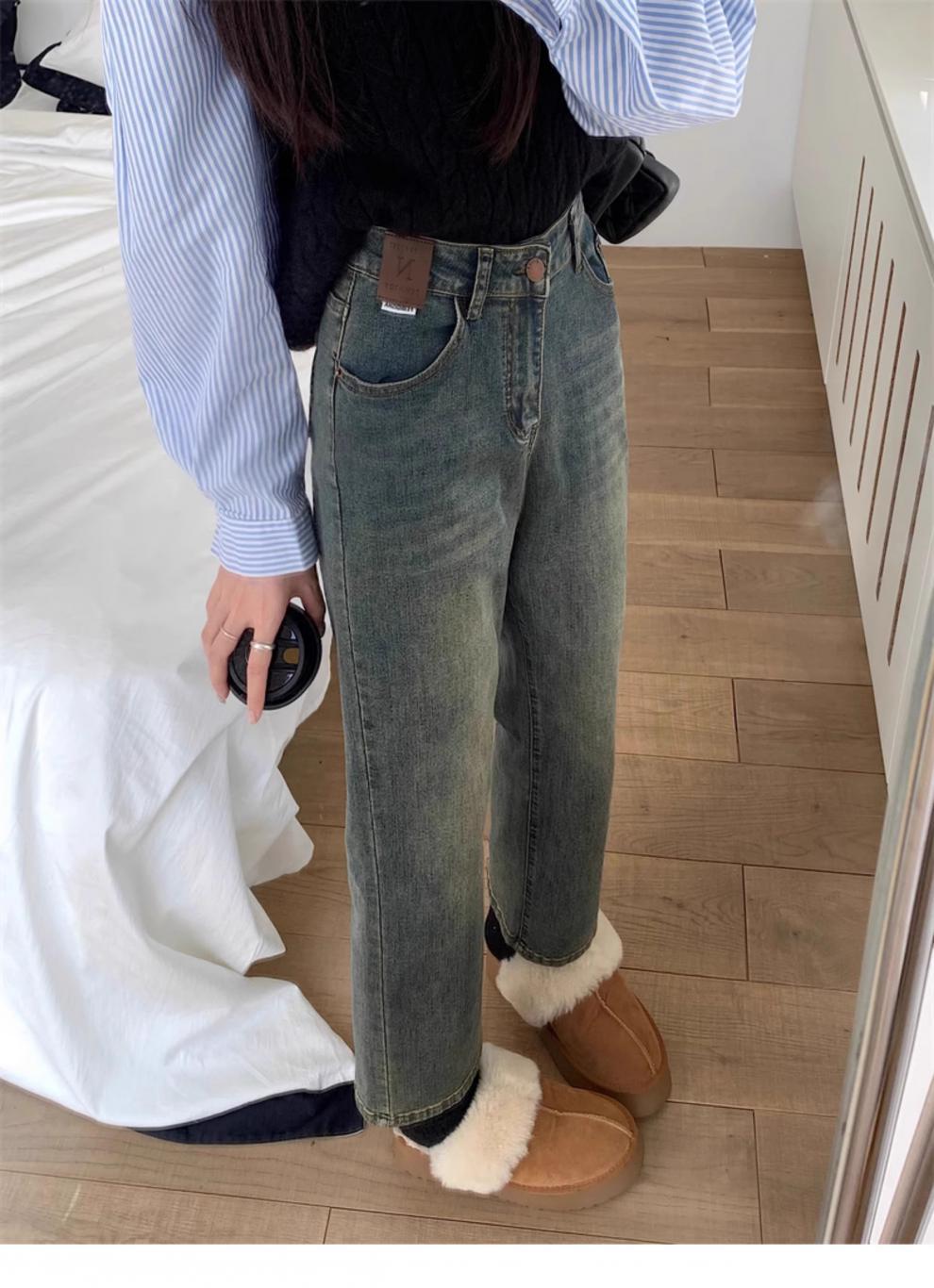 Женские прямые брюки с высокой талией, Зимние новые джинсовые брюки с флисовой подкладкой, толстые женские грушевидные тонкие укороченные брюки для похудения