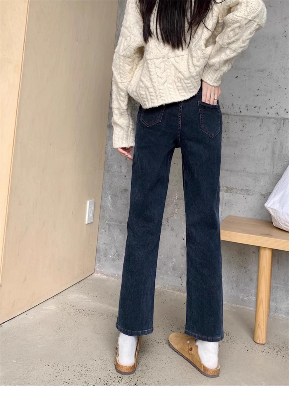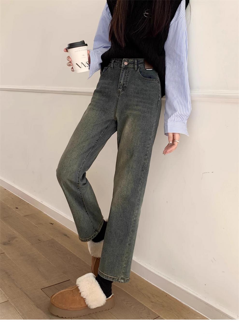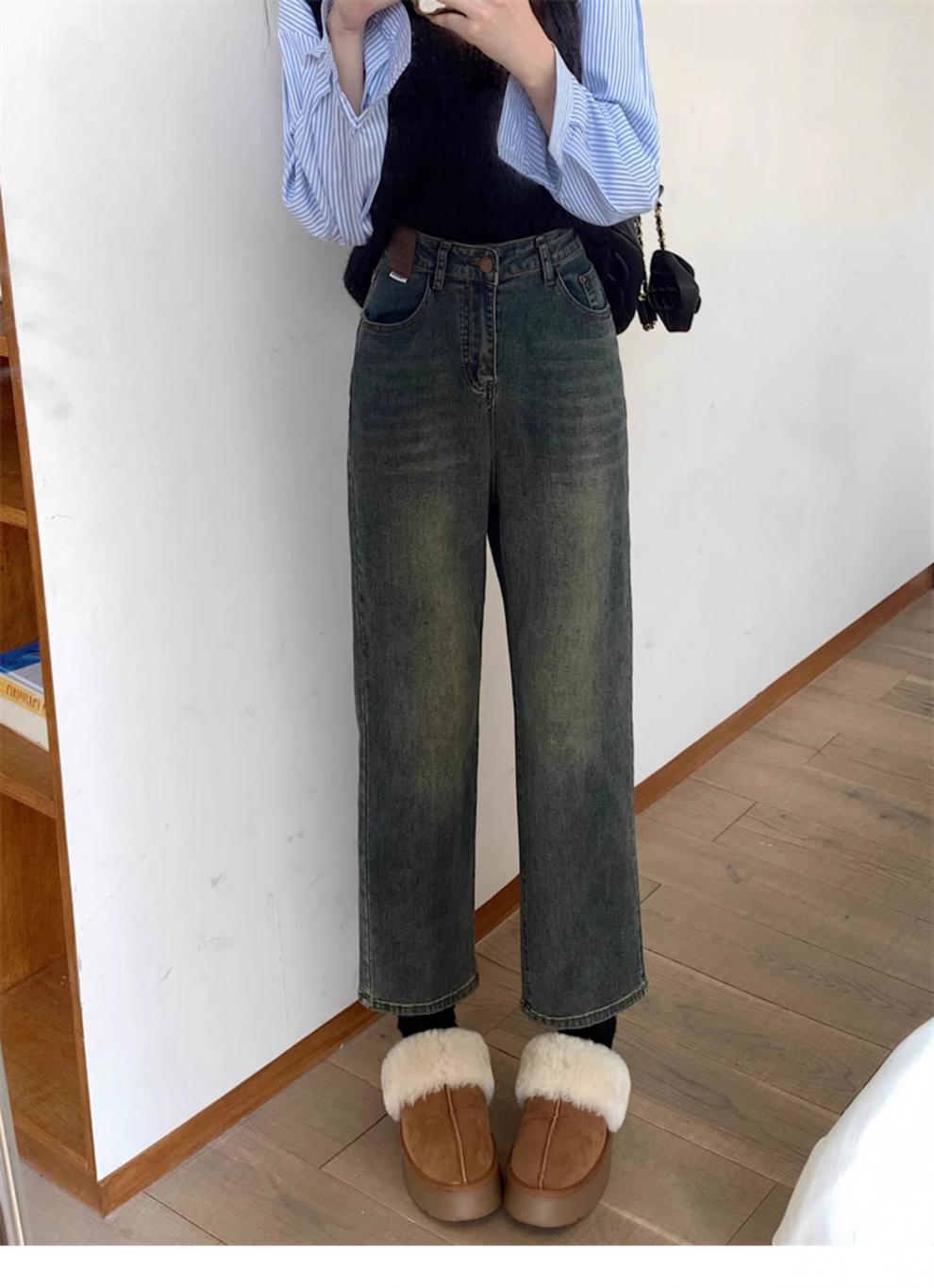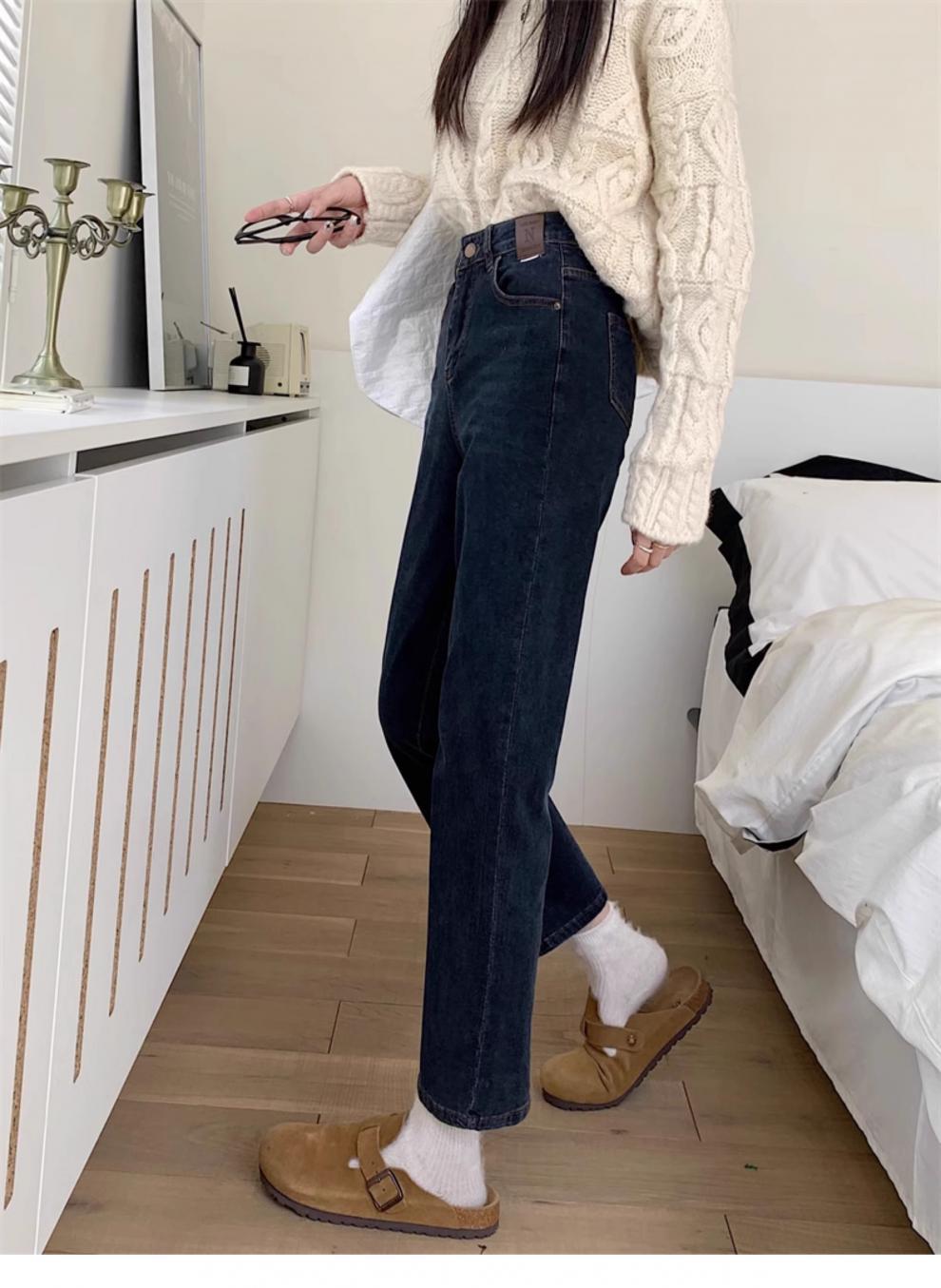 Женские прямые брюки с высокой талией, Зимние новые джинсовые брюки с флисовой подкладкой, толстые женские грушевидные тонкие укороченные брюки для похудения
