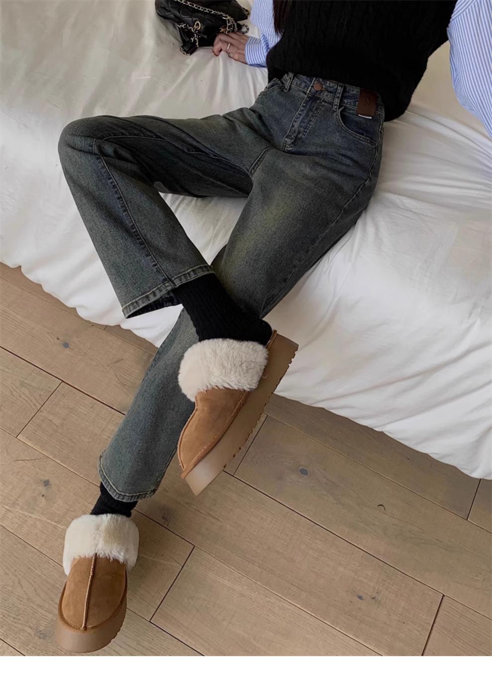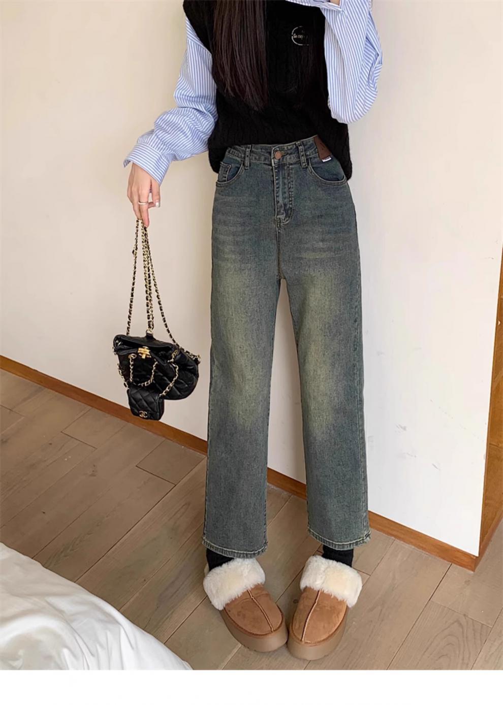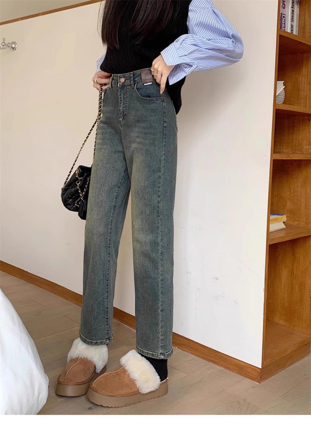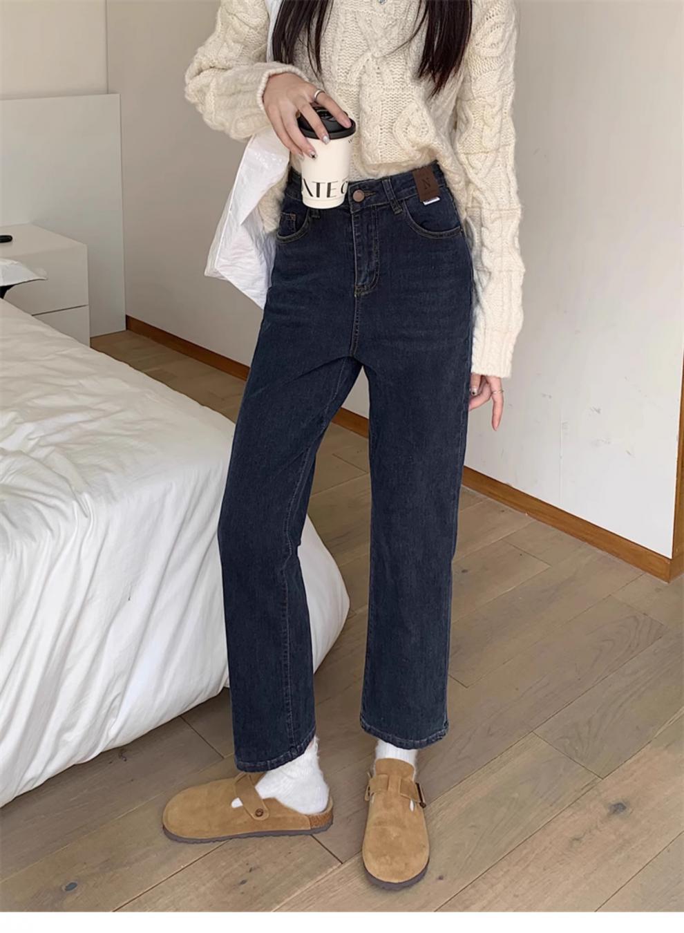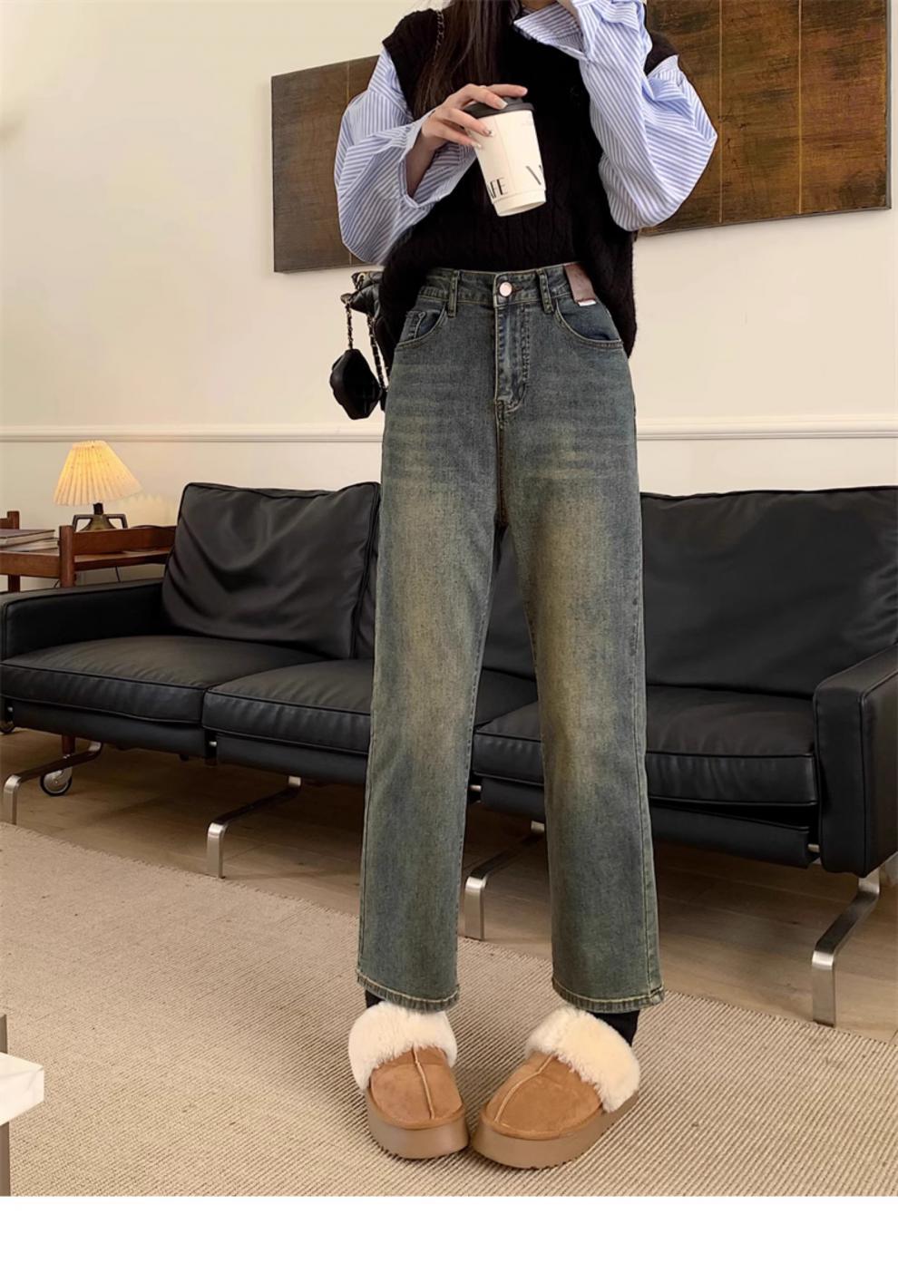 Женские прямые брюки с высокой талией, Зимние новые джинсовые брюки с флисовой подкладкой, толстые женские грушевидные тонкие укороченные брюки для похудения