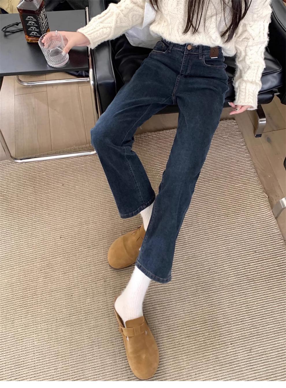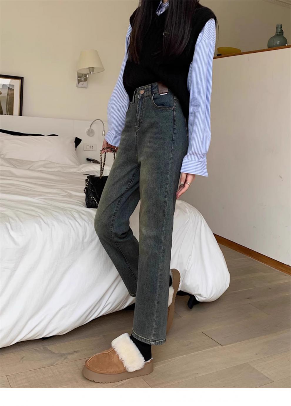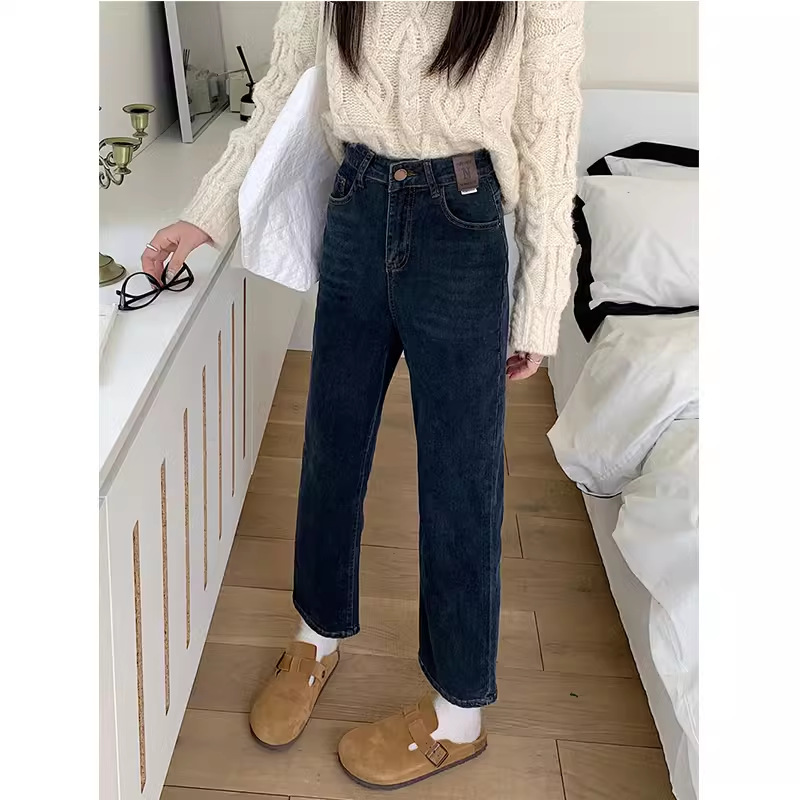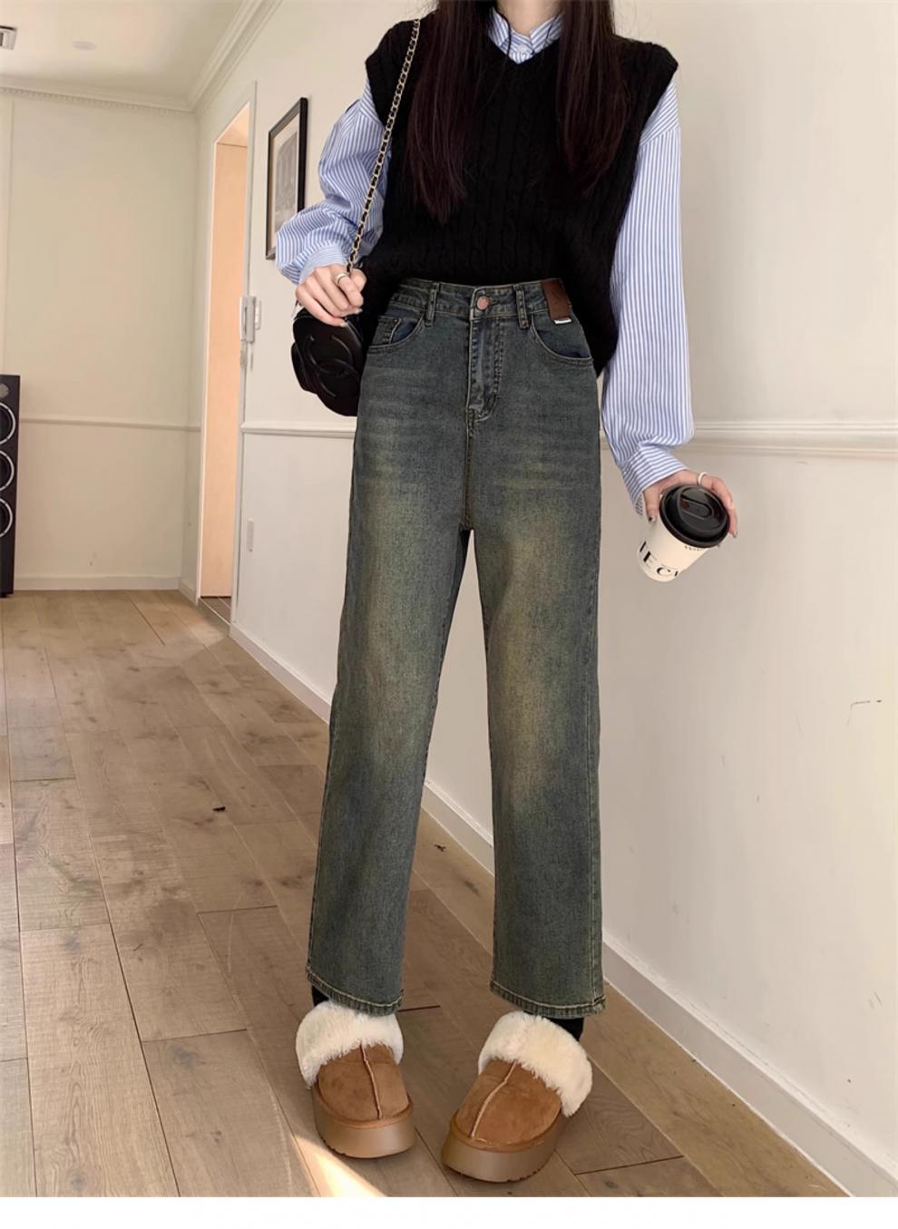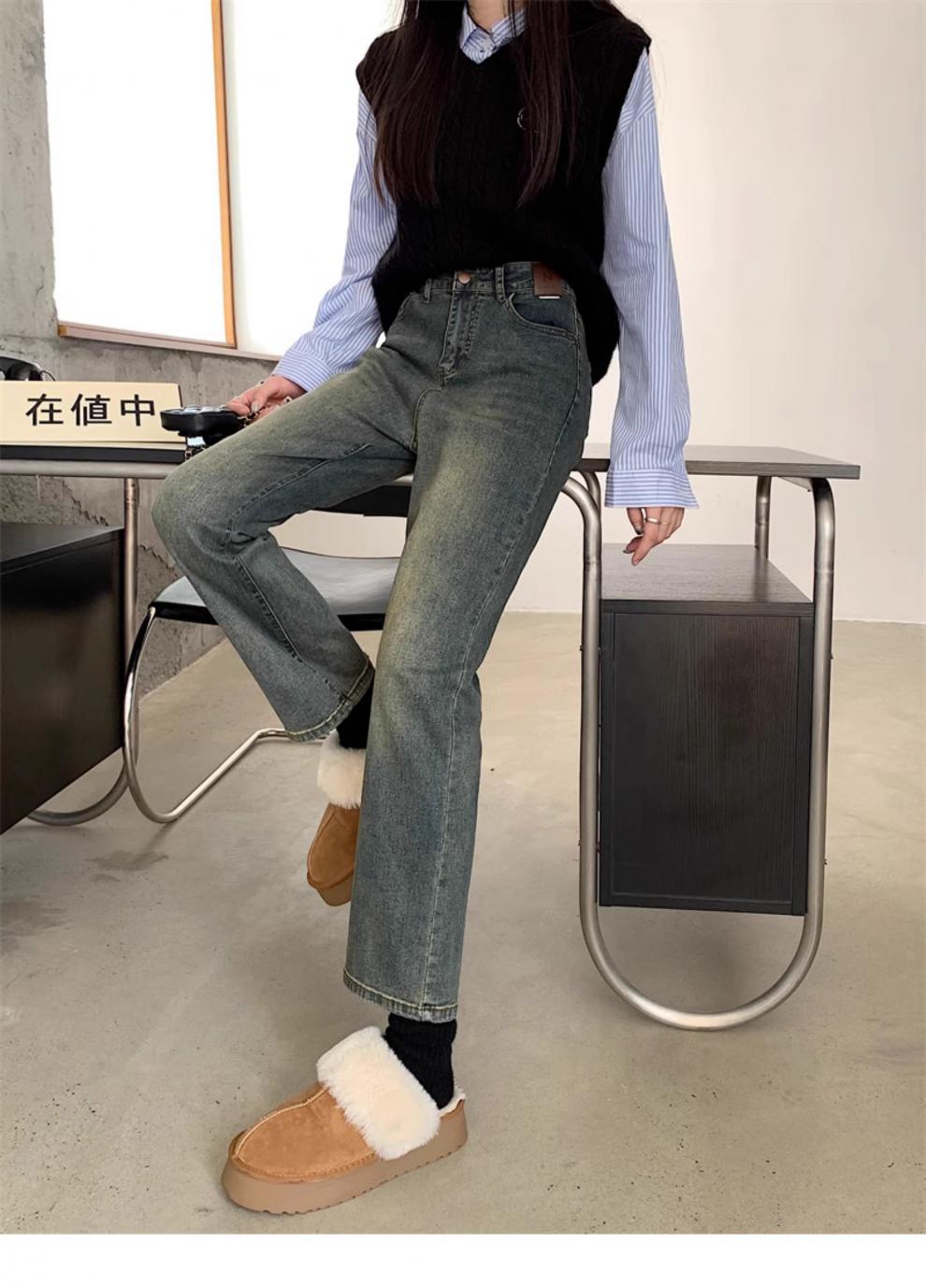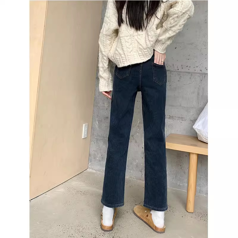 Женские прямые брюки с высокой талией, Зимние новые джинсовые брюки с флисовой подкладкой, толстые женские грушевидные тонкие укороченные брюки для похудения