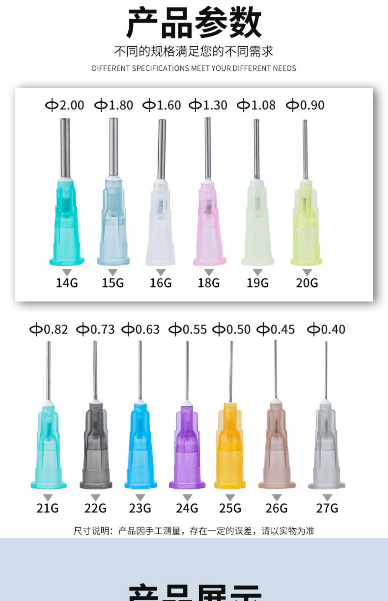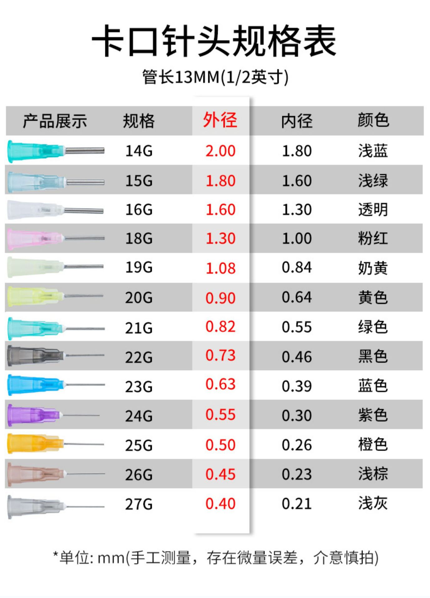 1 для каждого судебного разбирательства; 0,4 мм серый 27 г (50 шт.); 0,45 мм коричневый 26 г (50 шт.); 0,5 мм апельсин 25 г (50 шт); 0,55 мм фиолетовый 24 г (50 шт); 0,6 мм синий 23 г (50); 0,7 мм черный 22 г (50 шт.); 0,8 мм зеленый 21 г (50 точек); 0,9 мм желтый 20 г (50); 1,0 мм светло-желтый 19G(50); 1,2 мм Розовый 18 г (50); 1,6 мм прозрачный 17G(50); 1,8 мм голубой 15 г (50); 2,0 мм светло-зеленый 14 г (50); 0,4 мм серый 27 г (100 шт.); 0,45 мм коричневый 26 г (100 шт.); 0,5 мм оранжевый 25 г (100); 0,6 мм синий 23 г (100); 0,7 мм черный 22 г (100); 0,8 мм зеленый 21 г (100); 0,9 мм желтый 20 г (100); 1,0 мм желтоватый 19G(100); 1,2 мм Розовый 18G(100); 1,6 мм прозрачный 17G(100)