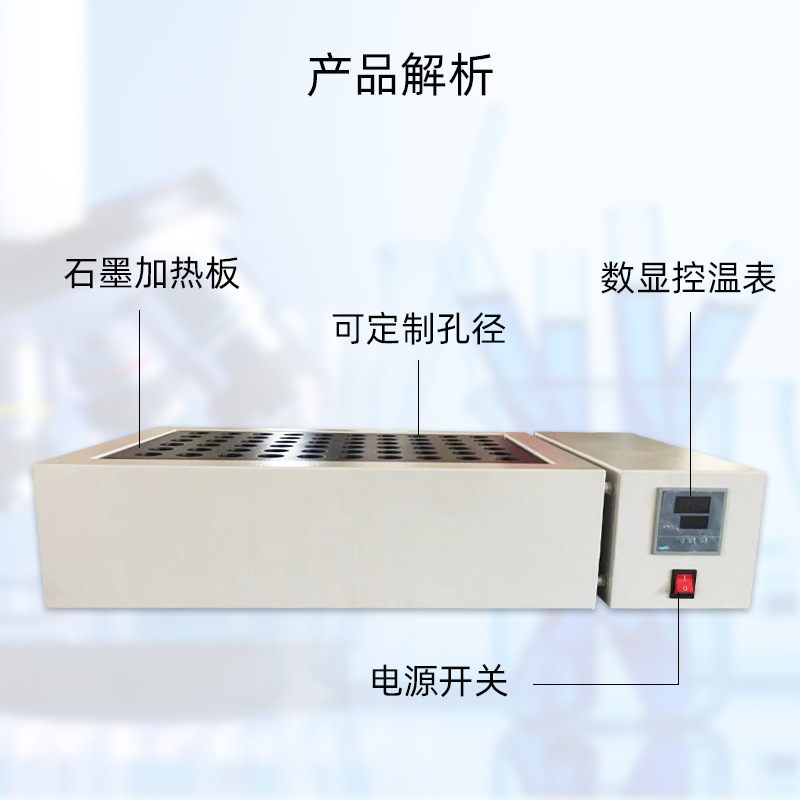 石墨消解器,是通过石墨块进行加热,产生高温对放进消解管中的样品进行高温的消解,用户可以自行设定需要的温度,仪器会通过PID控制方式、自动将温度均匀升温到的温度后恒温持续对样品进行加热处理。