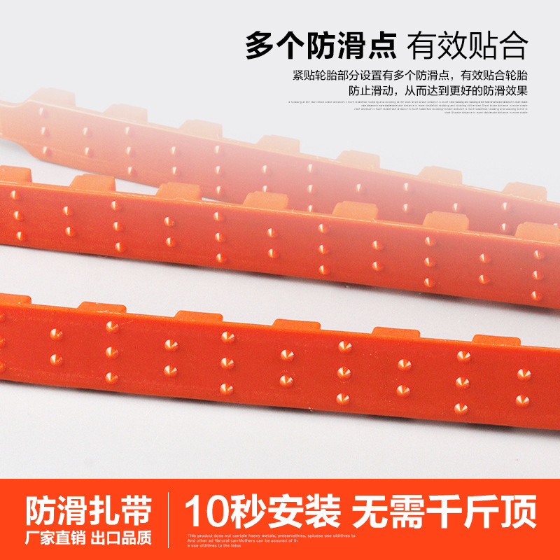 使用方法:扎带锁紧头一方向轮胎外侧、将带身防滑齿贴紧轮胎与地面摩擦面、扎带尾部由内而外穿出带孔一拉,即可牢牢锁住。