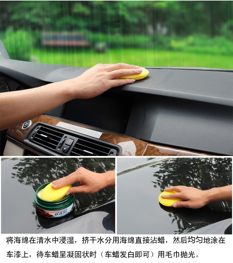 1.车漆——打蜡海绵擦,将海绵在清水中浸湿,挤干水份 用海绵直接沾蜡(不宜过多),然后均匀地涂在车漆上,待车蜡呈凝固状时(车蜡发白即可),用毛巾抛光。