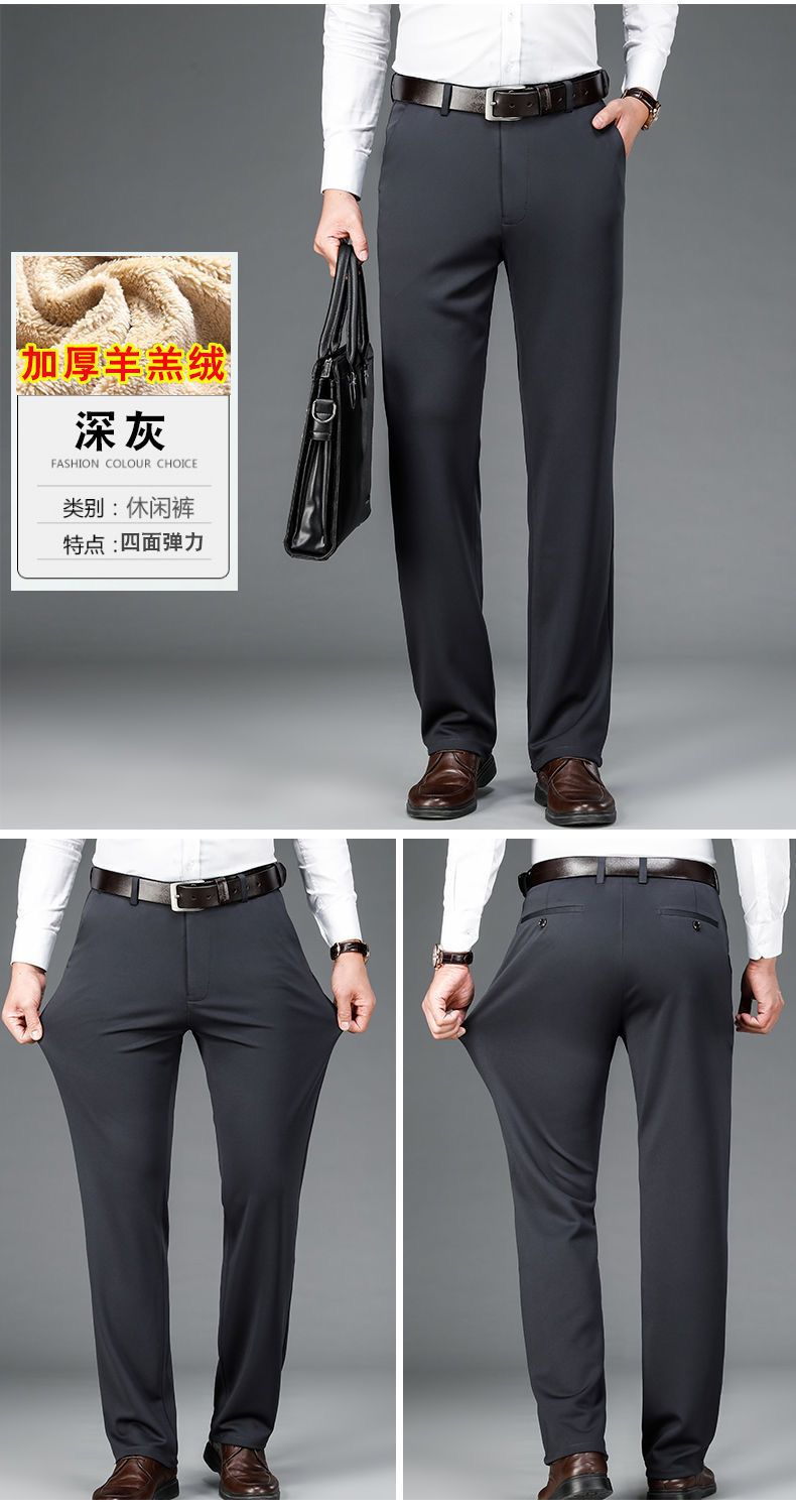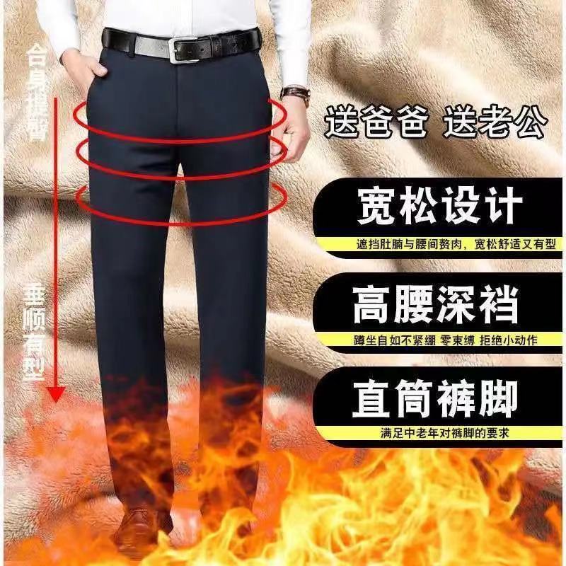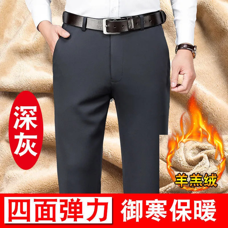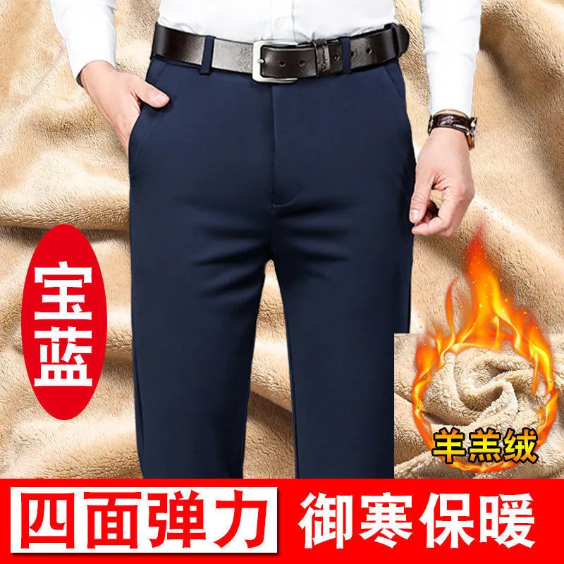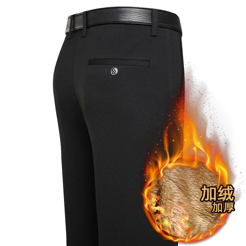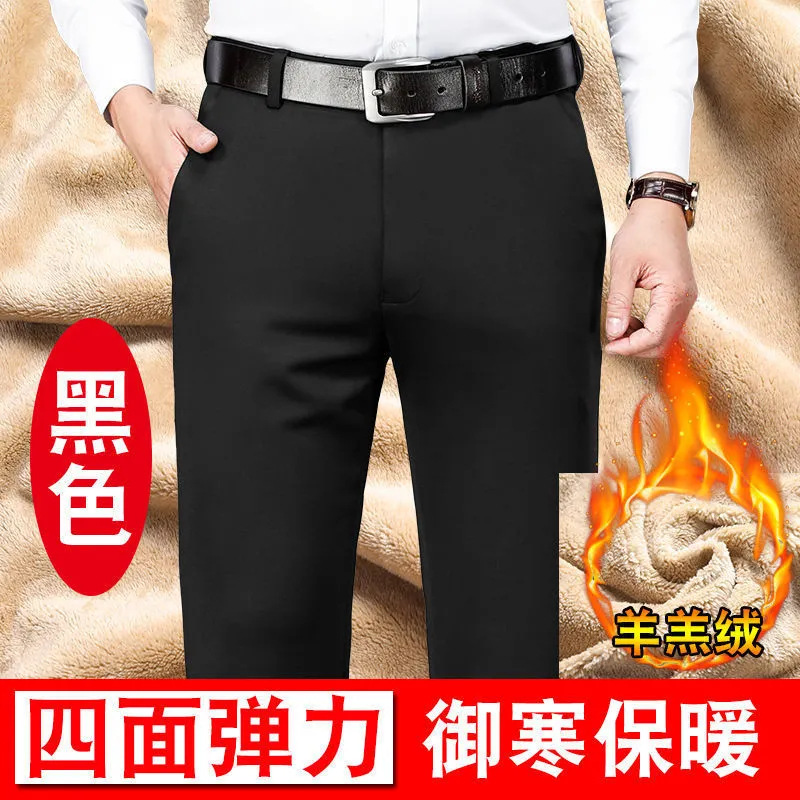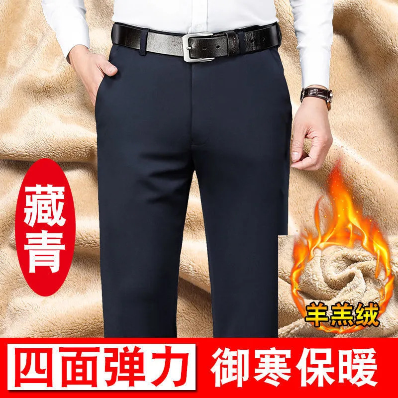 Зимние утолщенные мужские брюки из флиса из ягненка с высокой эластичной флисовой подкладкой, прямые брюки без глажки для папы, повседневные брюки среднего возраста