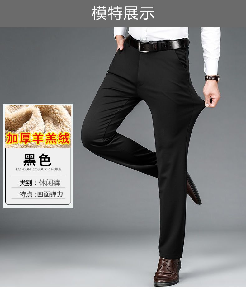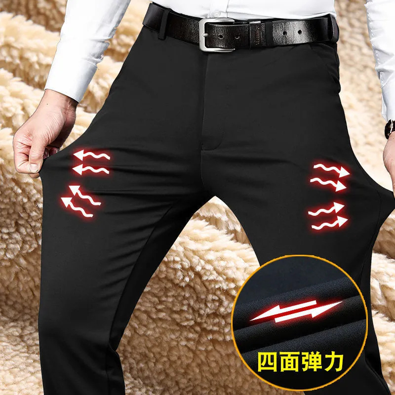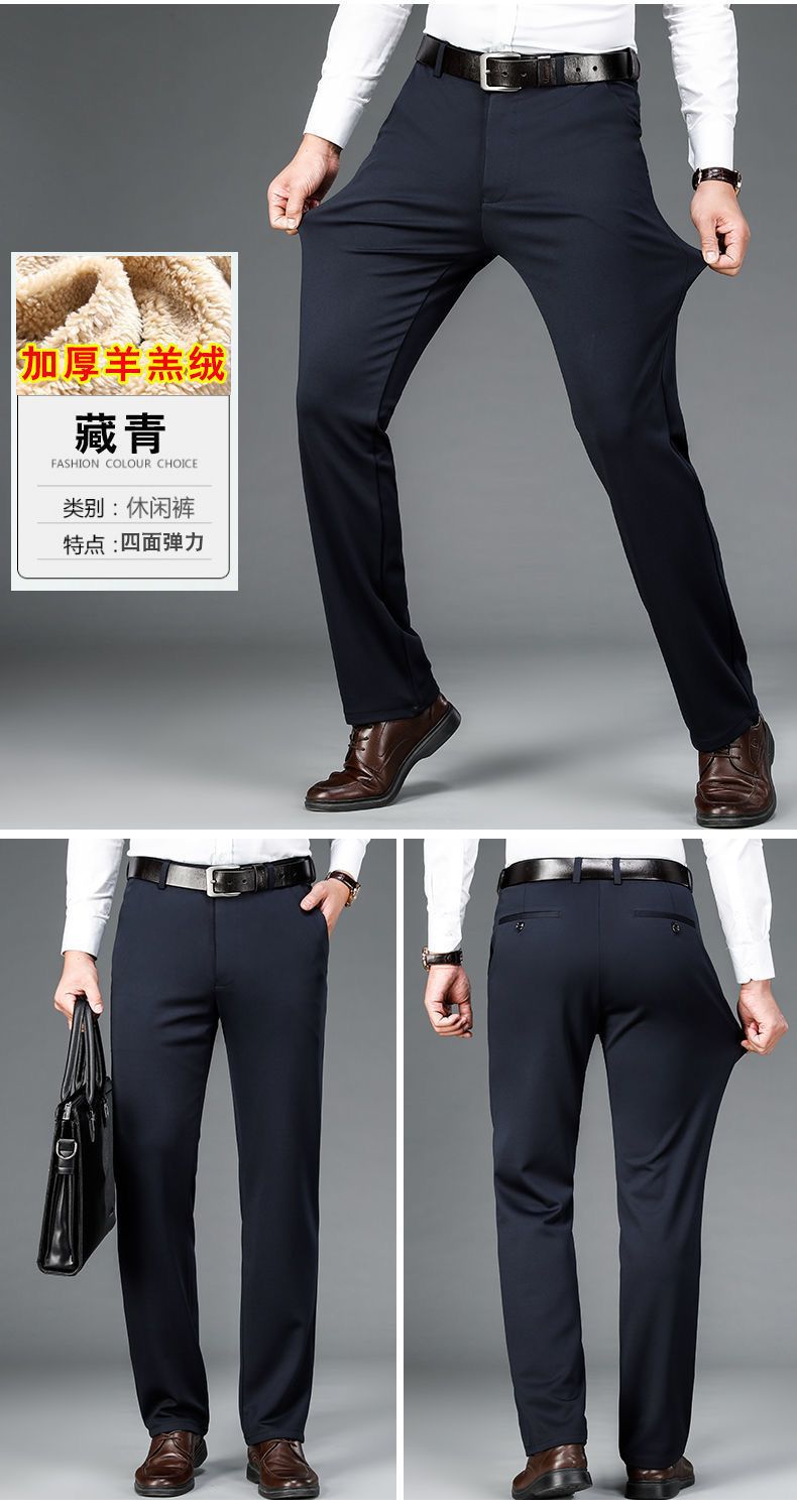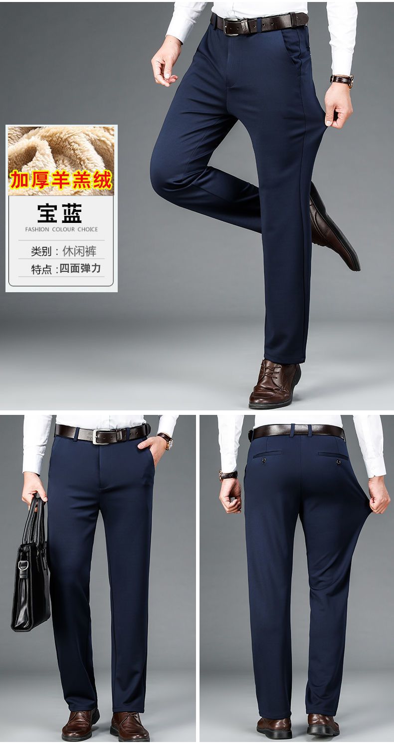 Зимние утолщенные мужские брюки из флиса из ягненка с высокой эластичной флисовой подкладкой, прямые брюки без глажки для папы, повседневные брюки среднего возраста