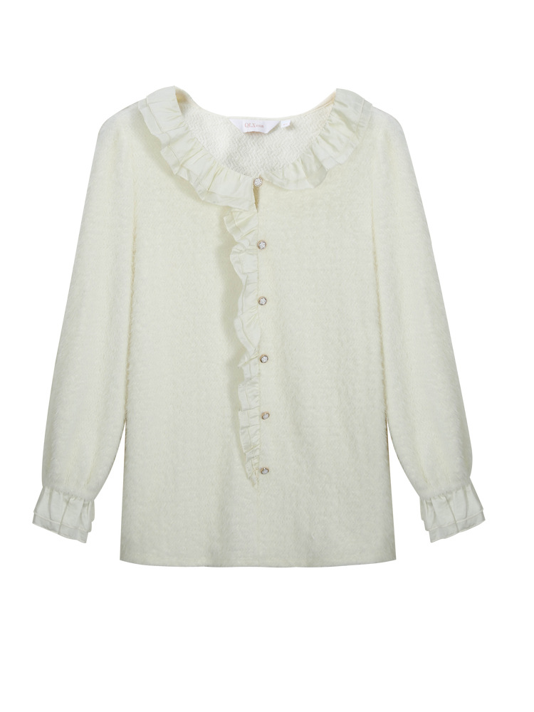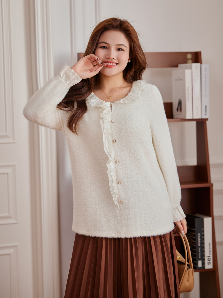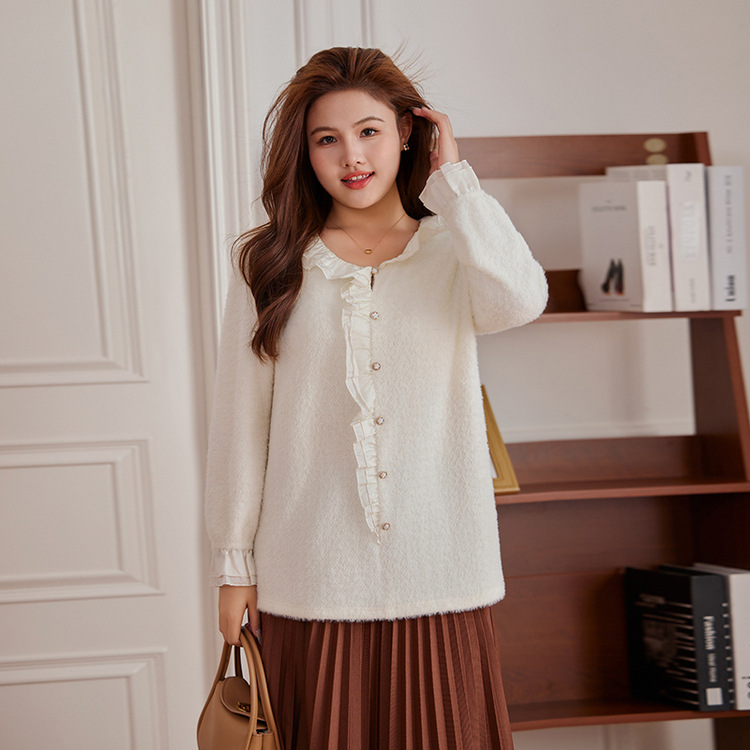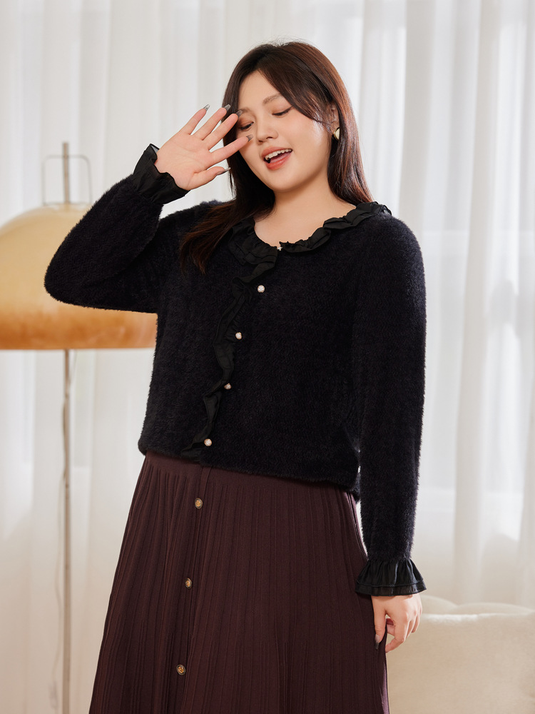 Тонкое шоу 2023 Зима Новая женская одежда больших размеров, пухлая девушка, Нежная Милая строчка, мягкий клейкий пуловер с рюшами, свитер