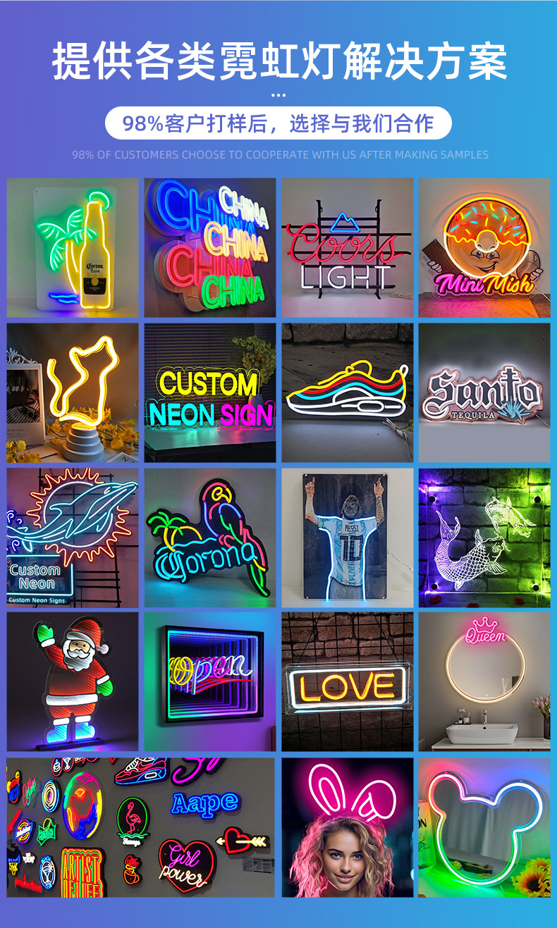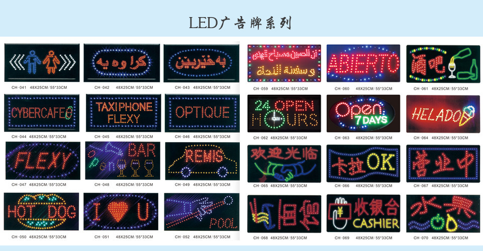 LED广告牌款式多样,尺寸有48*25cm,33*55cm,48*48cm等,广告牌均配有挂钩,悬挂很方便,电压交流110-240V,直流12V。均为高亮LED发光二极管,色彩绚丽,闪动方式多样,亦可根据客人要求制作闪动方式。也可来样来图定做