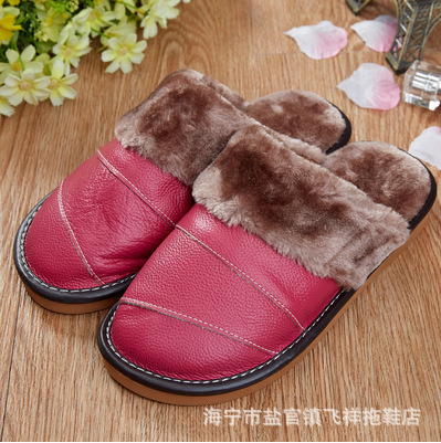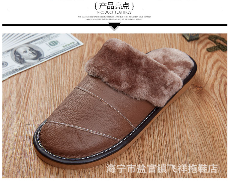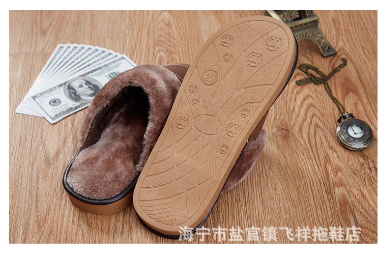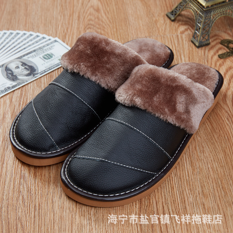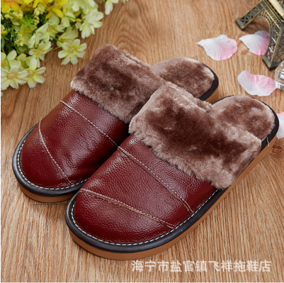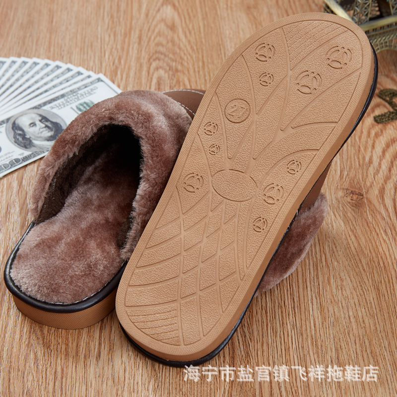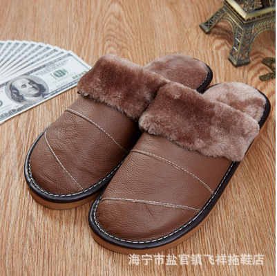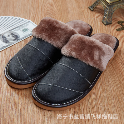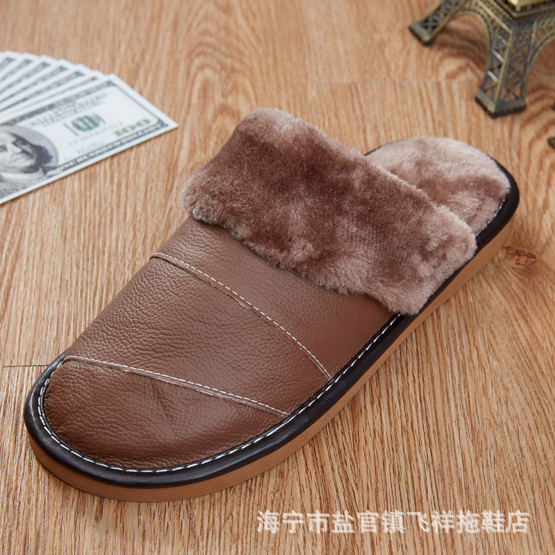Мужские большие тапочки из воловьей кожи с док-слоем, осенне-зимние женские теплые уличные тапочки на флисовой подкладке оптом с городской фабрики