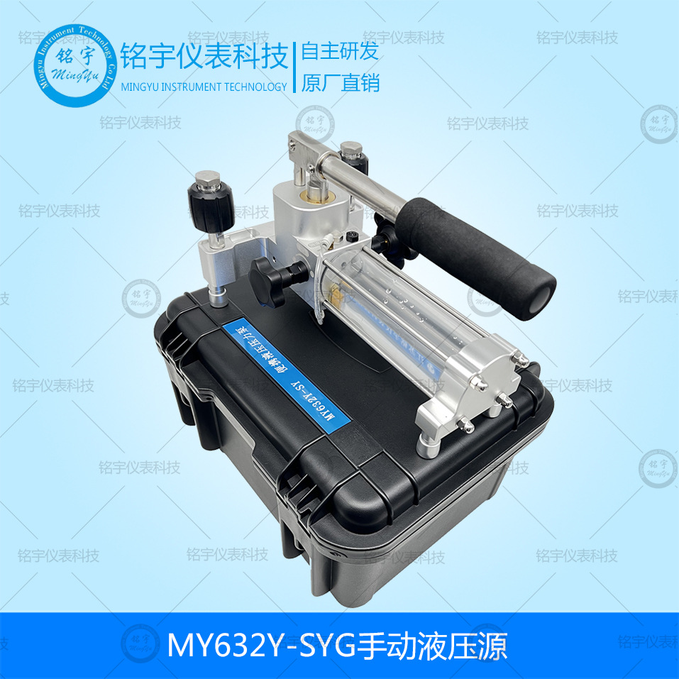 MY632Y-SYG手动液压源具有结构简单、操作省力、便于携带、不易泄漏、维护量极少的特点,它还可以产生微压,高压对于高压仪表的校验是它独有的优势。便携式高压压力源主要给实验室、工厂、大专院校理想的中档辅助工具表,并可作为中低压压力测试时为检定和校准一般压力表、精密压力表、压力变送器等提供稳定的压力源。手动液压源,传压介质为油及纯净水。本产品选用优质进口不锈钢,国外先进的密封技术,经过多种加工工艺精制而成。采用开放式结构,更便于维护;螺旋式升降压,升降压平稳,压力瞬间即可稳定,回程检定极易操作。便携式高压压力源适宜于:在校验压力变送器、压力传感、精密(普通)压力表等其它压力仪器仪表时提供稳定、快捷、安全可靠的超高压压力源。主要用于电力、食品卫生、航空航天、军工、冶金、计量等行业。