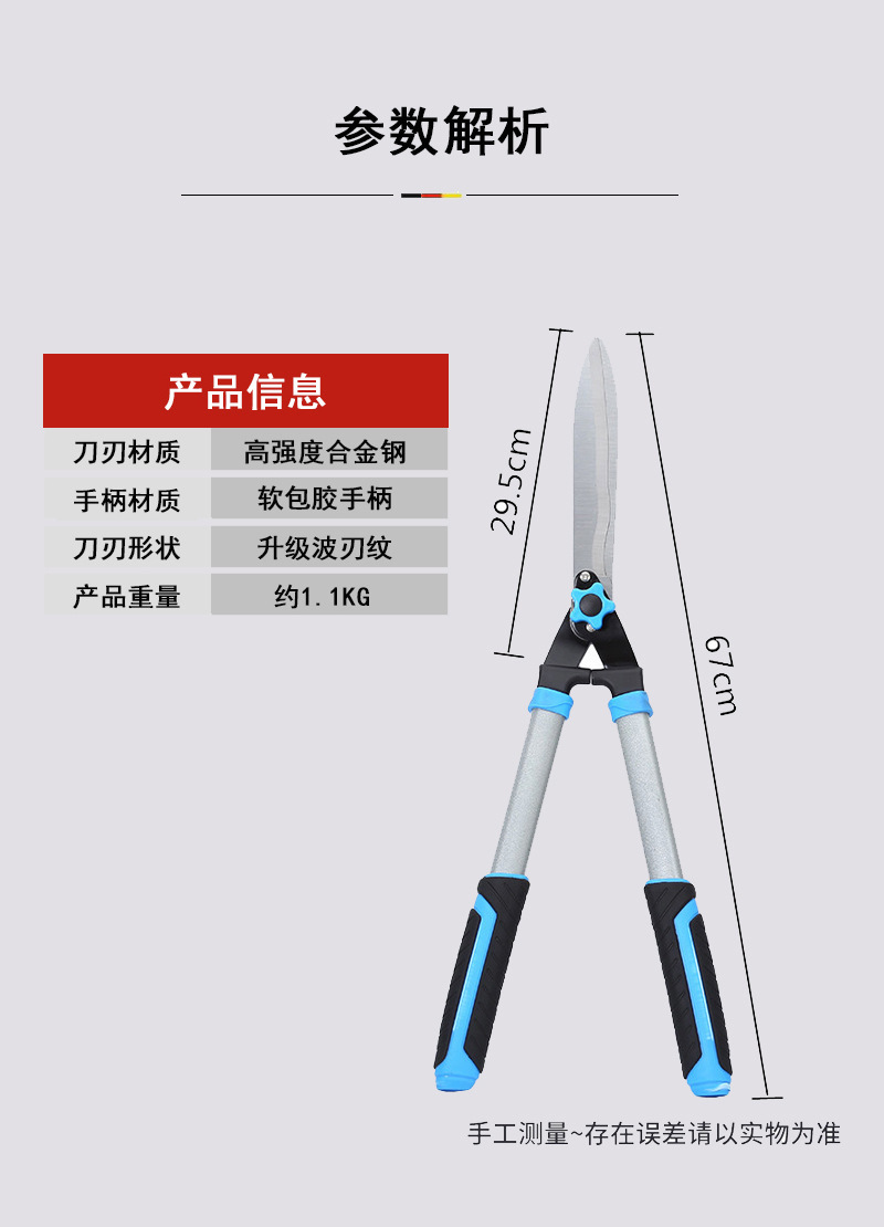 2.65锰钢刀头整体热处理,硬度高,锋利好剪。软胶防滑把手,握感舒适。