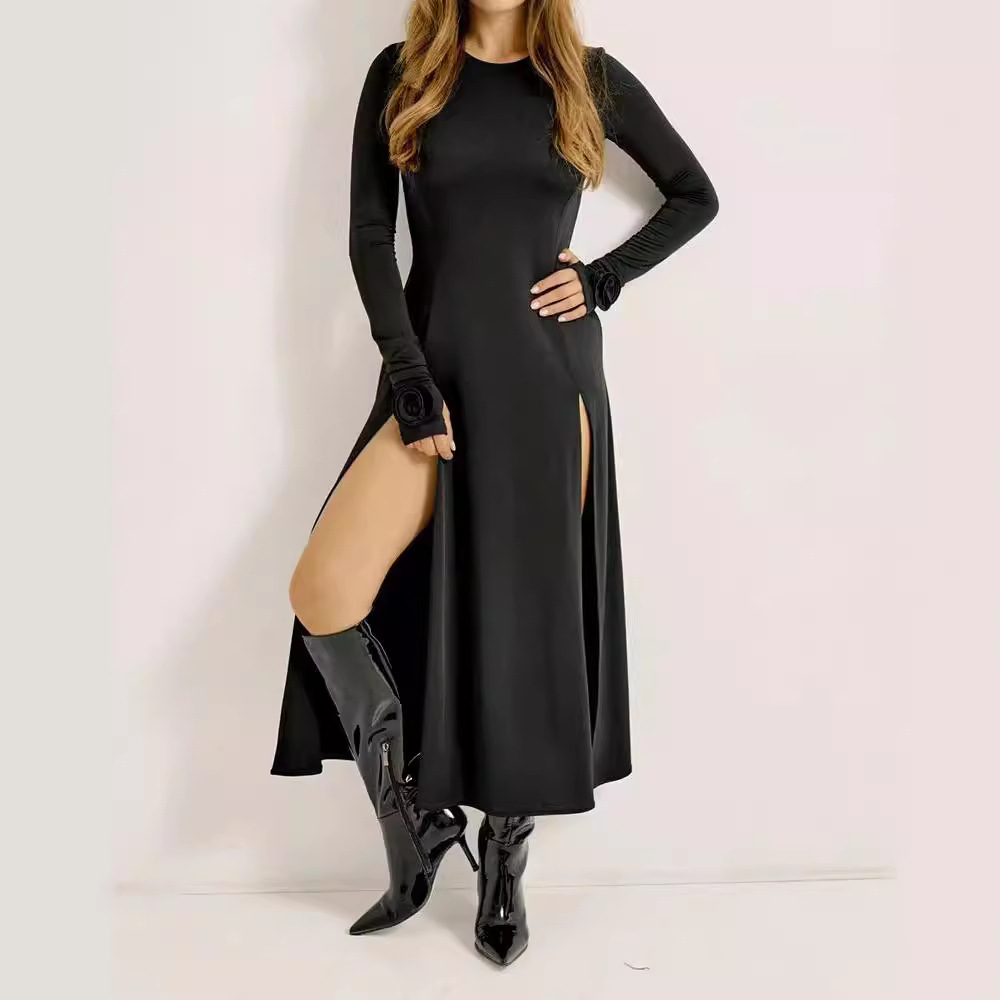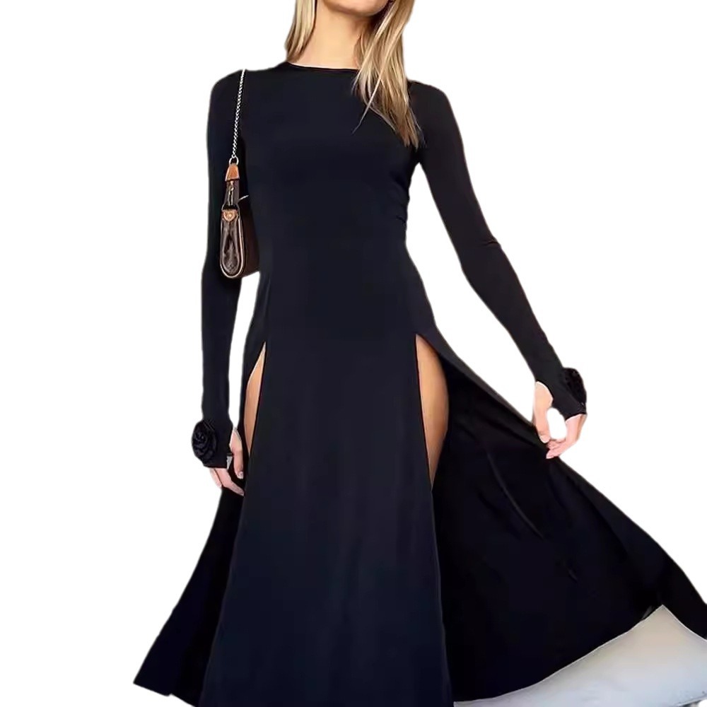 В наличии независимая станция Amazon трансграничная горячая Распродажа Весна и осень новое однотонное сексуальное приталенное платье с круглым вырезом и разрезом