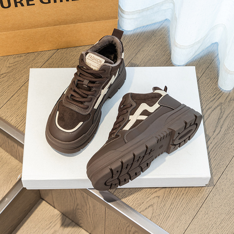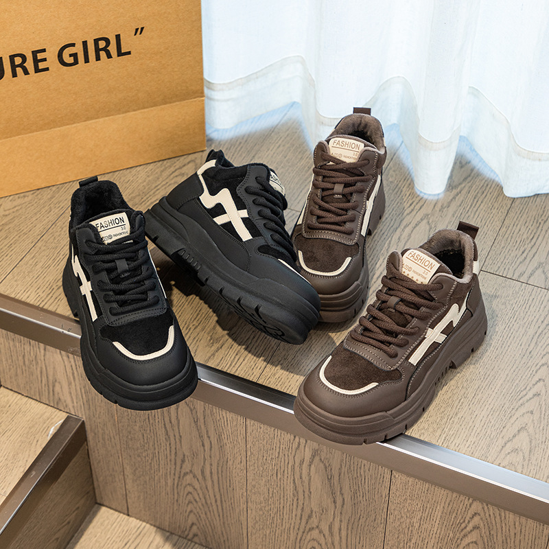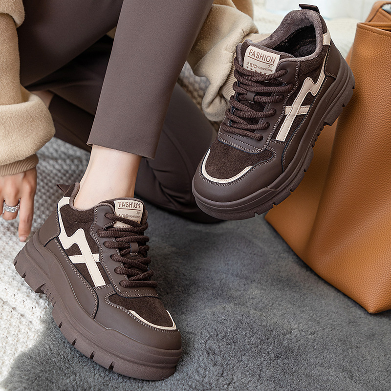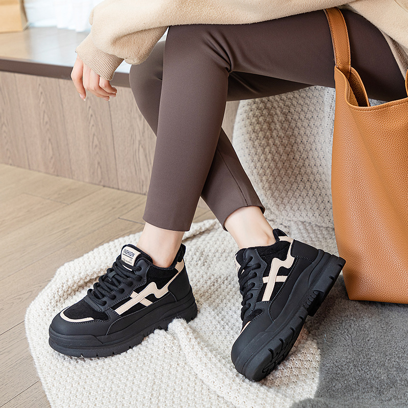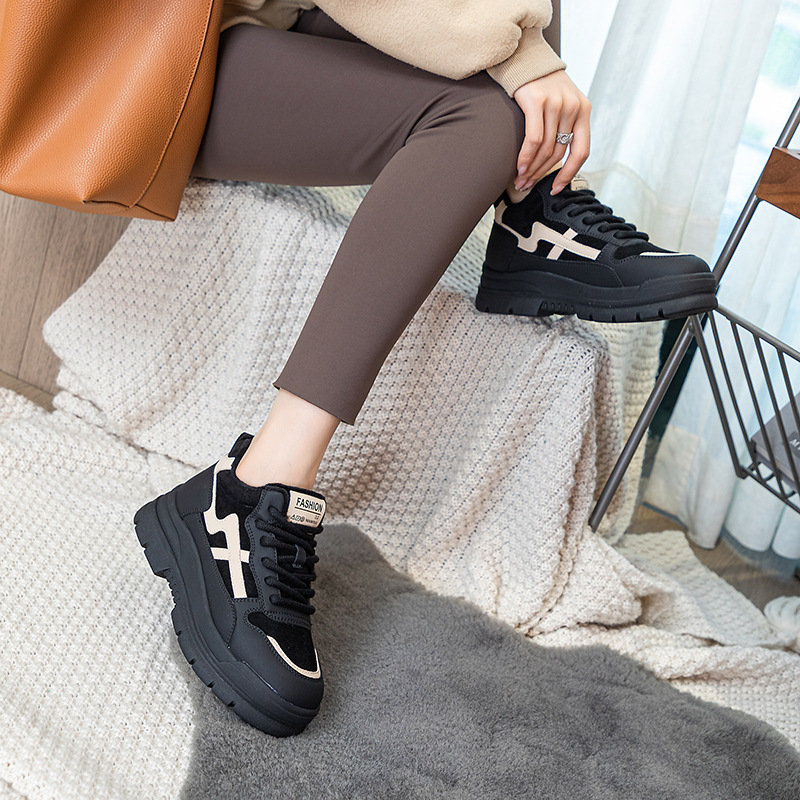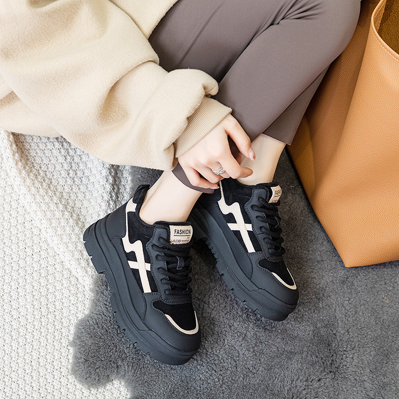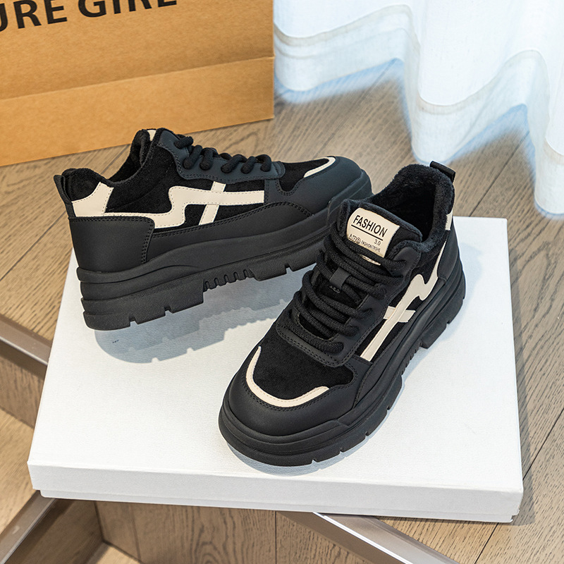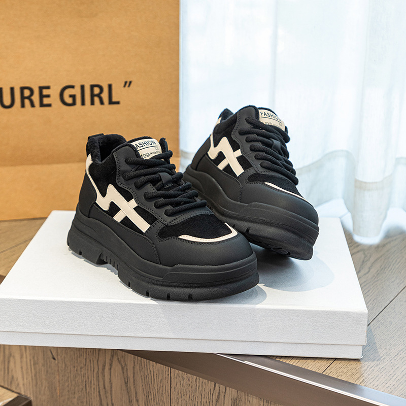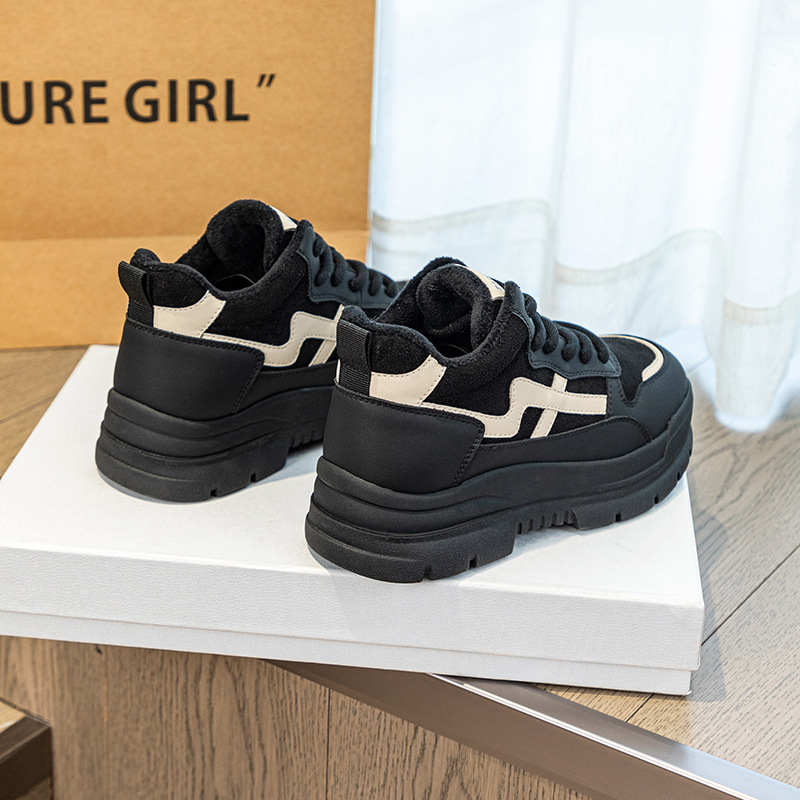 Высокие туфли на флисовой подкладке, женские туфли на хлопковой подкладке, зимние Нескользящие повседневные кроссовки в Корейском стиле с круглым носком и кожаной платформой, 2023