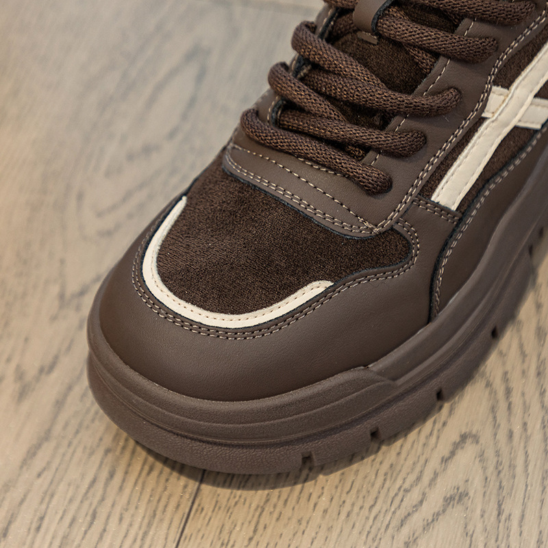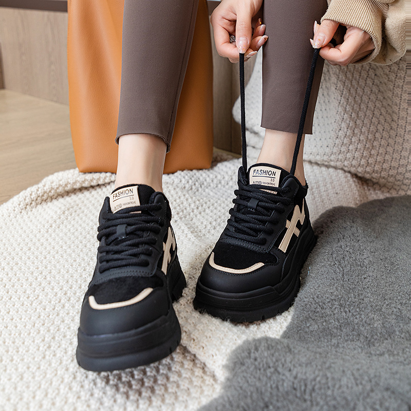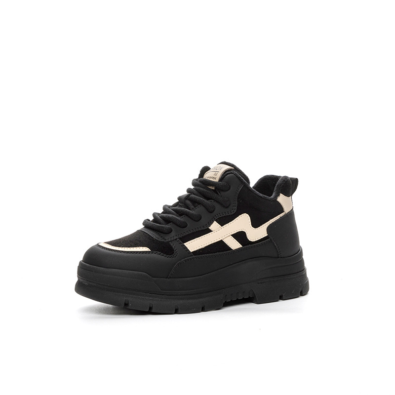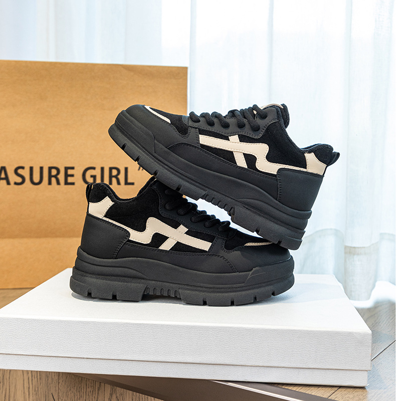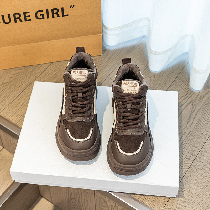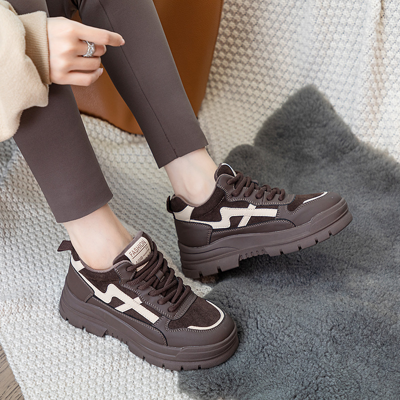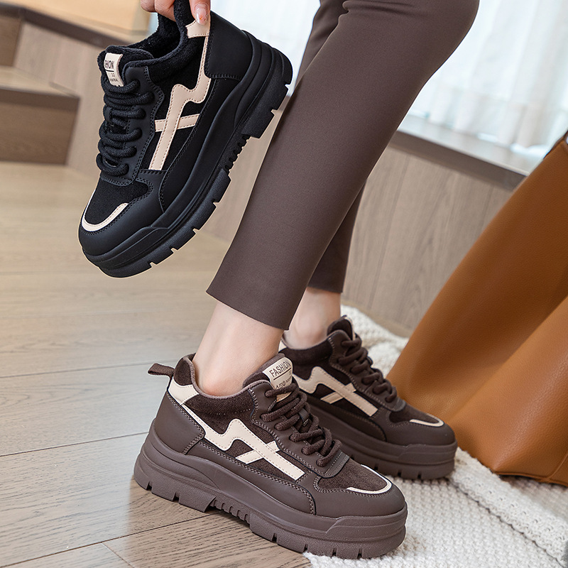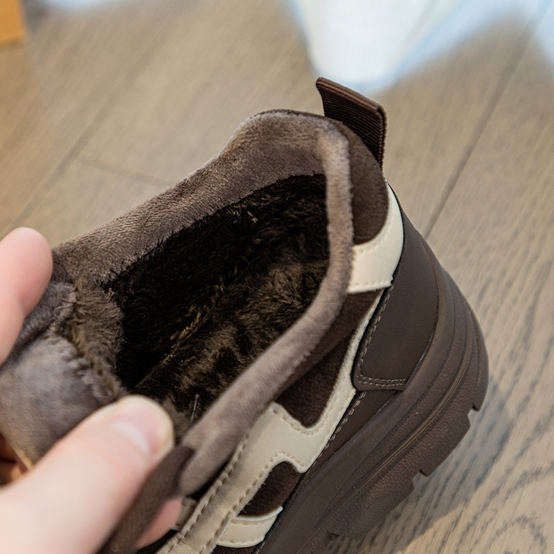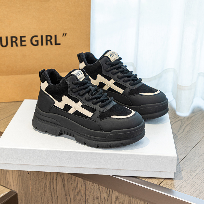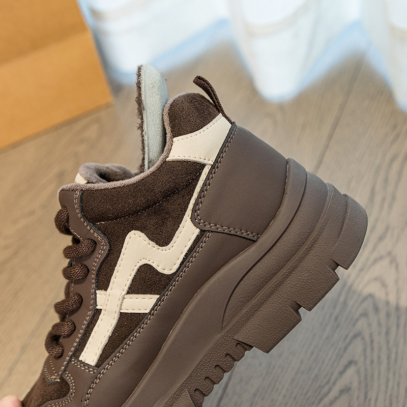 Высокие туфли на флисовой подкладке, женские туфли на хлопковой подкладке, зимние Нескользящие повседневные кроссовки в Корейском стиле с круглым носком и кожаной платформой, 2023