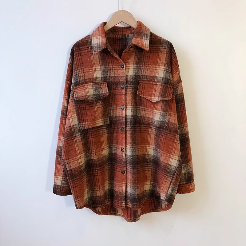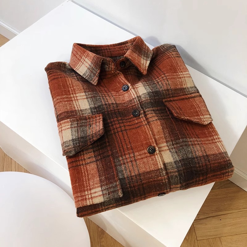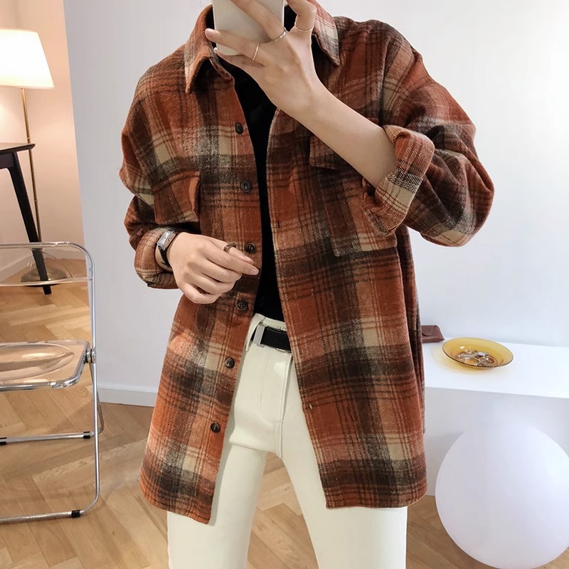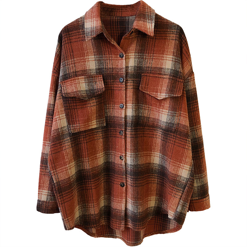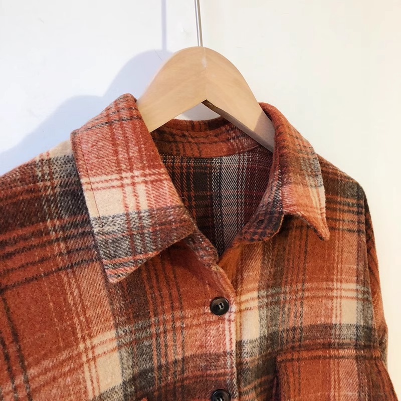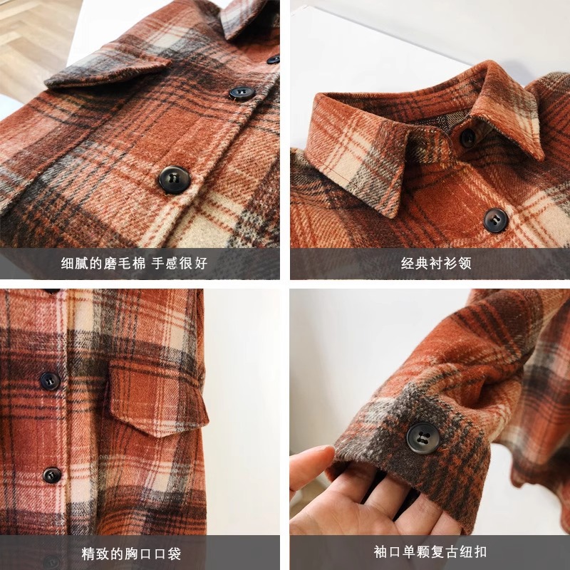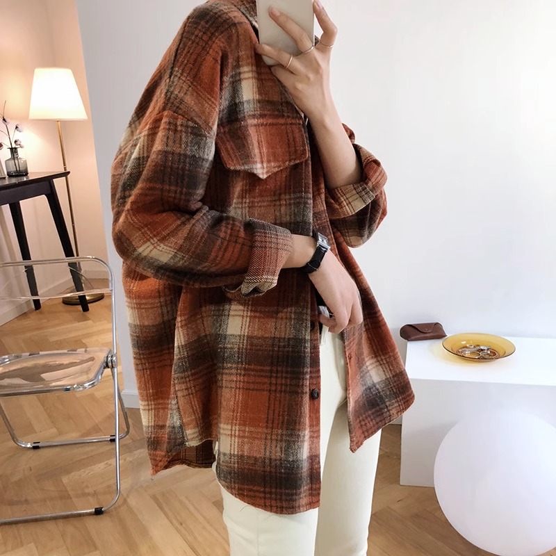 Рубашка в клетку из матового хлопка Женская средней длины 2023 осень новая свободная рубашка с длинным рукавом в Корейском стиле пальто толстая