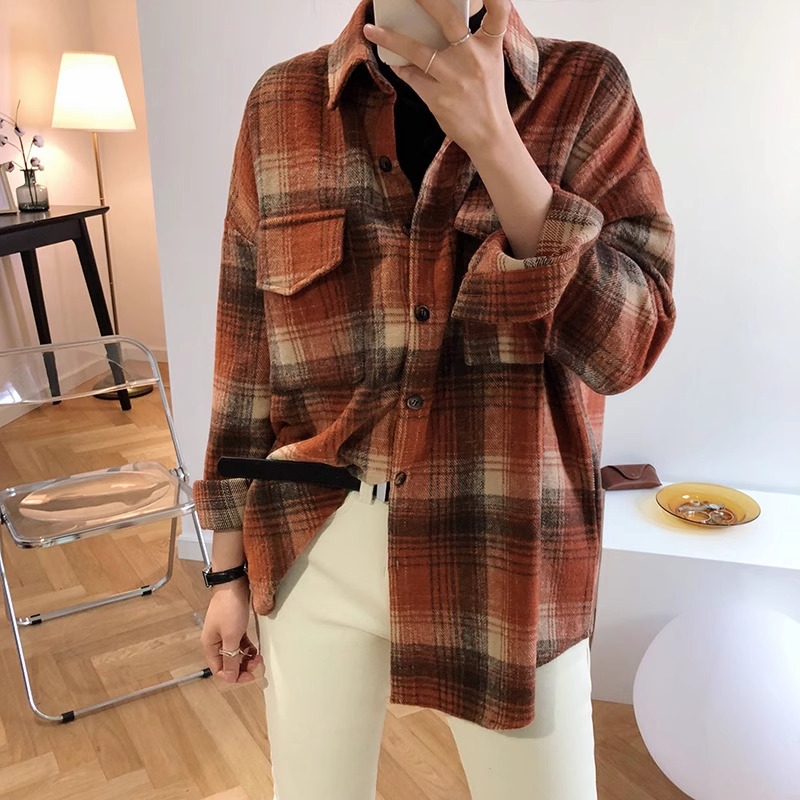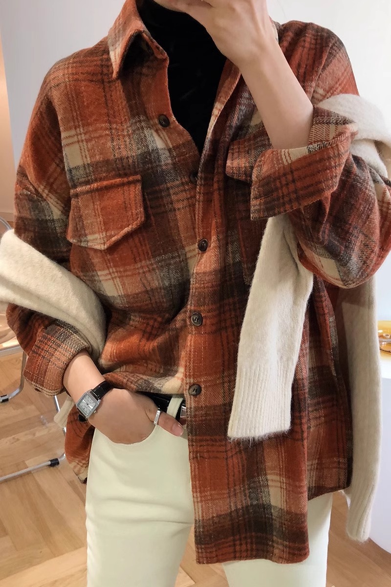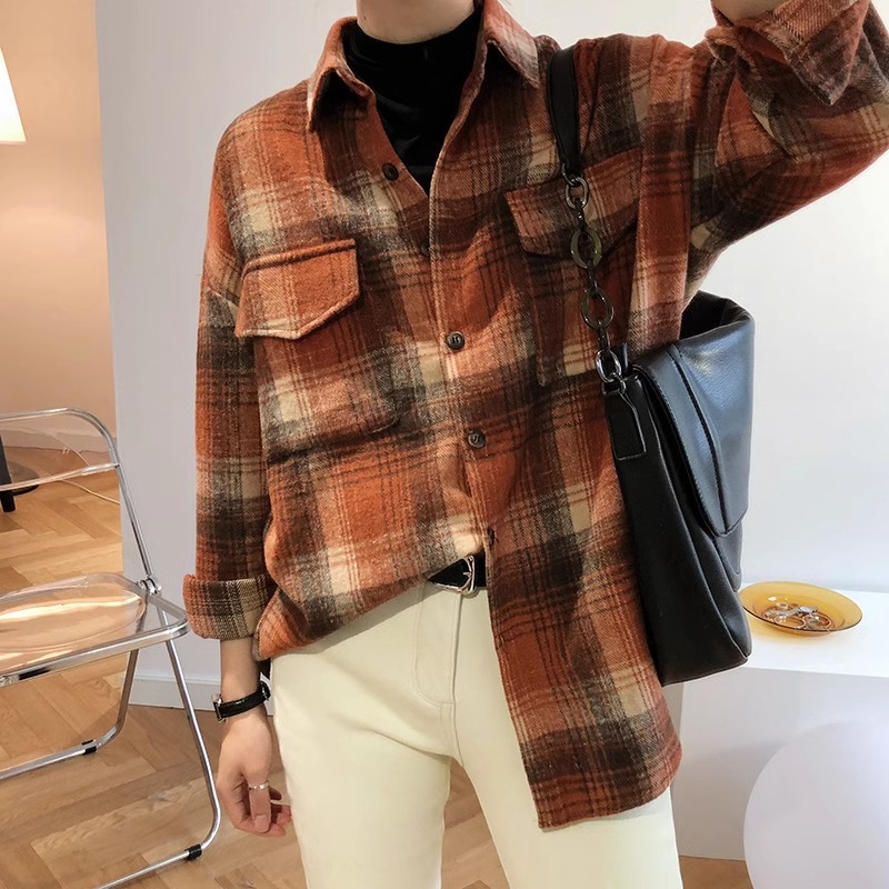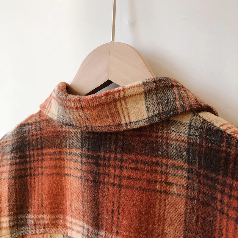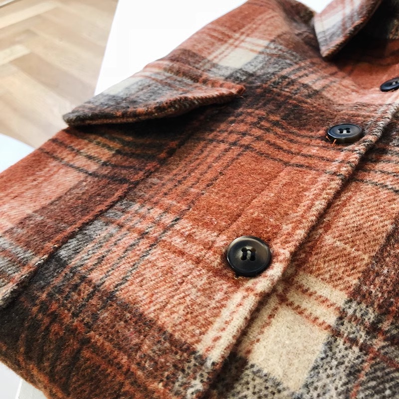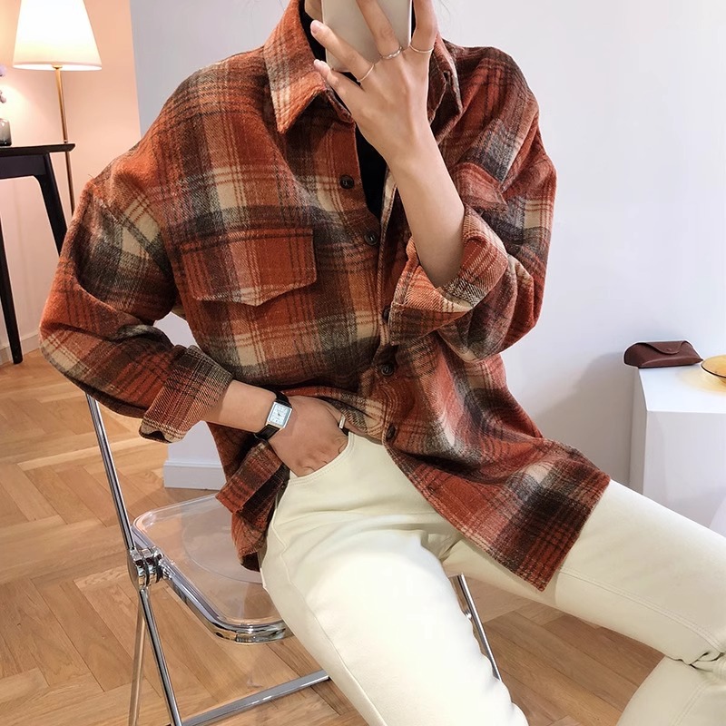 Рубашка в клетку из матового хлопка Женская средней длины 2023 осень новая свободная рубашка с длинным рукавом в Корейском стиле пальто толстая