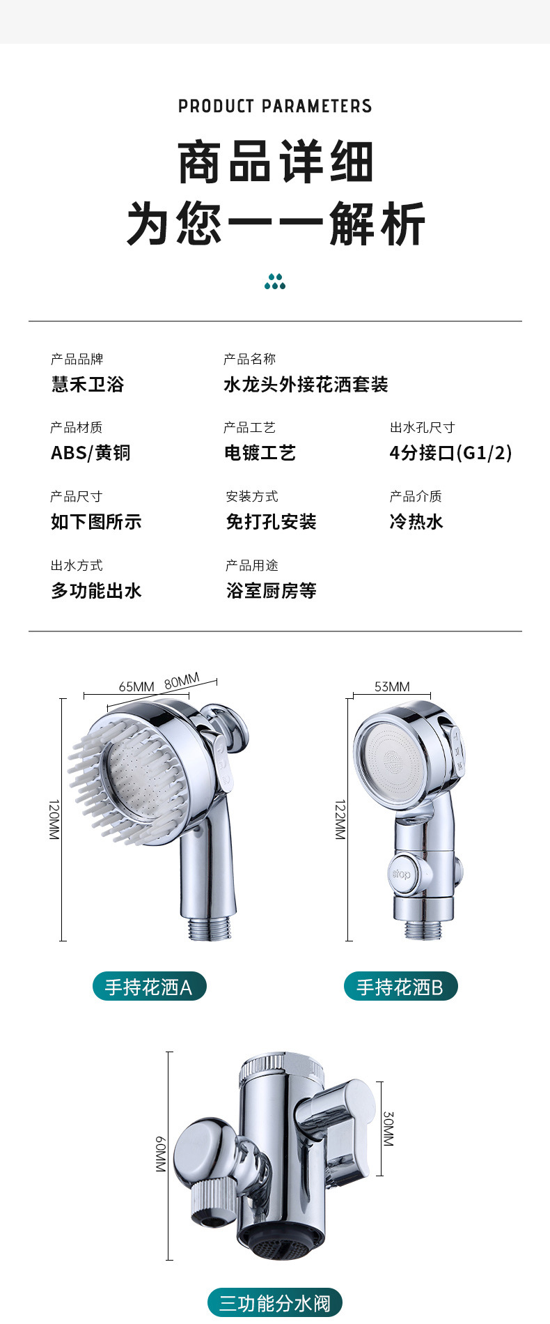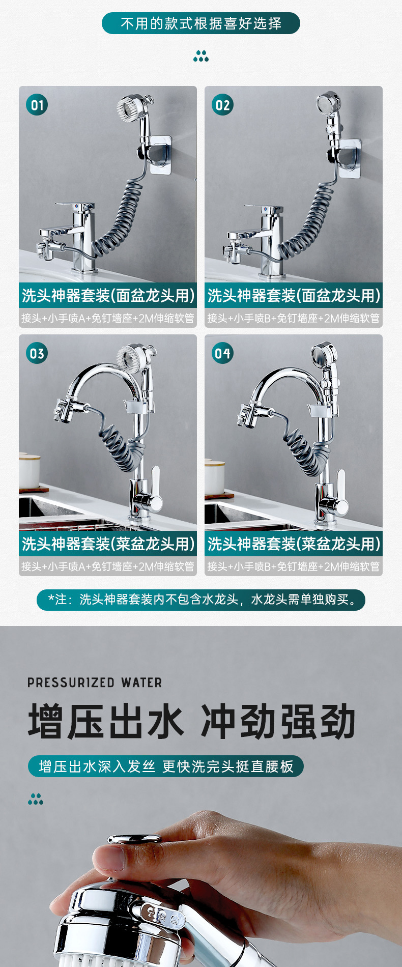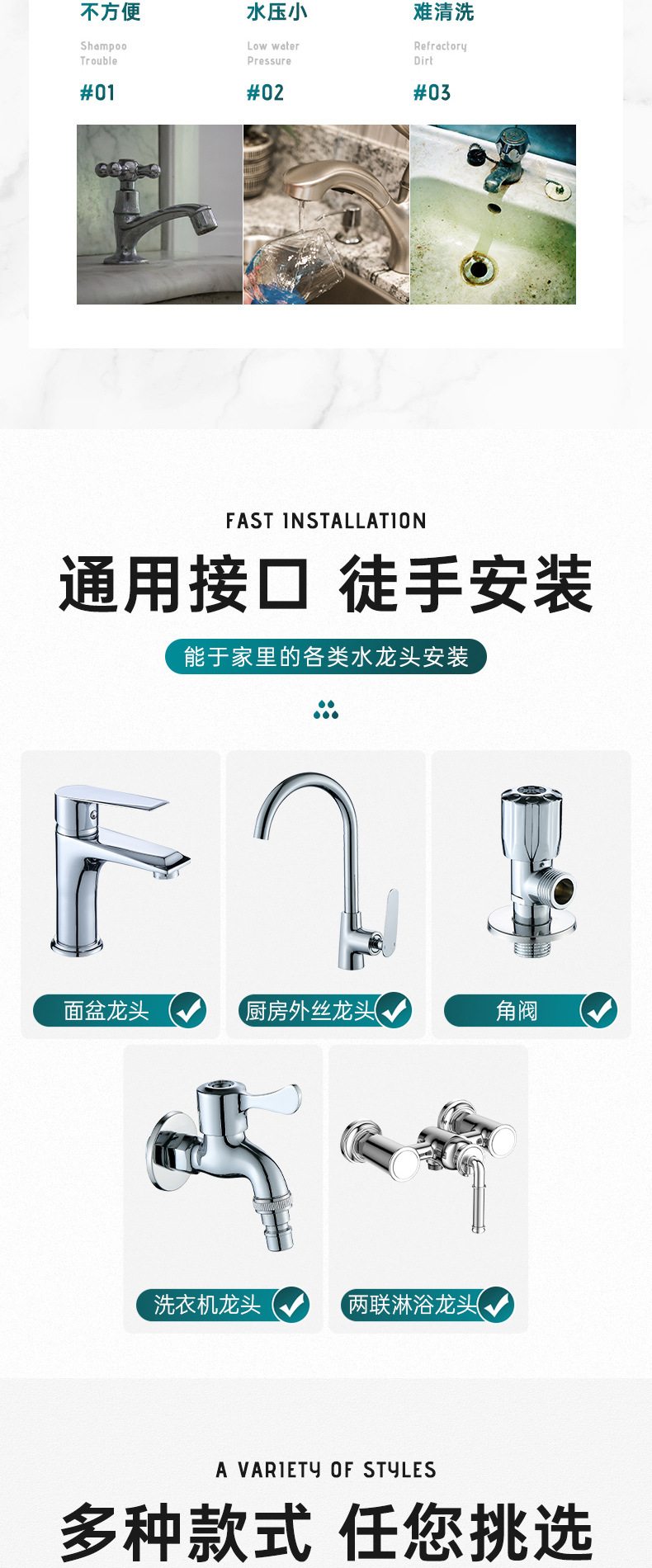 Смеситель для раковины (с массажной насадкой); Смеситель для раковины типа B (с трехскоростной форсункой); Одноместный массаж руля насадка; Одинарная трехступенчатая насадка для остановки воды одним щелчком мыши