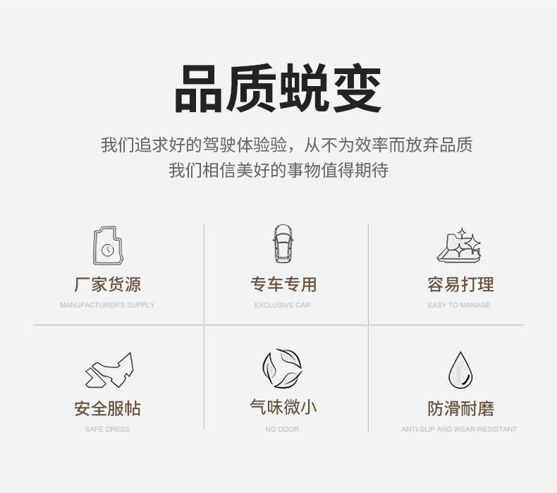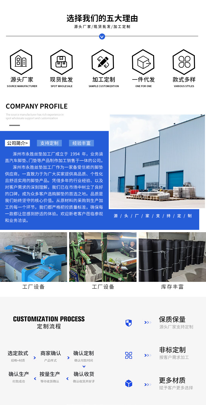 我们的通用款脚垫能做到黄金审美标准。专车订制款有市场在售车型同步的版型图库。99%的车型可做。可定制原厂卡扣,刺绣LOGO。