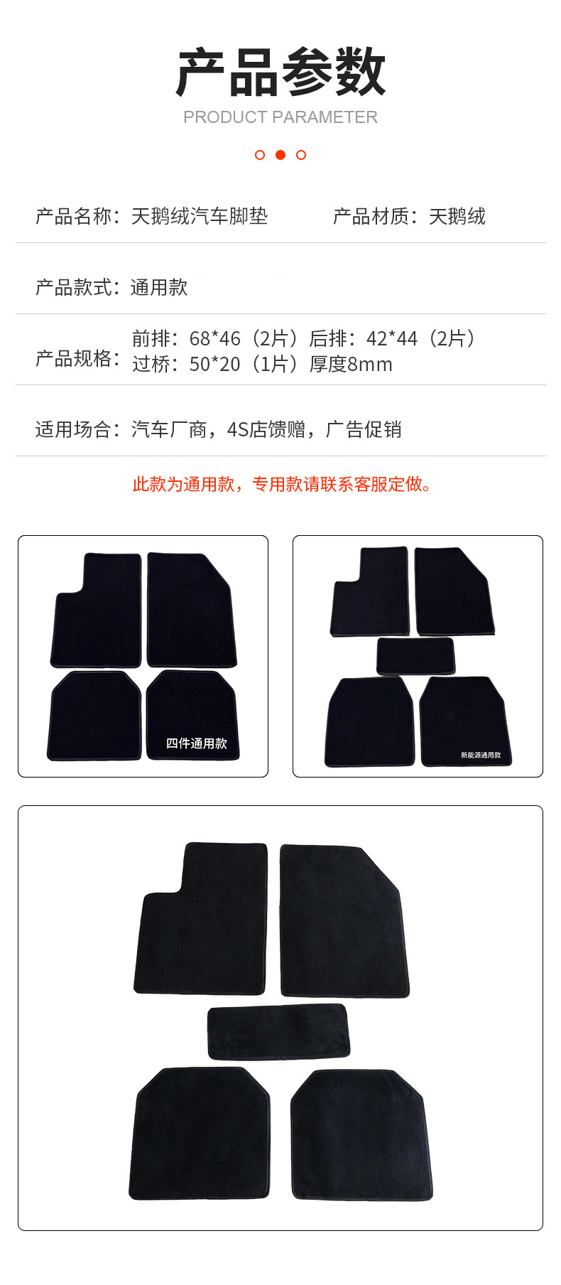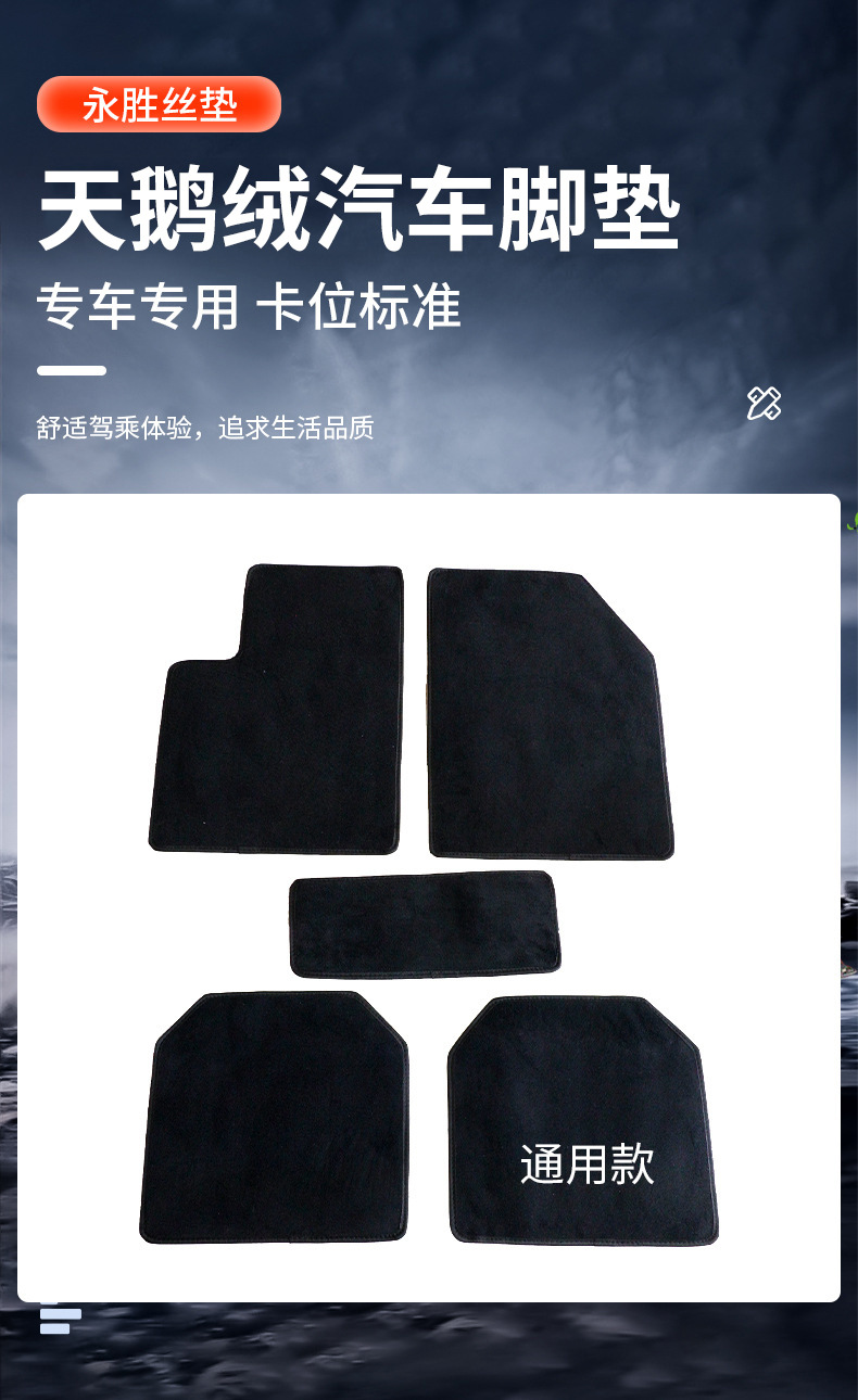本厂生产的天鹅绒汽车脚垫,可与原厂装饰配套,吸音、吸水,吸尘,铺装服贴,质优价廉,是4S店、车厂赠送礼品的首选产品。