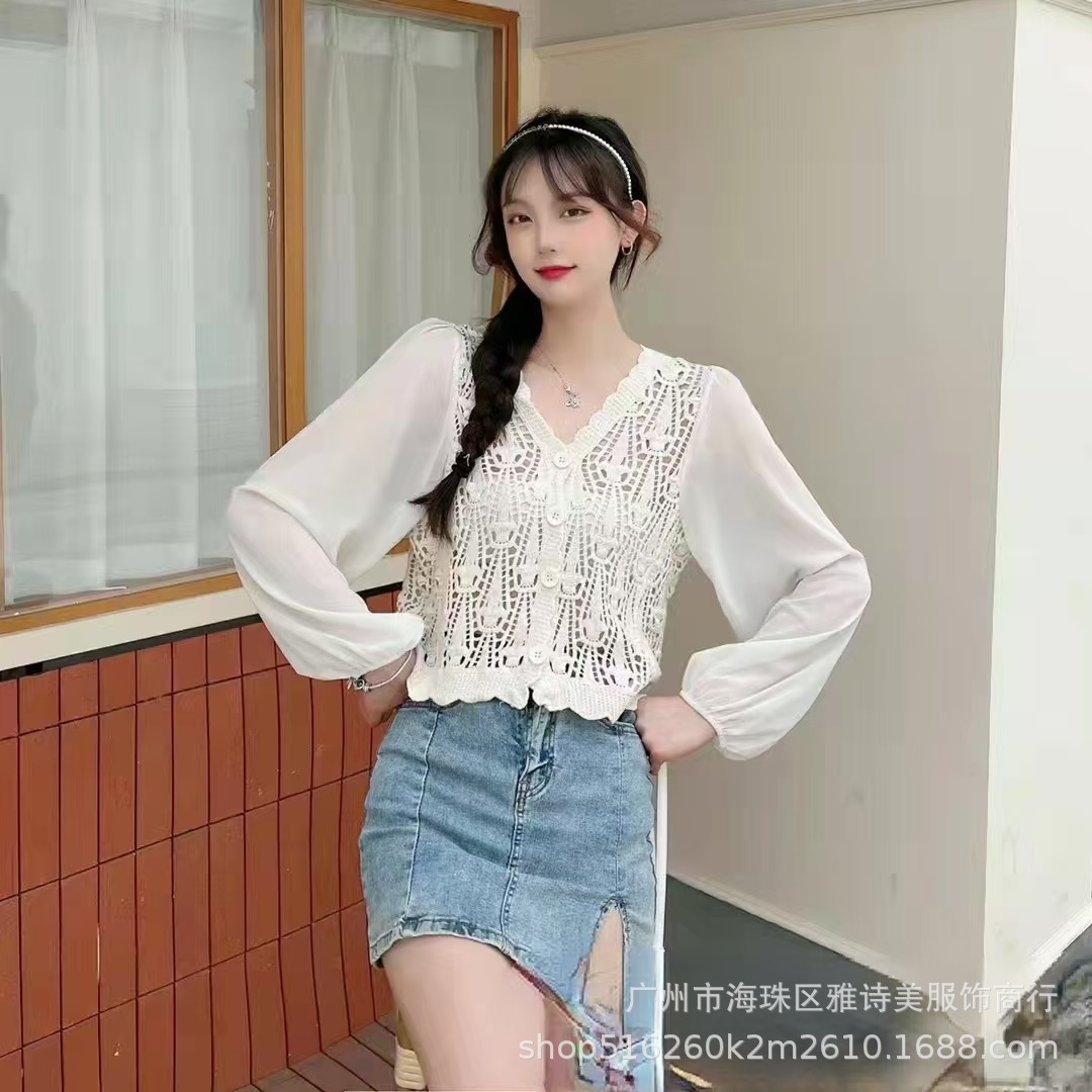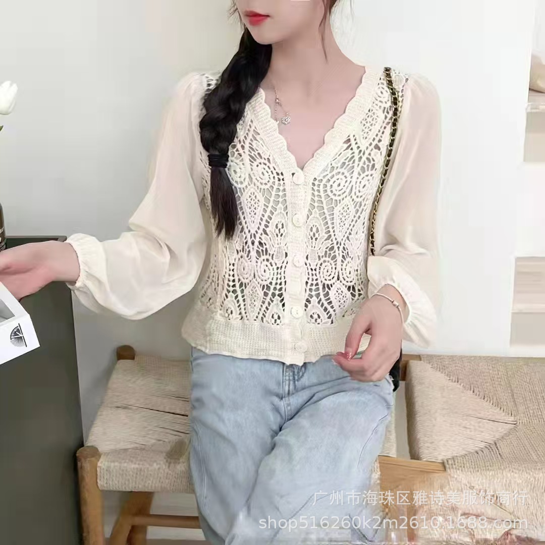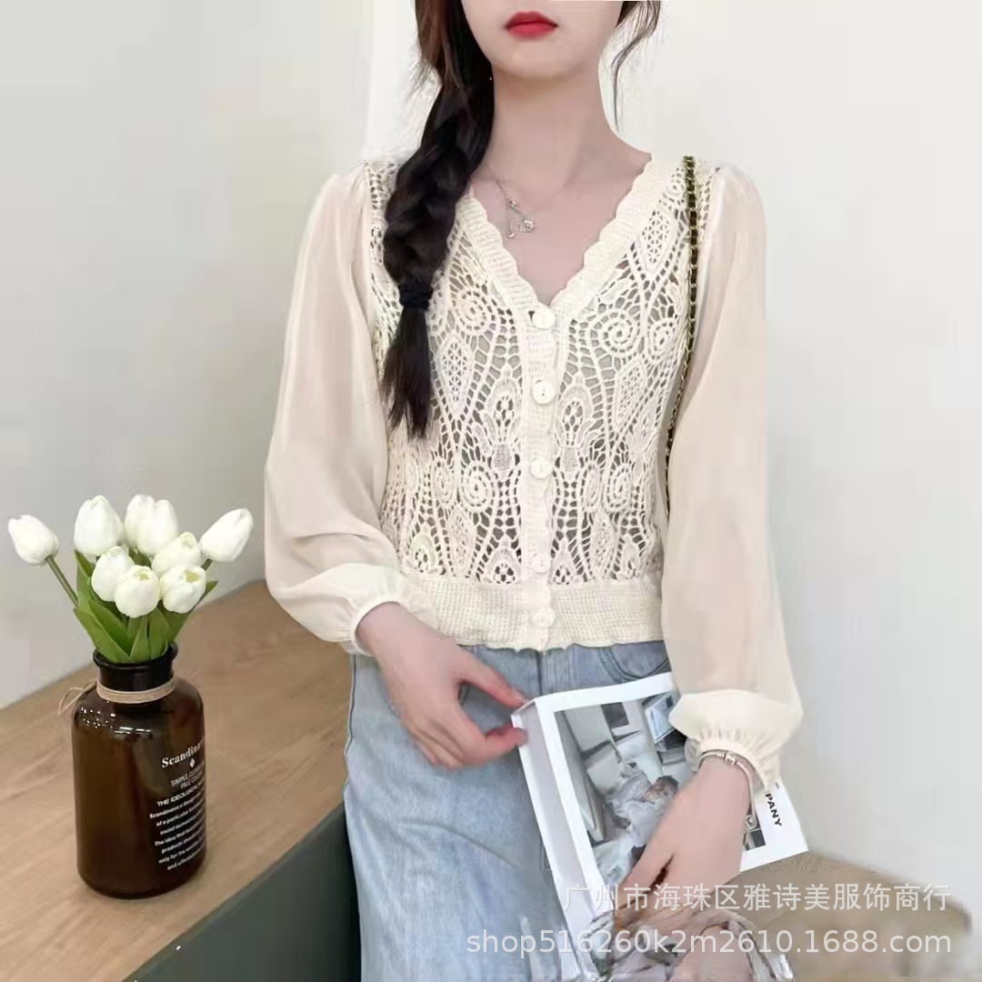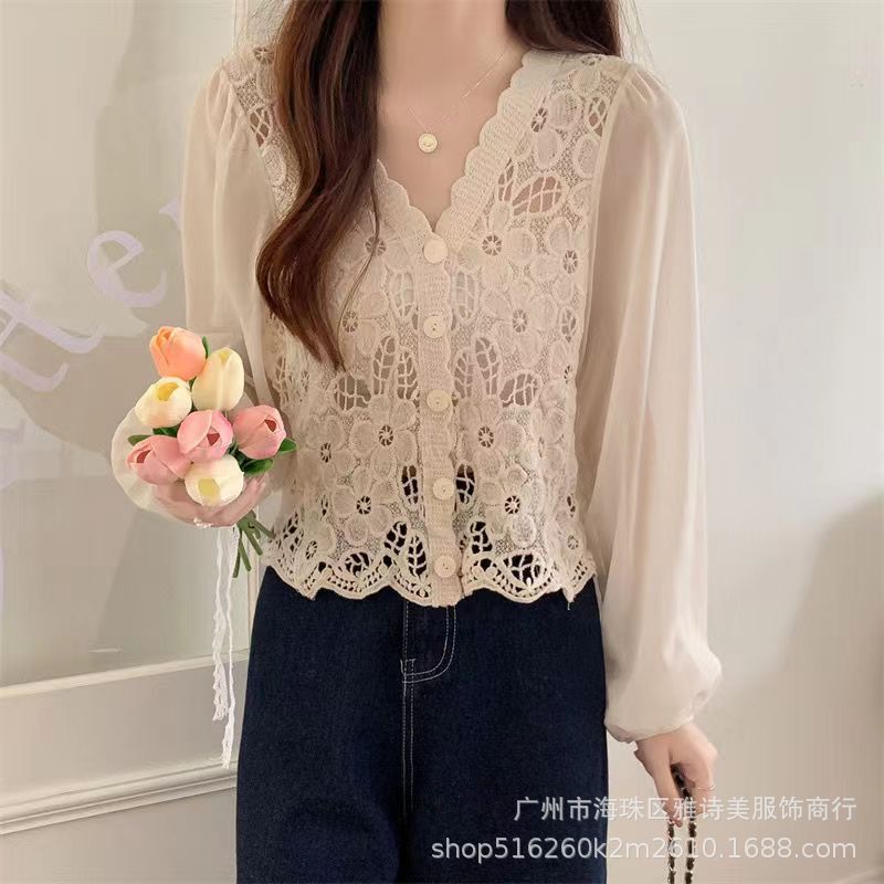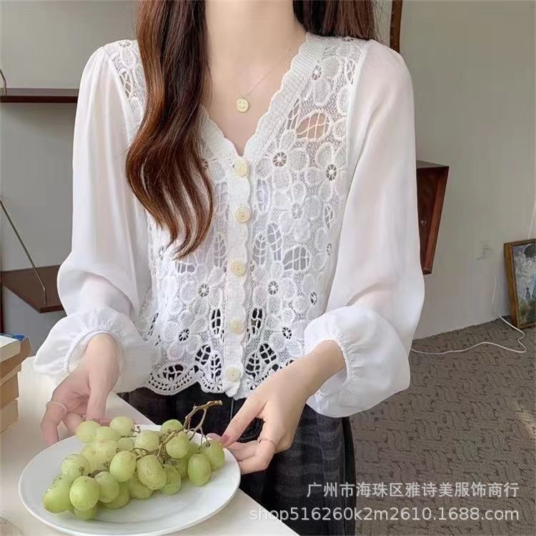 Осенний новый супер Сказочный темперамент ниша шить шифоновый кружевной полый корейский стиль с длинным рукавом и V-образным вырезом Модный женский топ