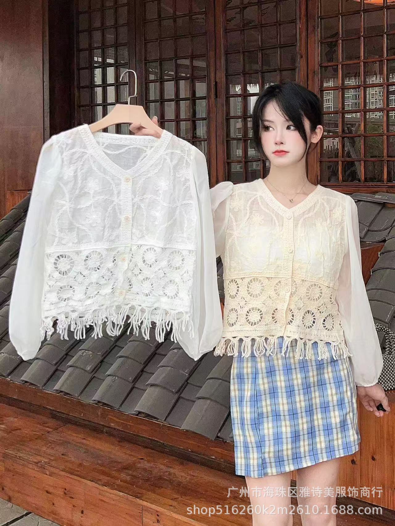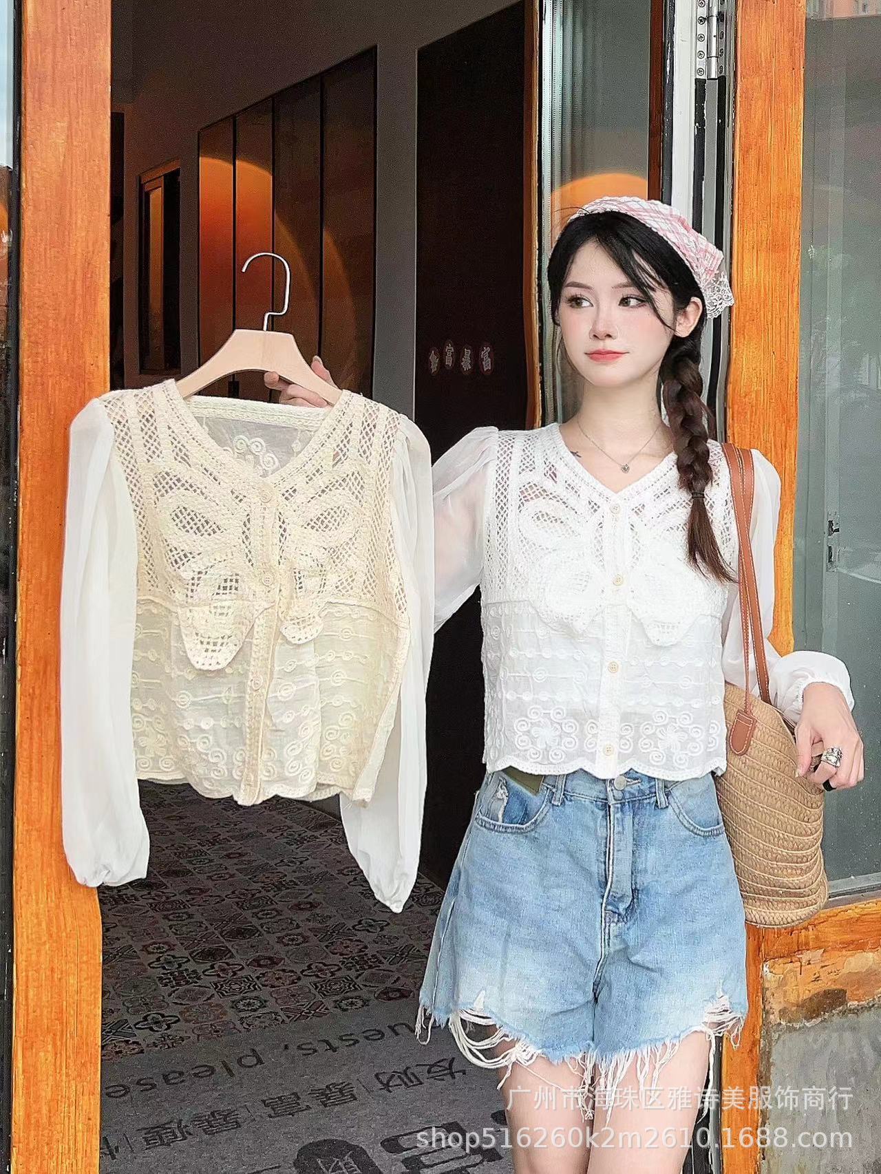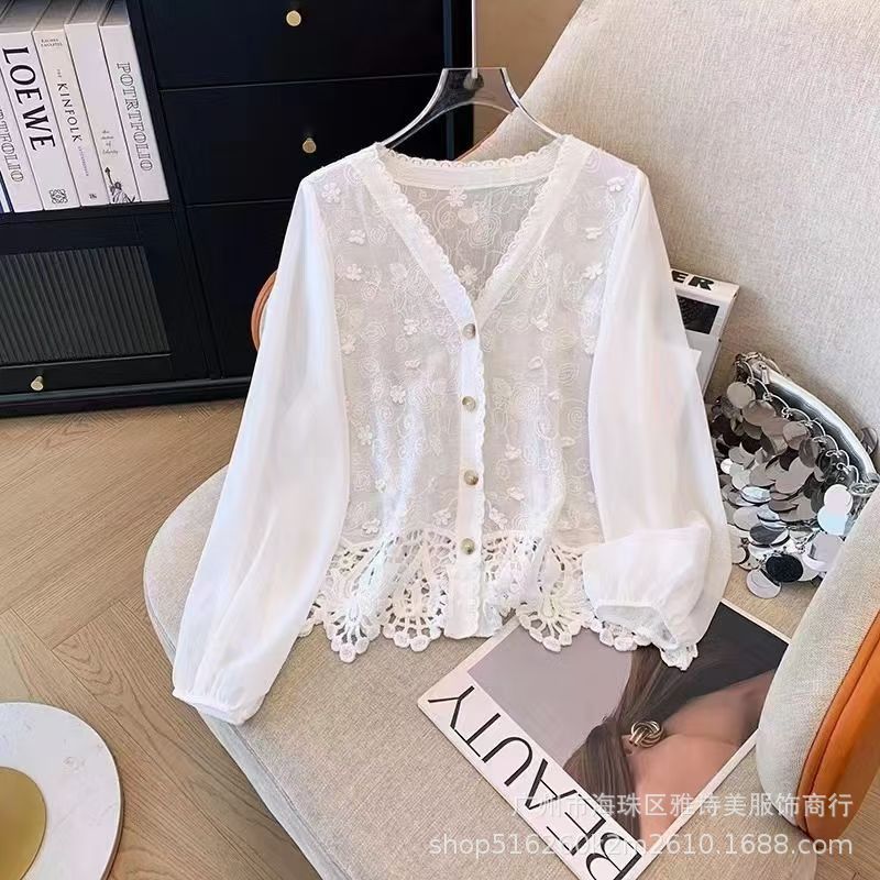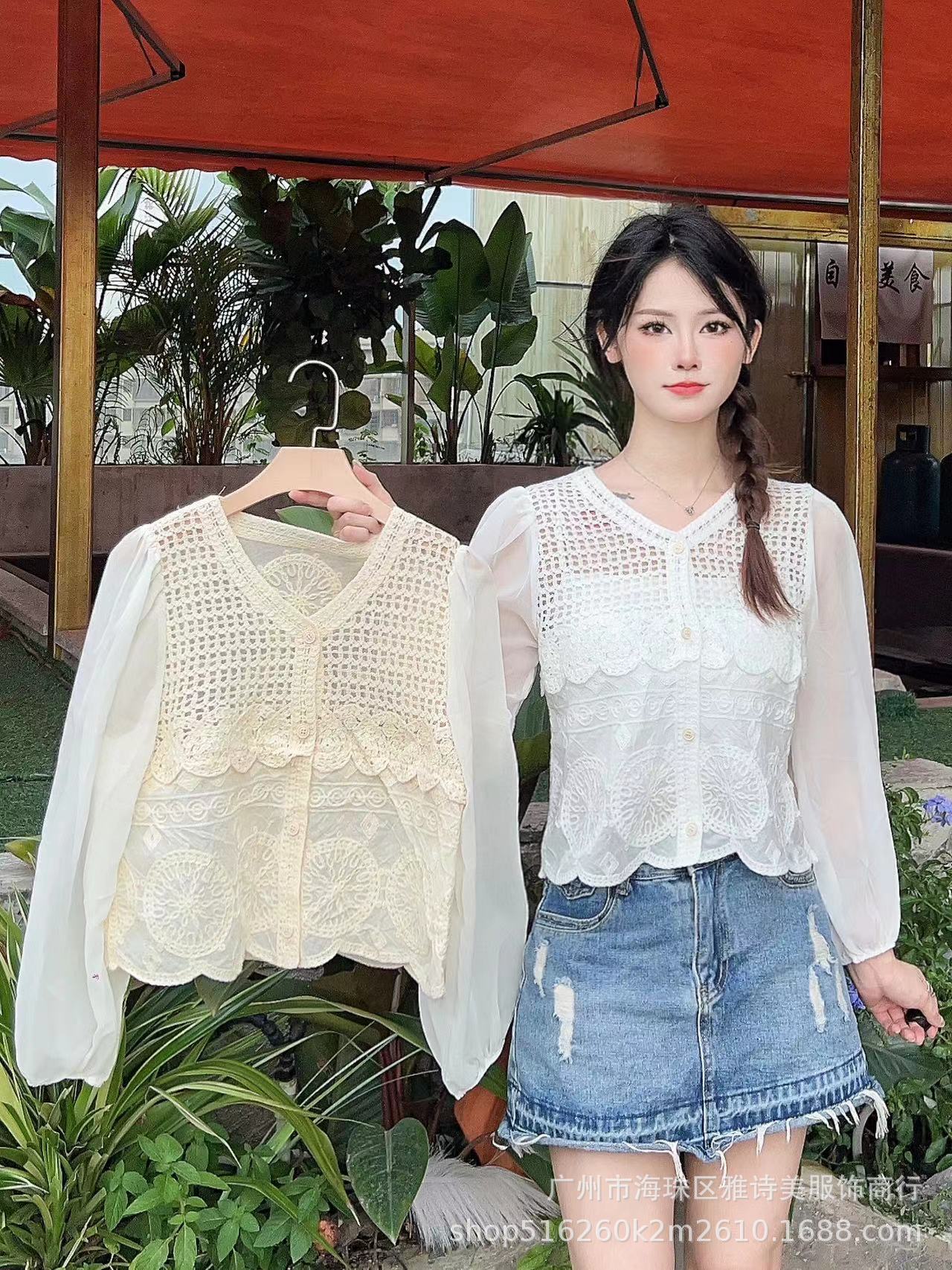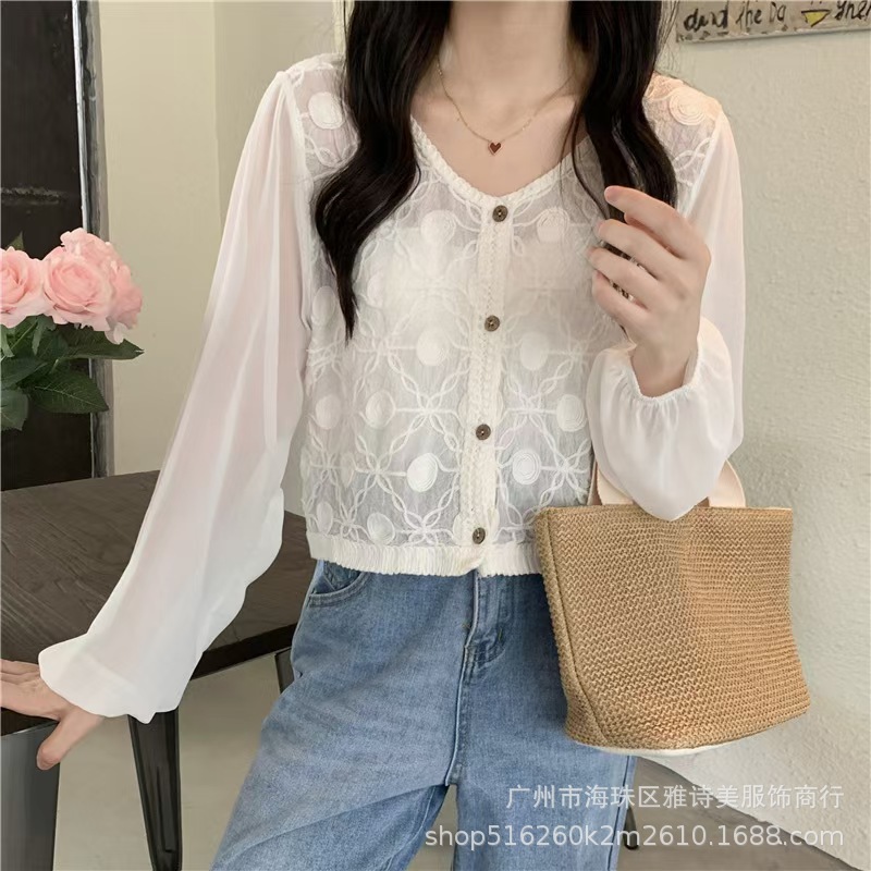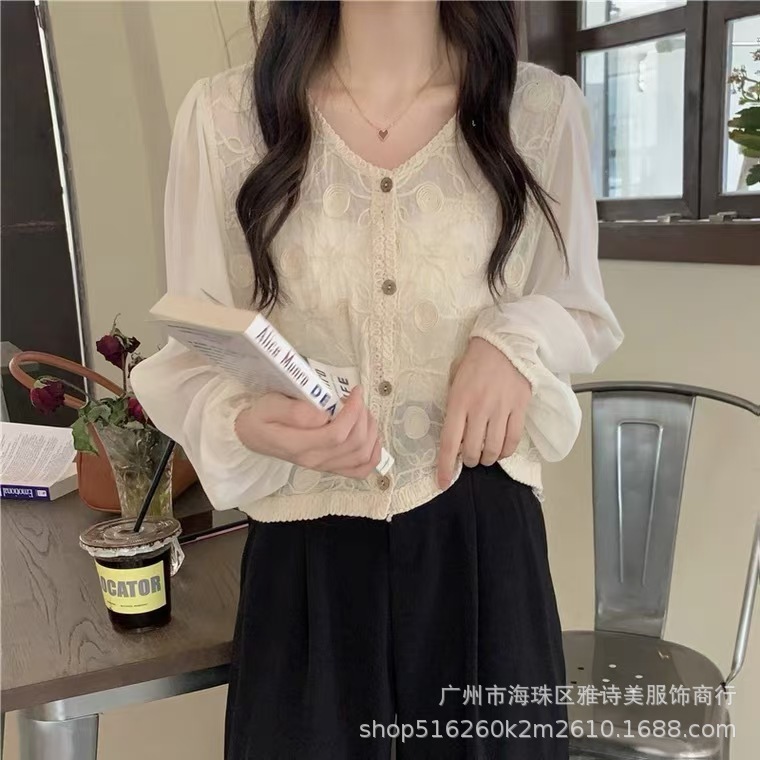 Осенний новый супер Сказочный темперамент ниша шить шифоновый кружевной полый корейский стиль с длинным рукавом и V-образным вырезом Модный женский топ