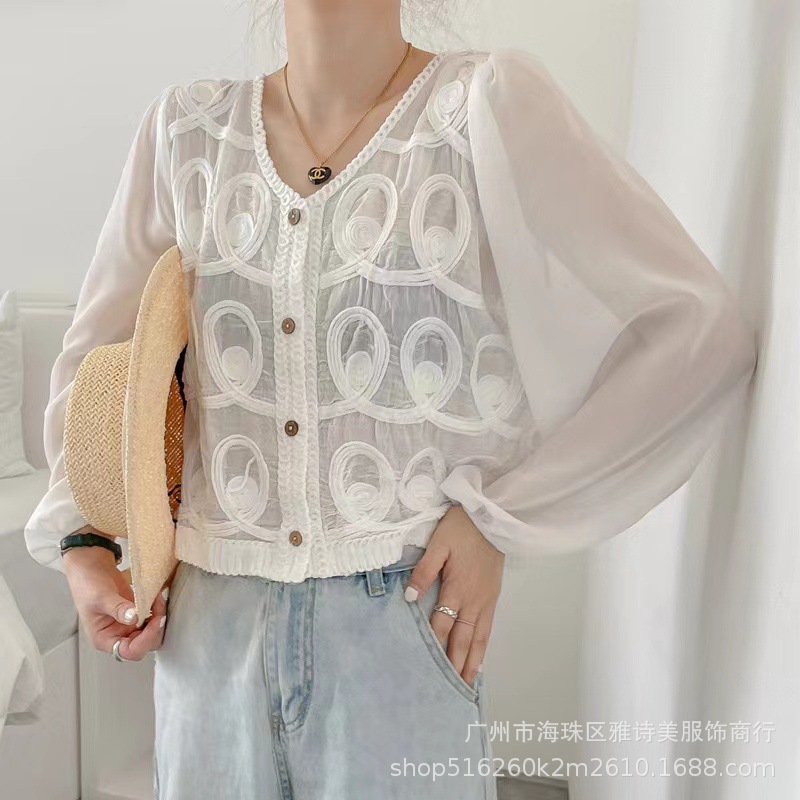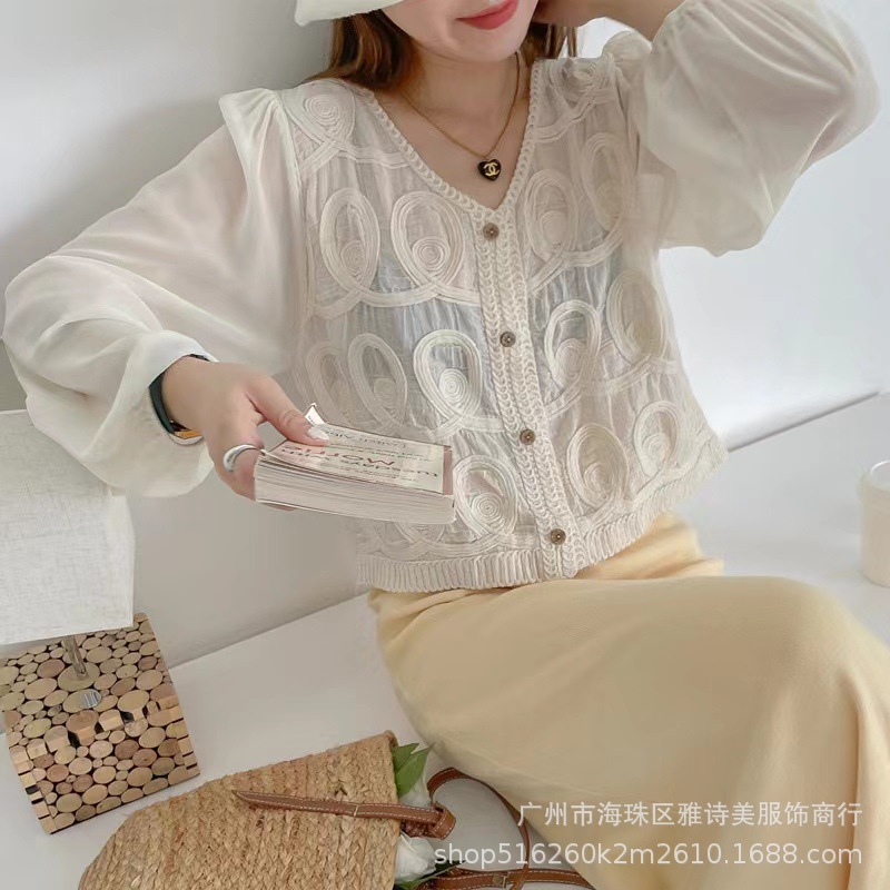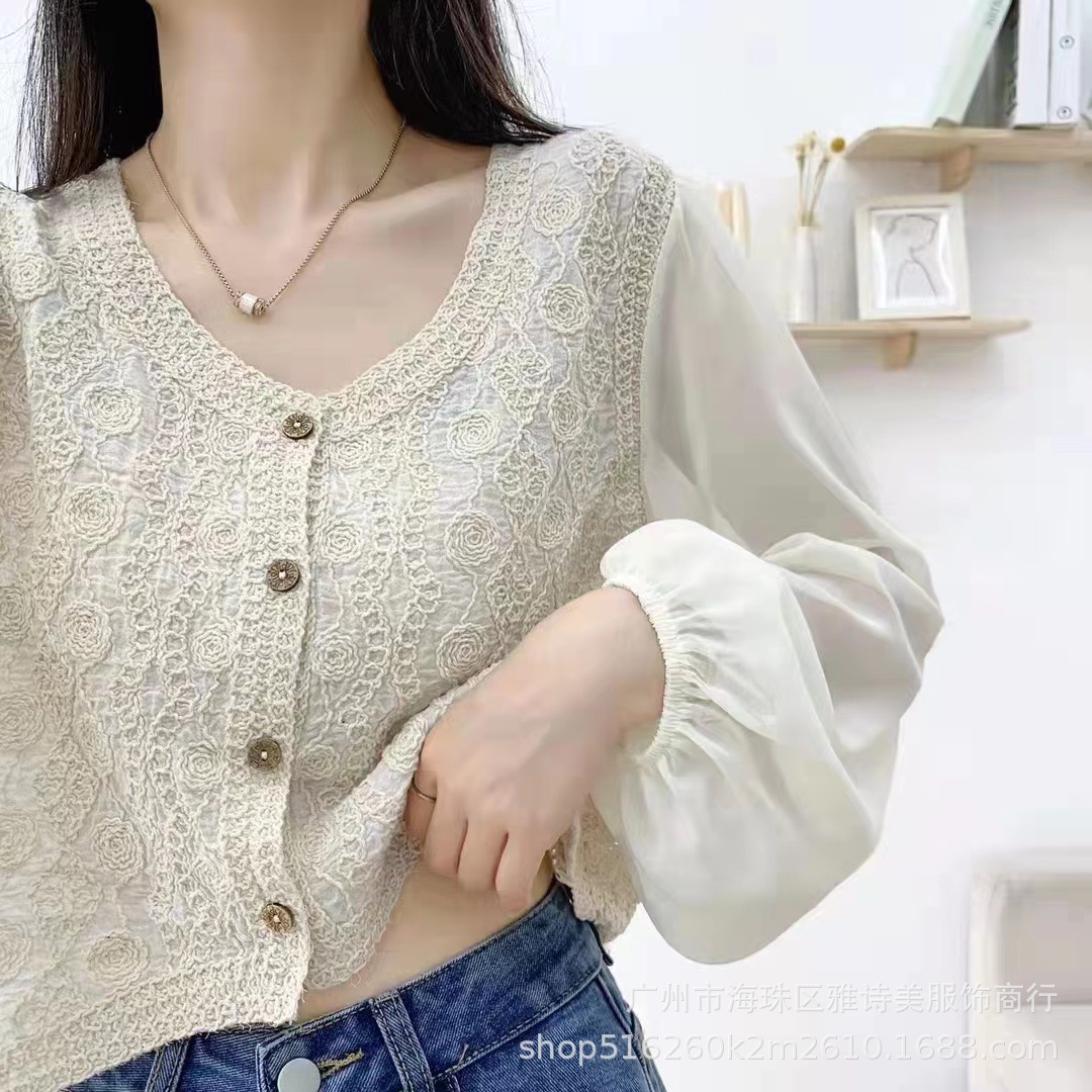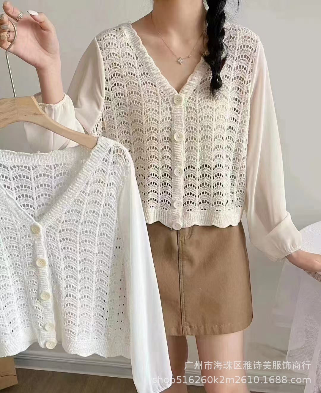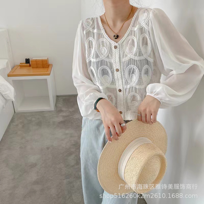 Осенний новый супер Сказочный темперамент ниша шить шифоновый кружевной полый корейский стиль с длинным рукавом и V-образным вырезом Модный женский топ