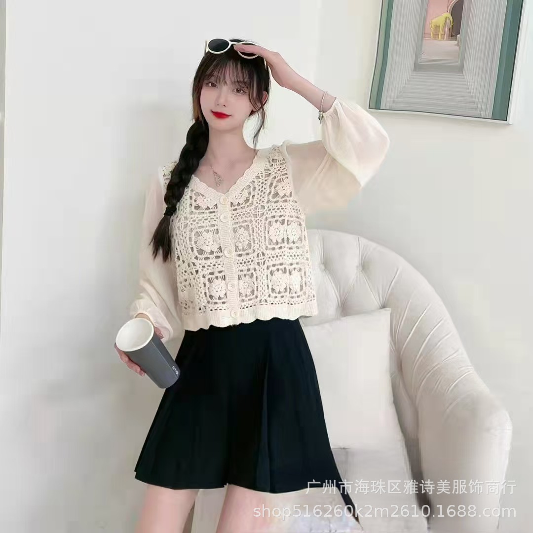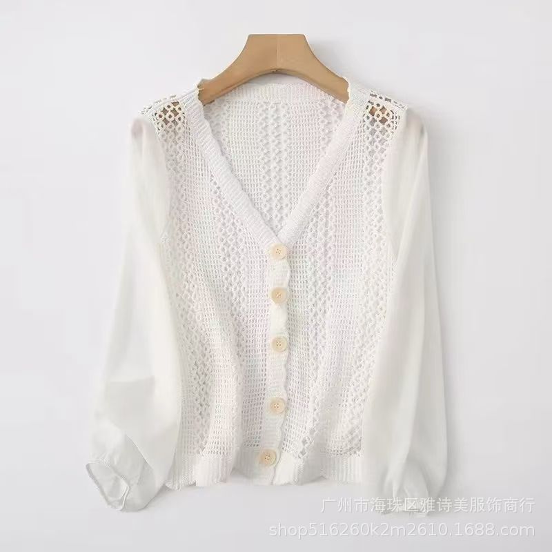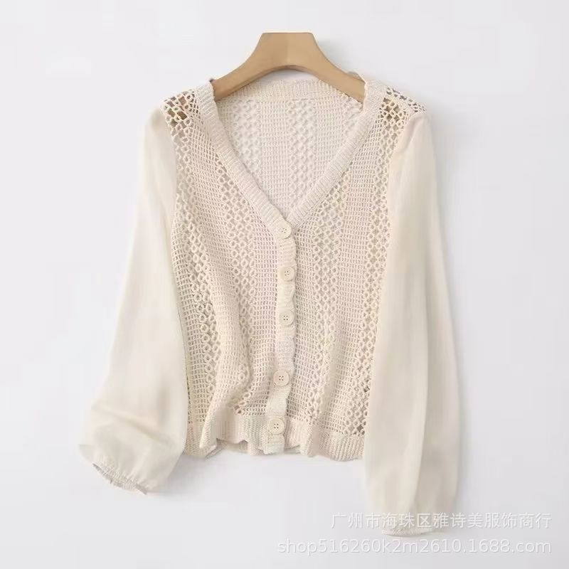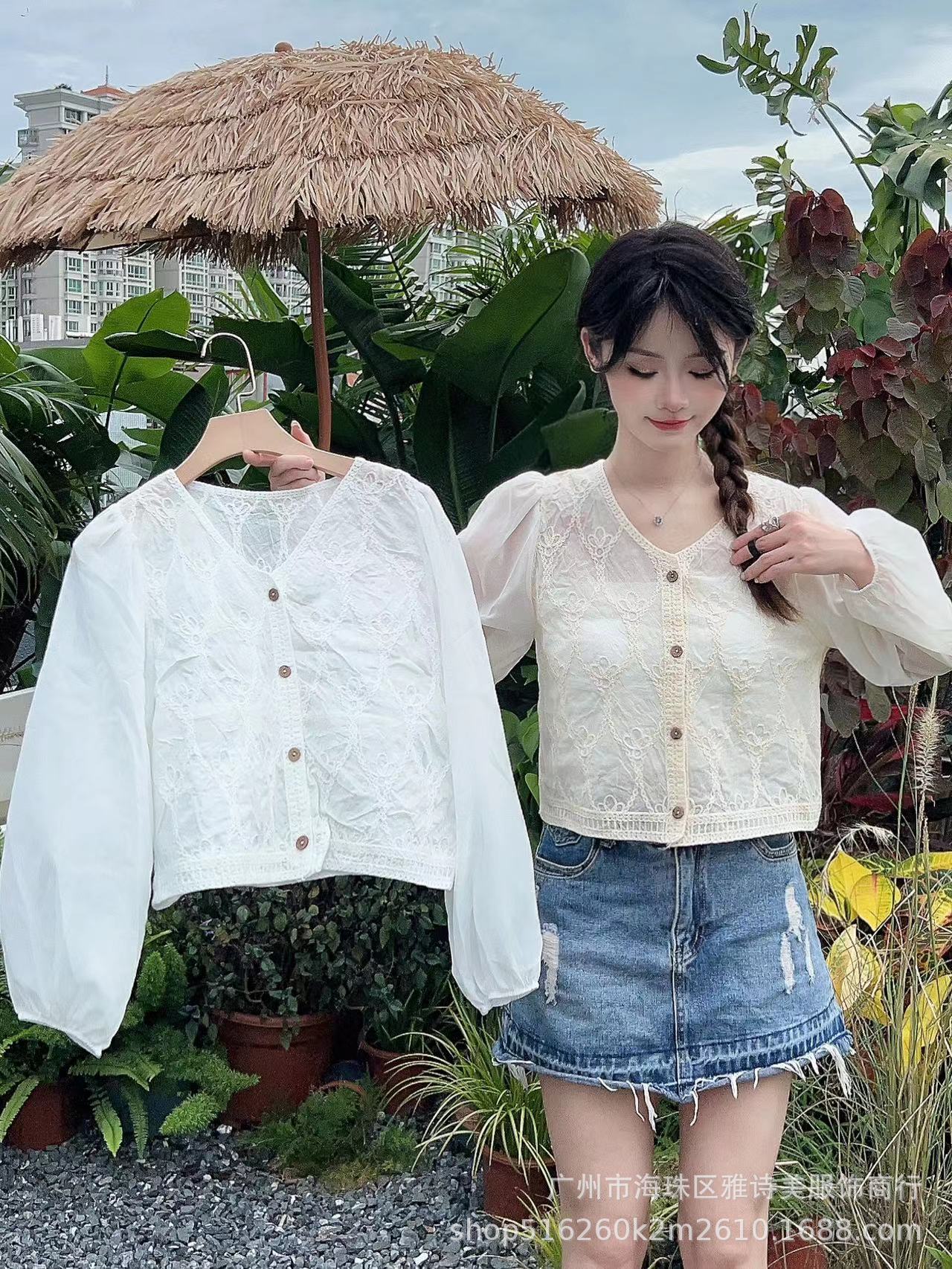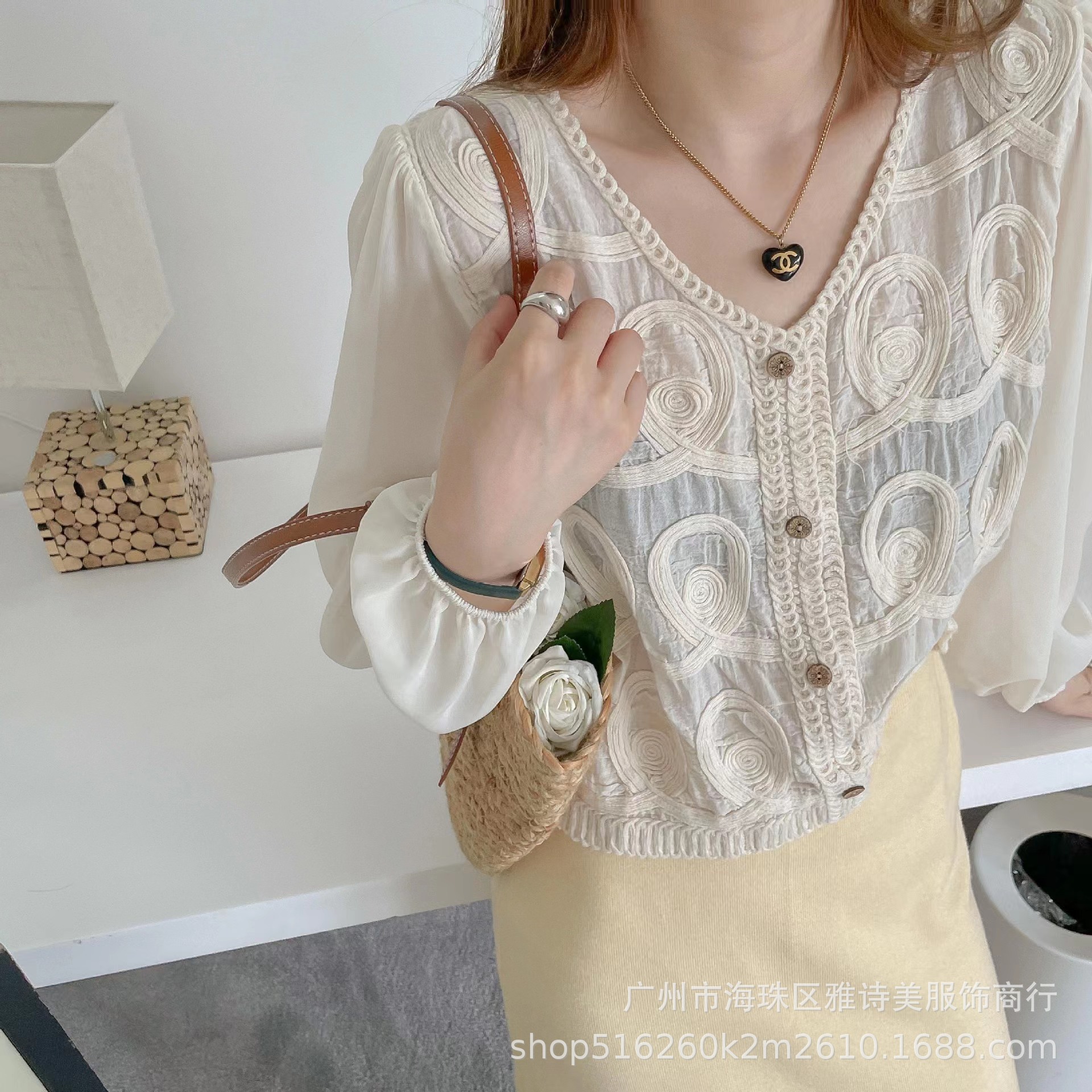 Осенний новый супер Сказочный темперамент ниша шить шифоновый кружевной полый корейский стиль с длинным рукавом и V-образным вырезом Модный женский топ