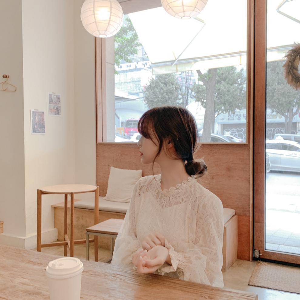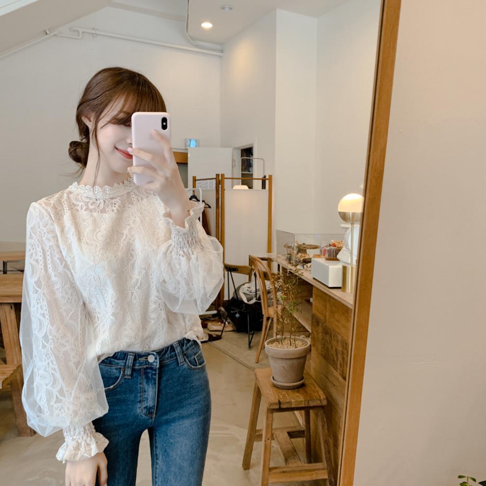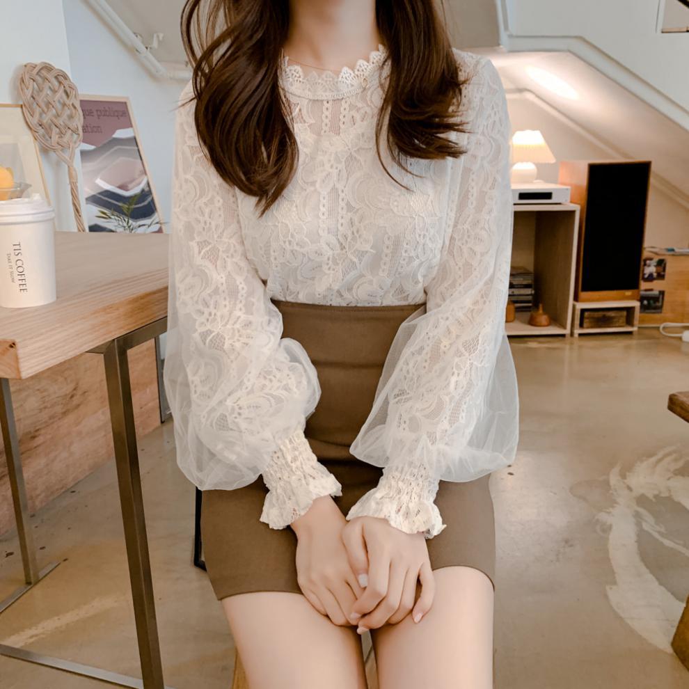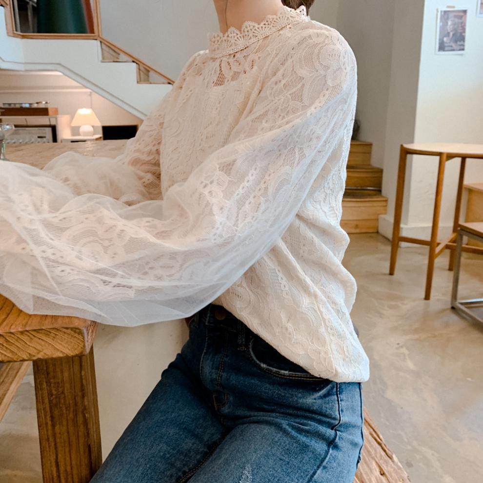 2024 новый белый корейский свободный длинный рукав сетчатая пряжа с рукавами фонарь кружевная рубашка
