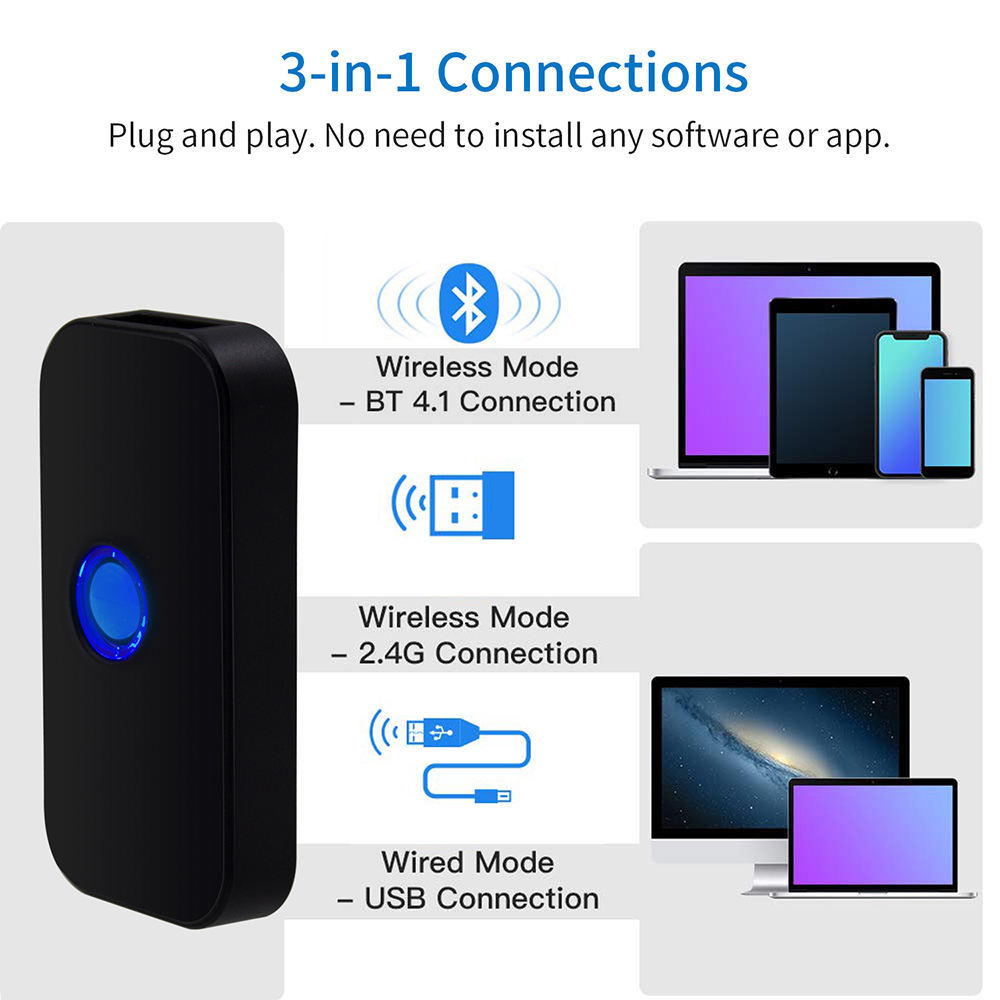 1.迷你尺寸和口袋设计,配有大容量存储条码扫描仪,仅 35 克/1.23 盎司,易于操作和携带。
