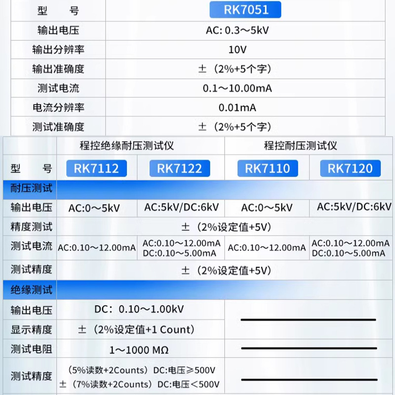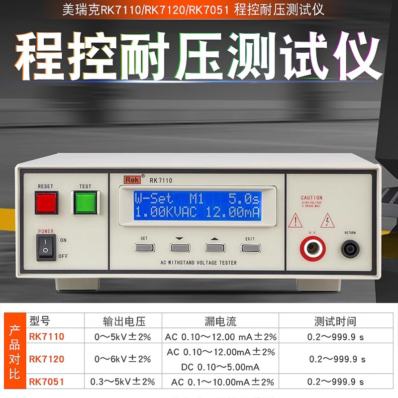 Выдерживаемое напряжение переменного тока RK7051 5KV; Выдерживаемое напряжение переменного тока RK7110 5KV + PLC; Выдерживаемое напряжение переменного/постоянного тока RK7120 5KV + PLC; Выдерживаемое напряжение переменного тока RK7112 5 кВ + изоляция + ПЛК; RK7122 Выдерживаемое напряжение переменного/постоянного тока 5 кВ + изоляция + ПЛК