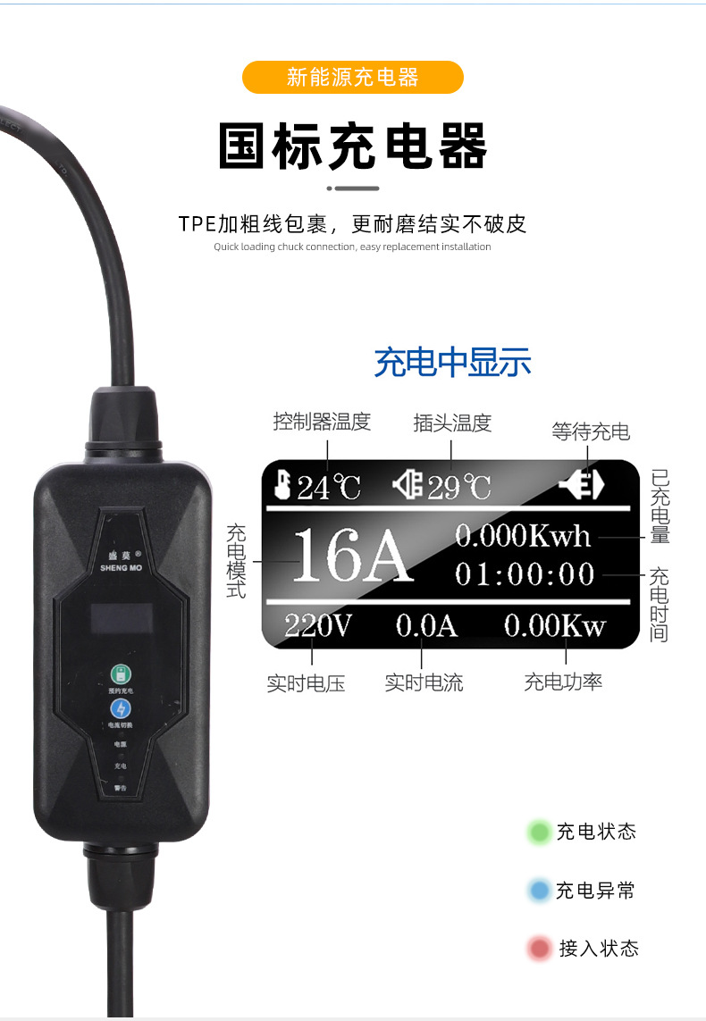 Портативное зарядное устройство национального стандарта 16A 3,5 кВт с подсветкой для дыхания с открытой крышкой в один клик Зарядное устройство Tesla Зарядное устройство