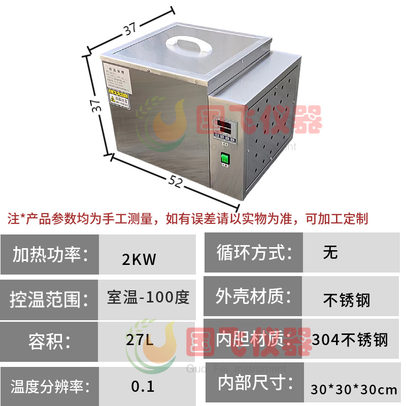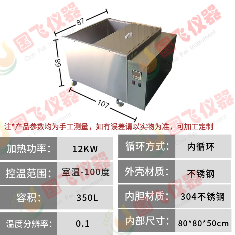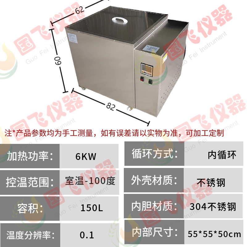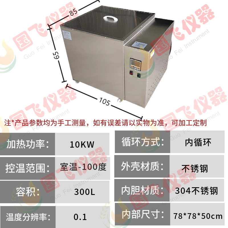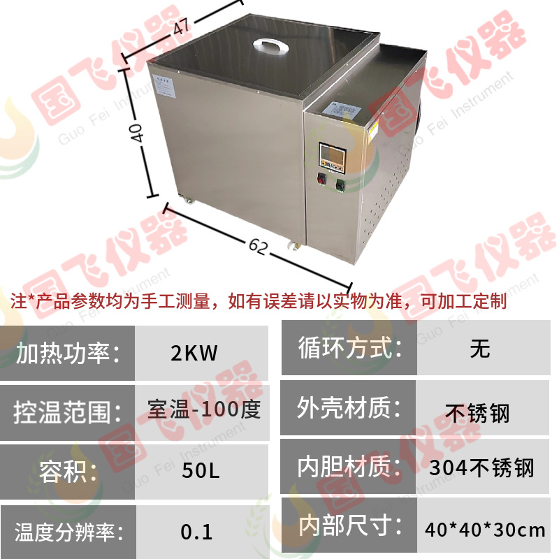 内胆均采用SUS304不锈钢材料制成(外胆按客户要求可选择冷板喷塑外壳);水箱采用微电脑温度控制系统,控温准;水箱加热管平均分布于水箱底部,并且有隔板与水箱工作区隔开,水箱工作区可根据需要放置各种物品和容器