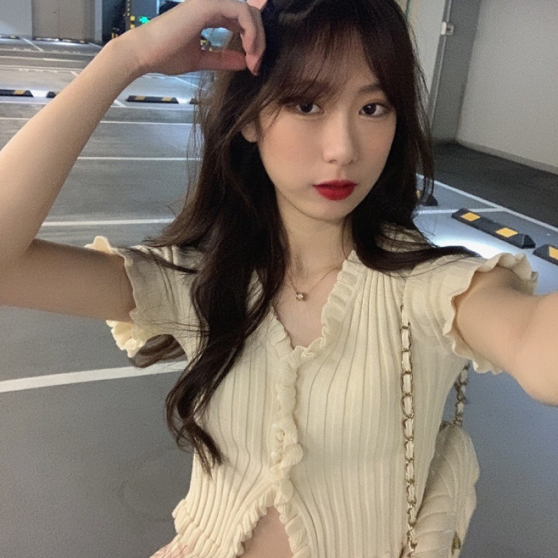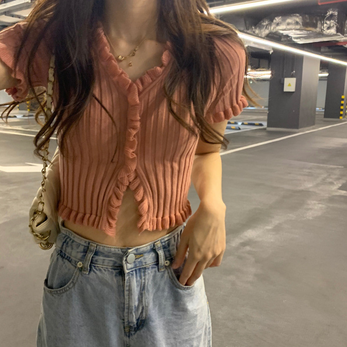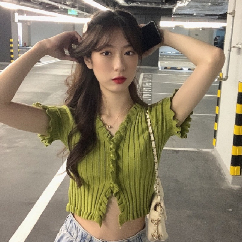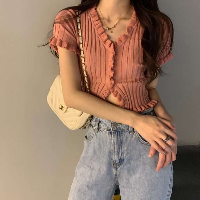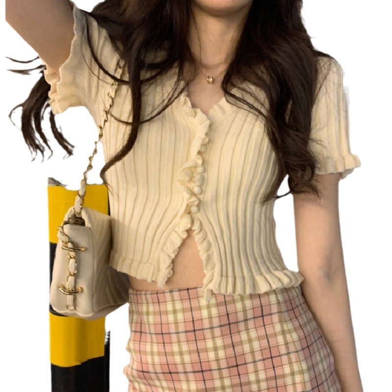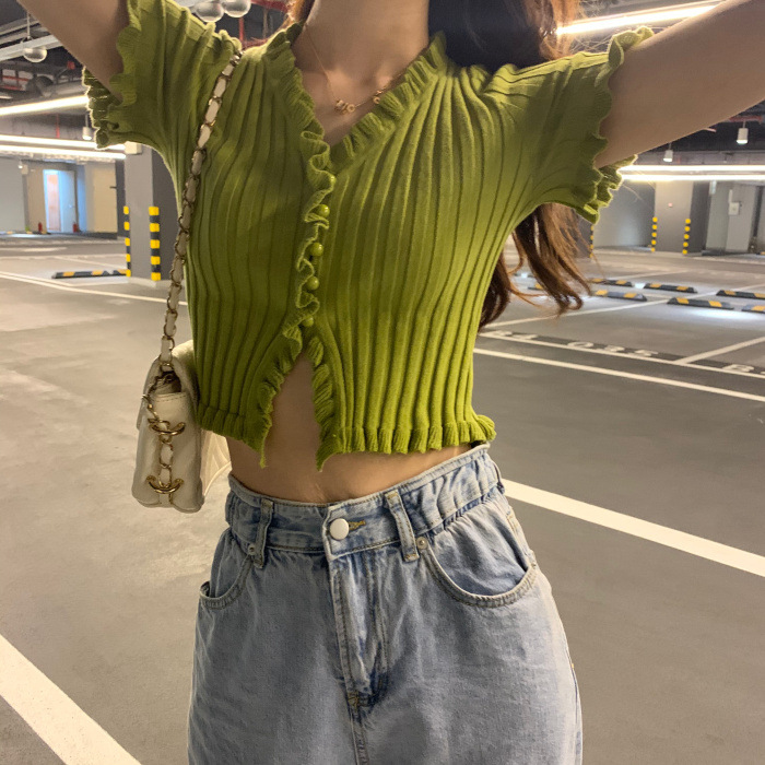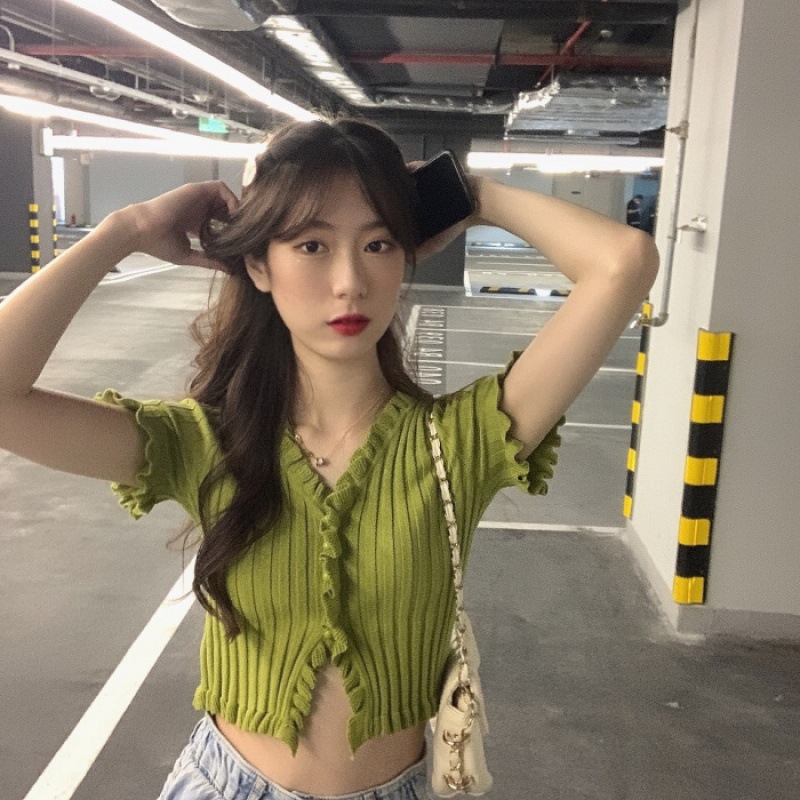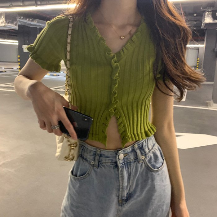 Короткая Горячая женская верхняя одежда для женщин 2024 новый летний деревянный ушко интернет-знаменитости с высокой талией пупок с V-образным вырезом свитер с коротким рукавом