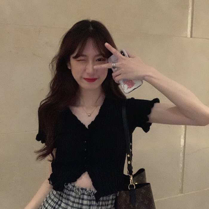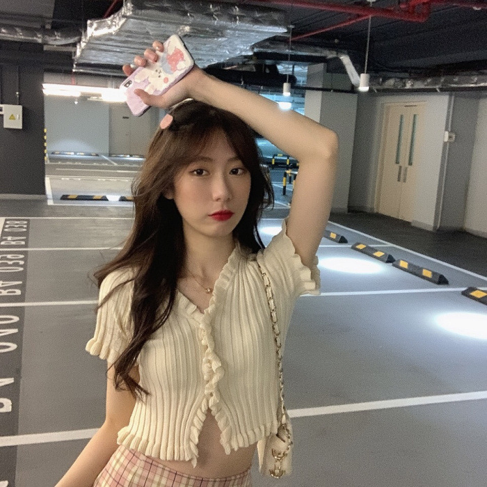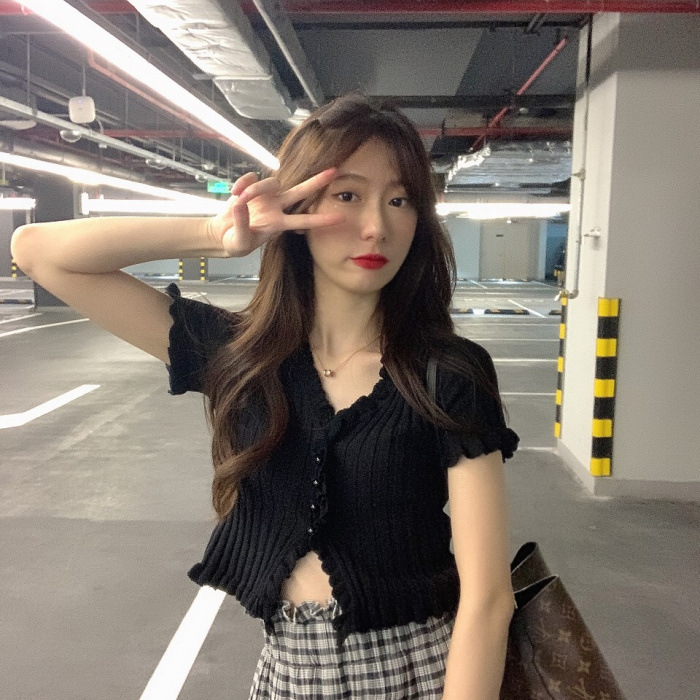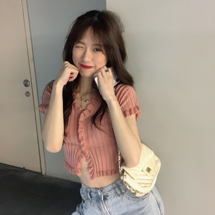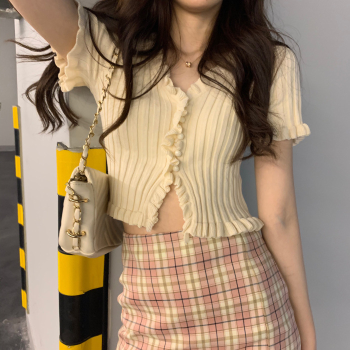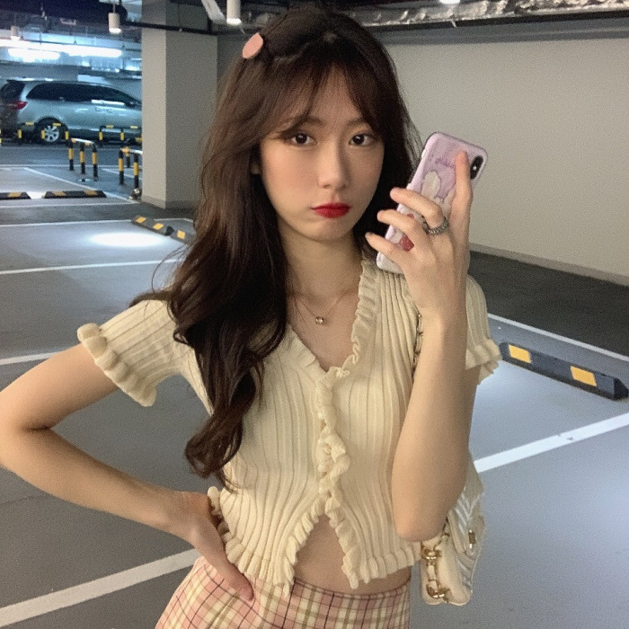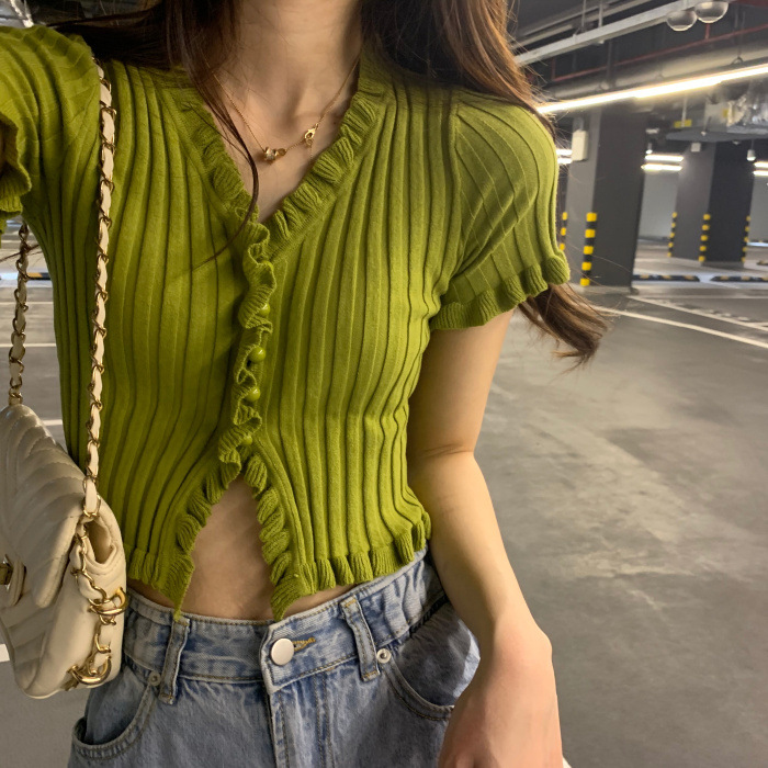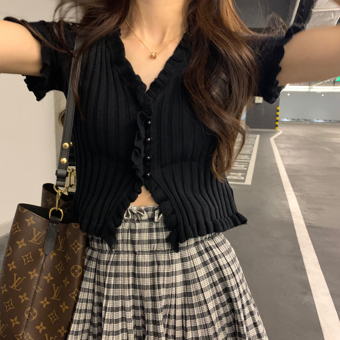 Короткая Горячая женская верхняя одежда для женщин 2024 новый летний деревянный ушко интернет-знаменитости с высокой талией пупок с V-образным вырезом свитер с коротким рукавом