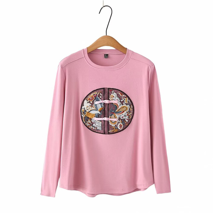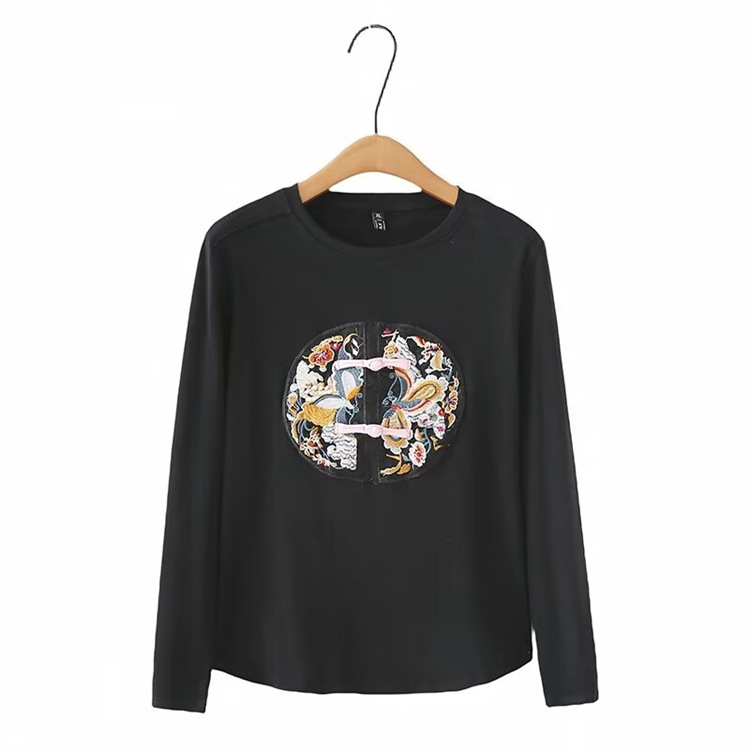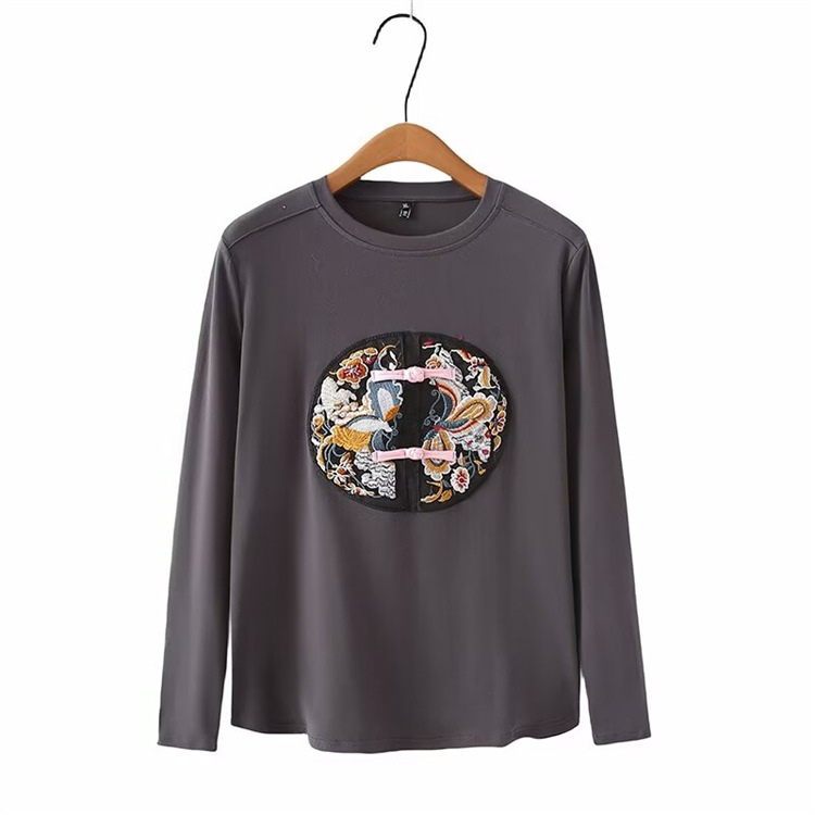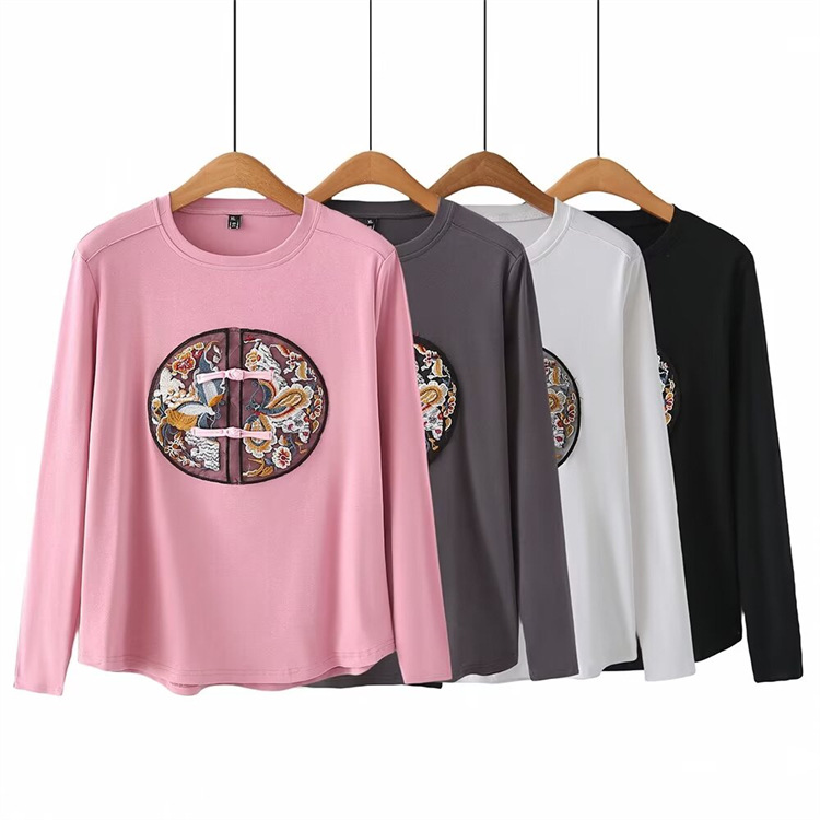 Женская одежда больших размеров в стиле ретро, Весенняя Универсальная футболка с круглым вырезом и вышивкой в национальном стиле с пряжкой в стиле ретро 2403
