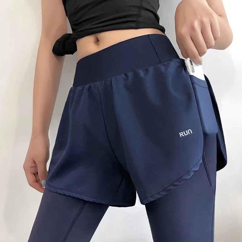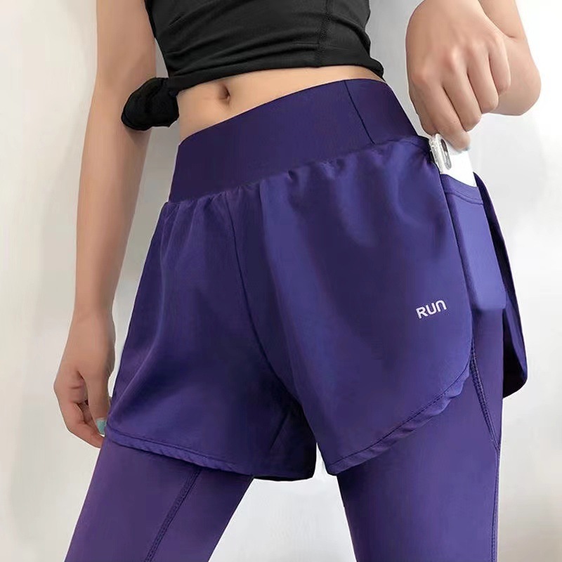 Поддельные две длинные брюки Женские тренировочные брюки, обтягивая талию, бег быстрого сушки йога живот эластичные осенние весенние спортивные штаны