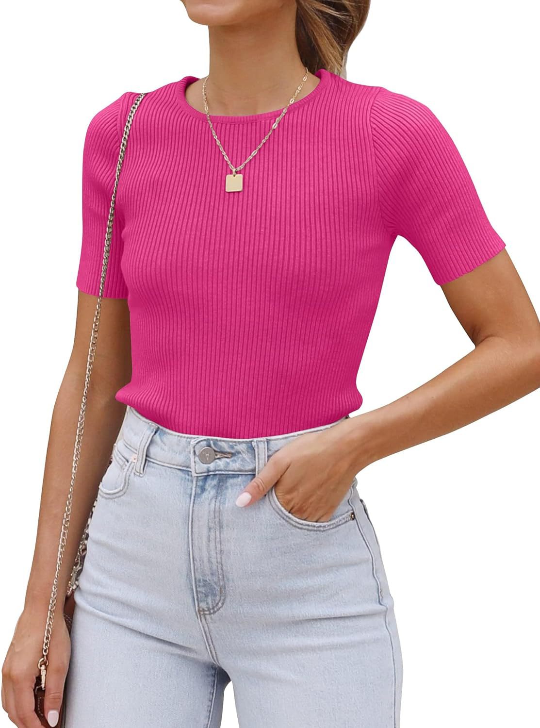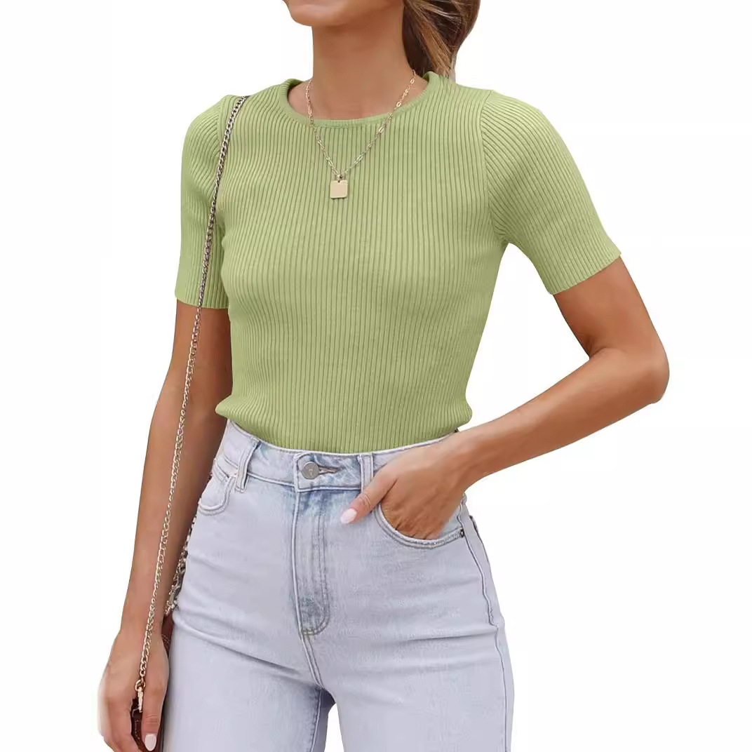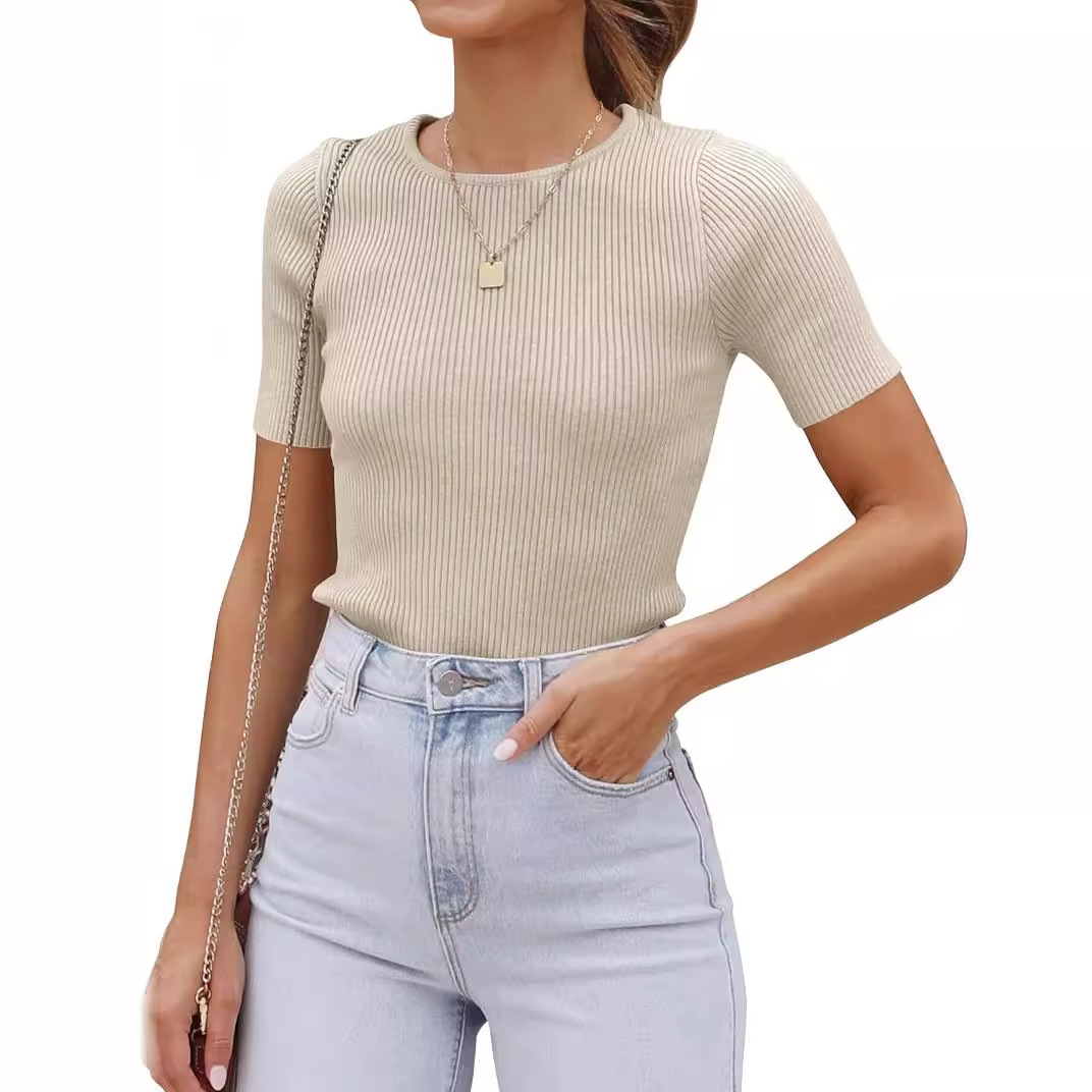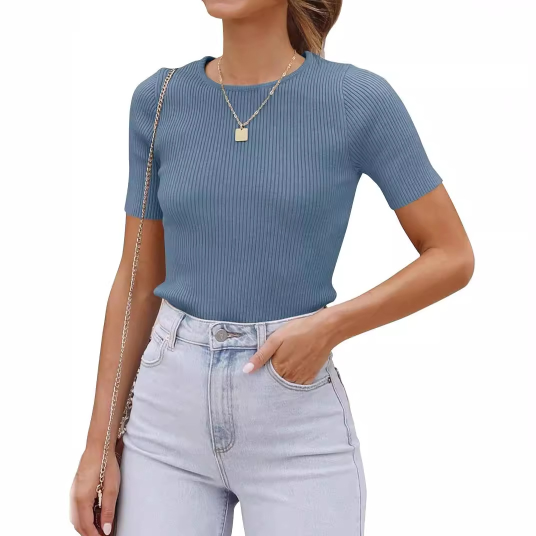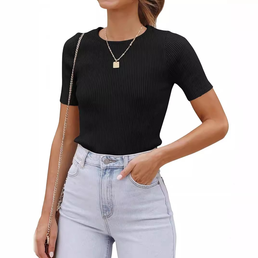 Женская футболка Amazon с короткими рукавами и круглым вырезом, 2024 Летняя вязаная тонкая Базовая однотонная вязаная рубашка с низом