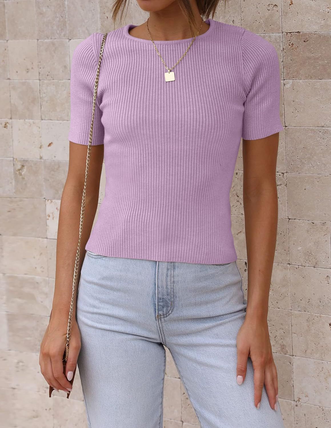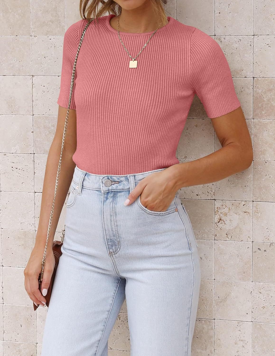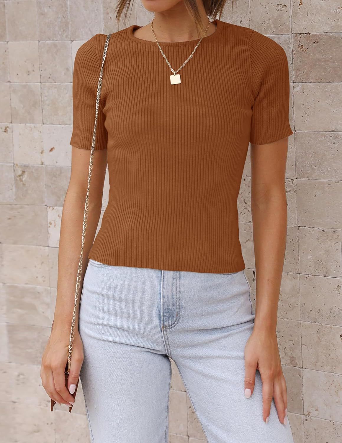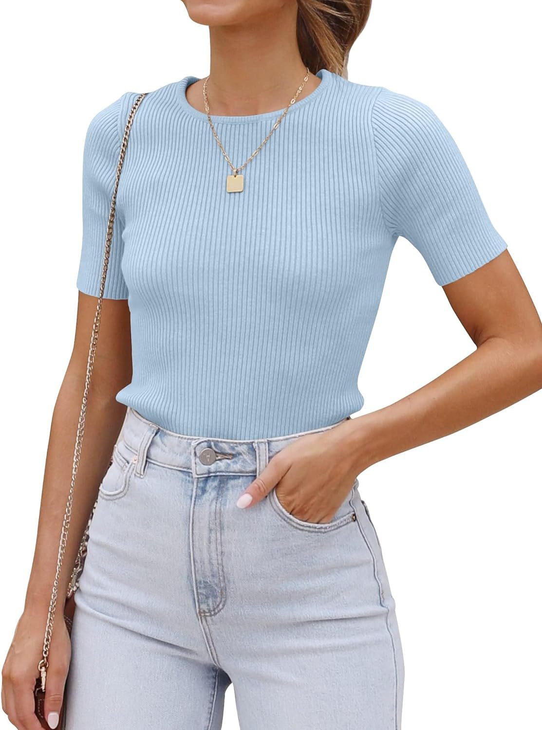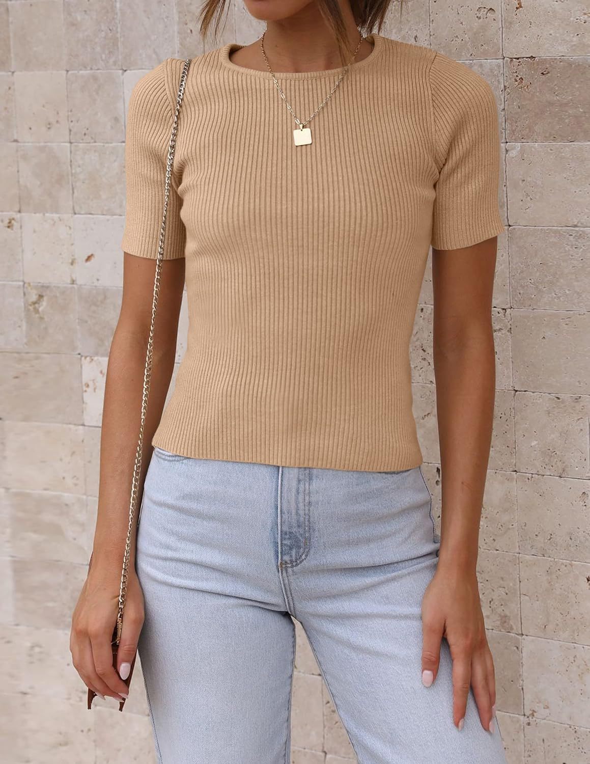 Женская футболка Amazon с короткими рукавами и круглым вырезом, 2024 Летняя вязаная тонкая Базовая однотонная вязаная рубашка с низом
