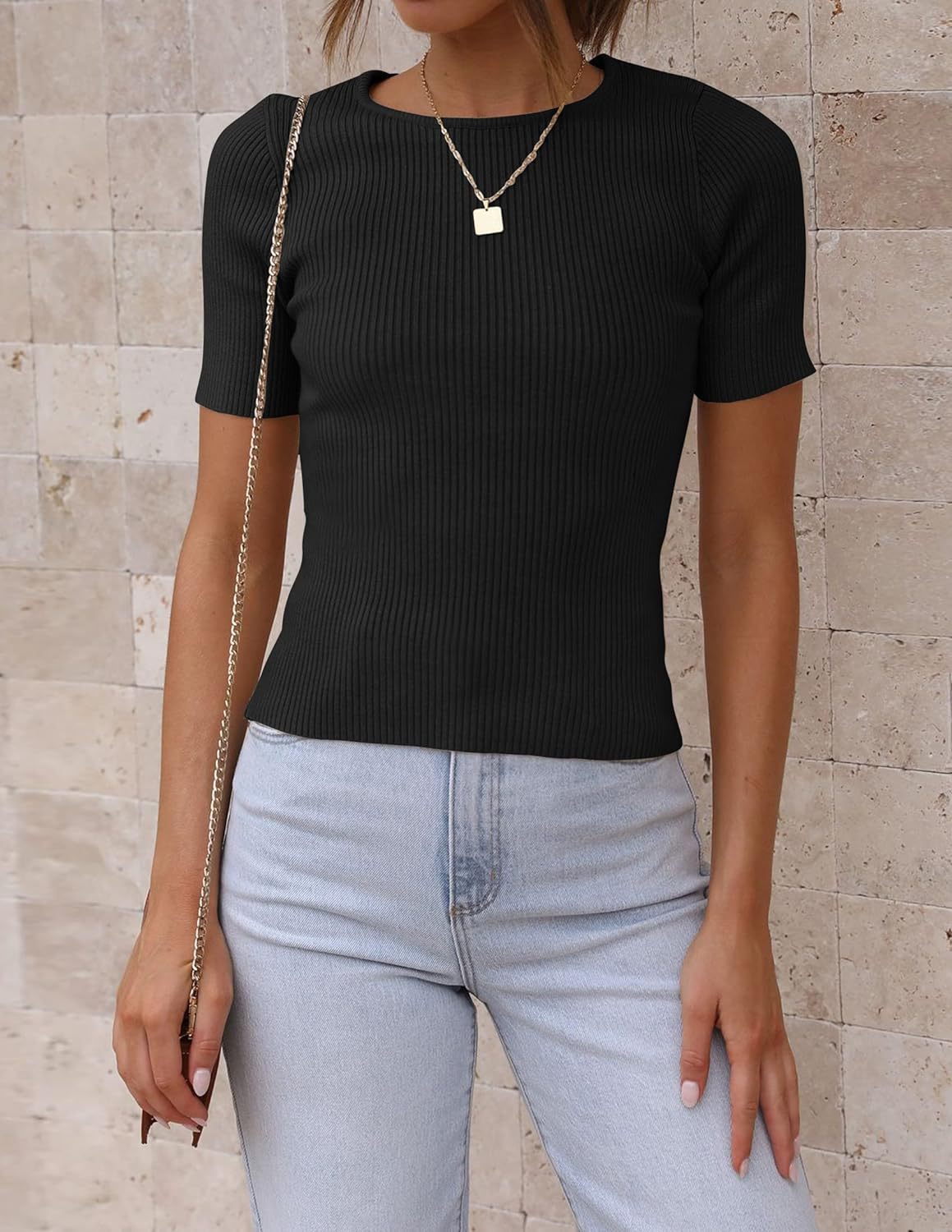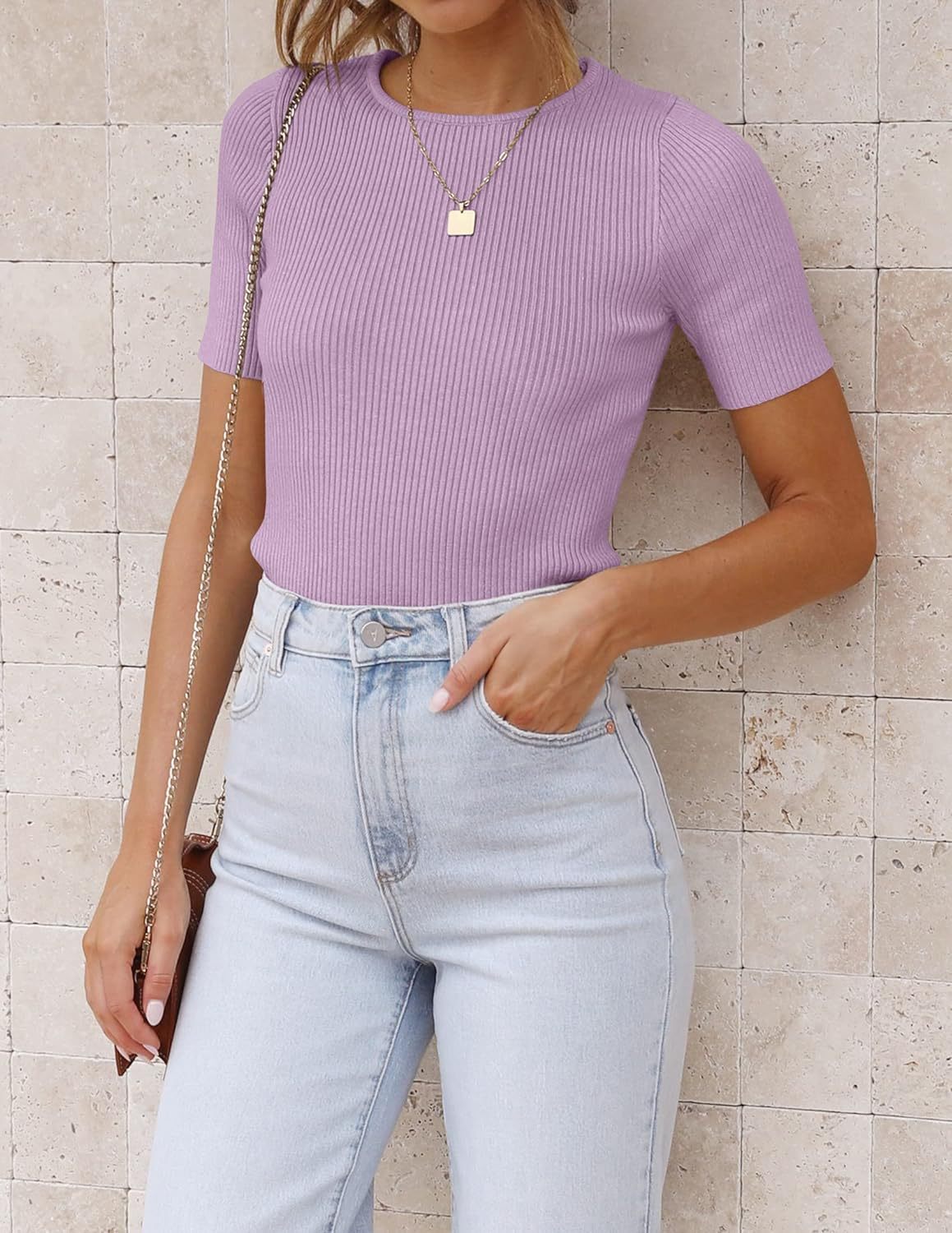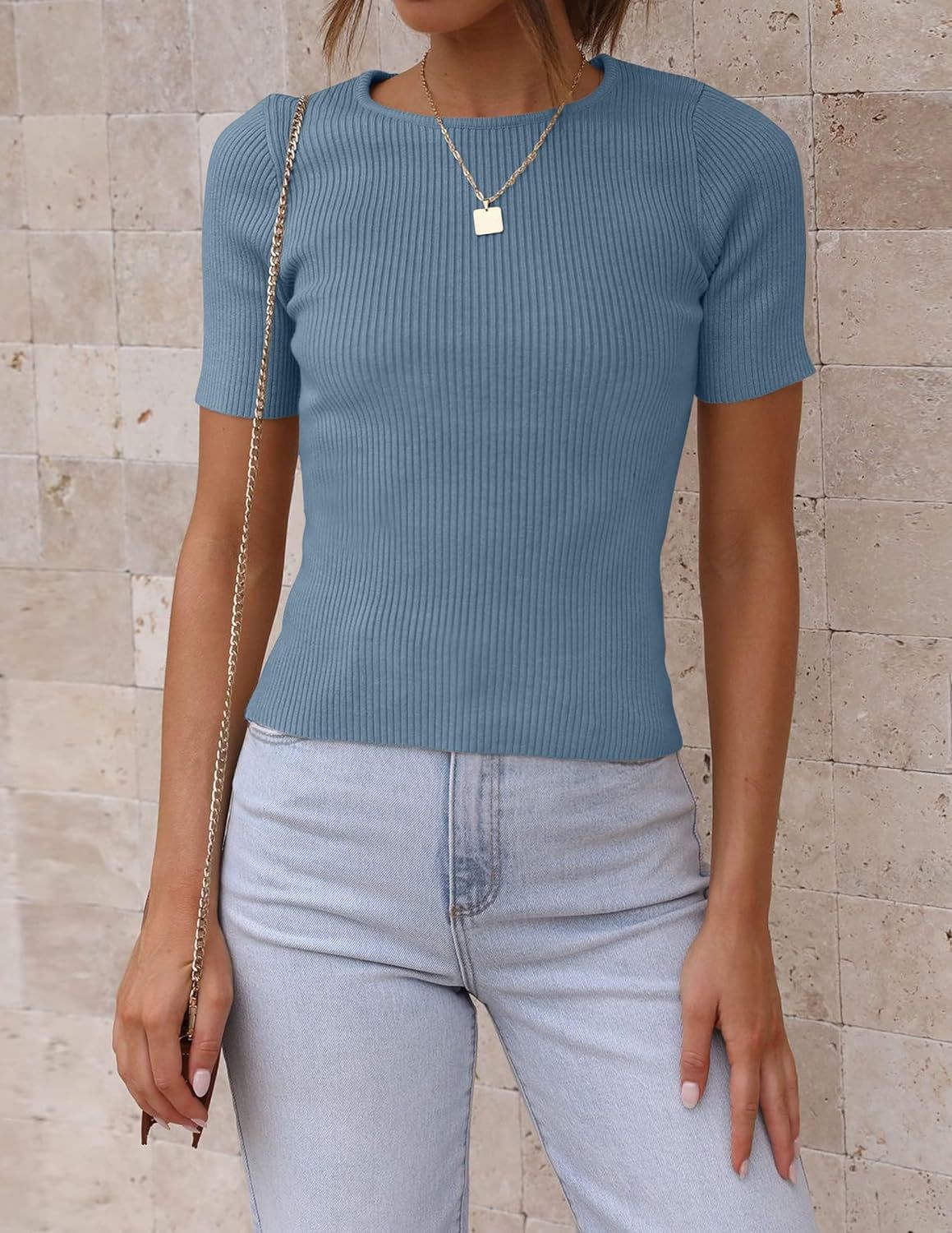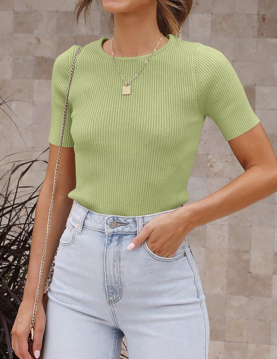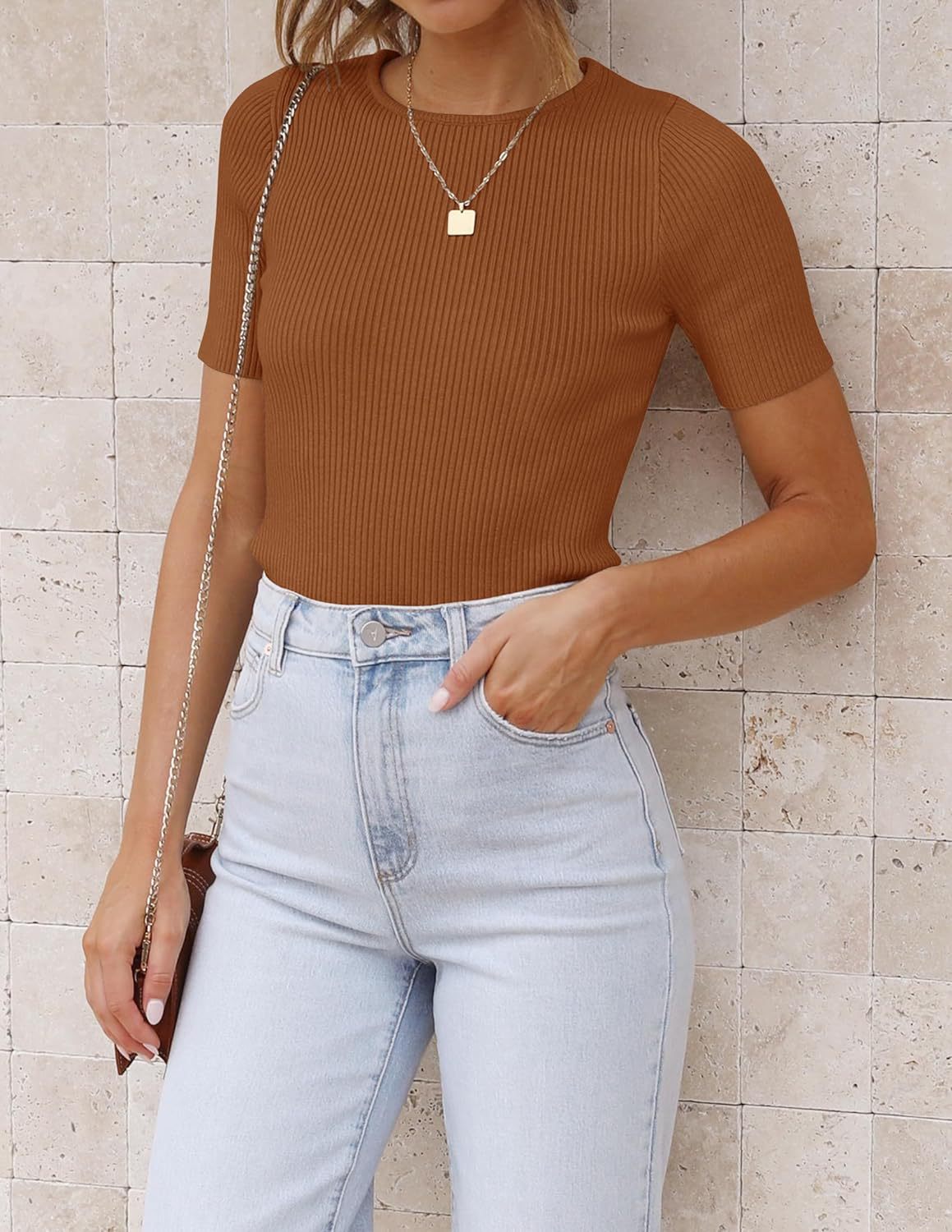 Женская футболка Amazon с короткими рукавами и круглым вырезом, 2024 Летняя вязаная тонкая Базовая однотонная вязаная рубашка с низом
