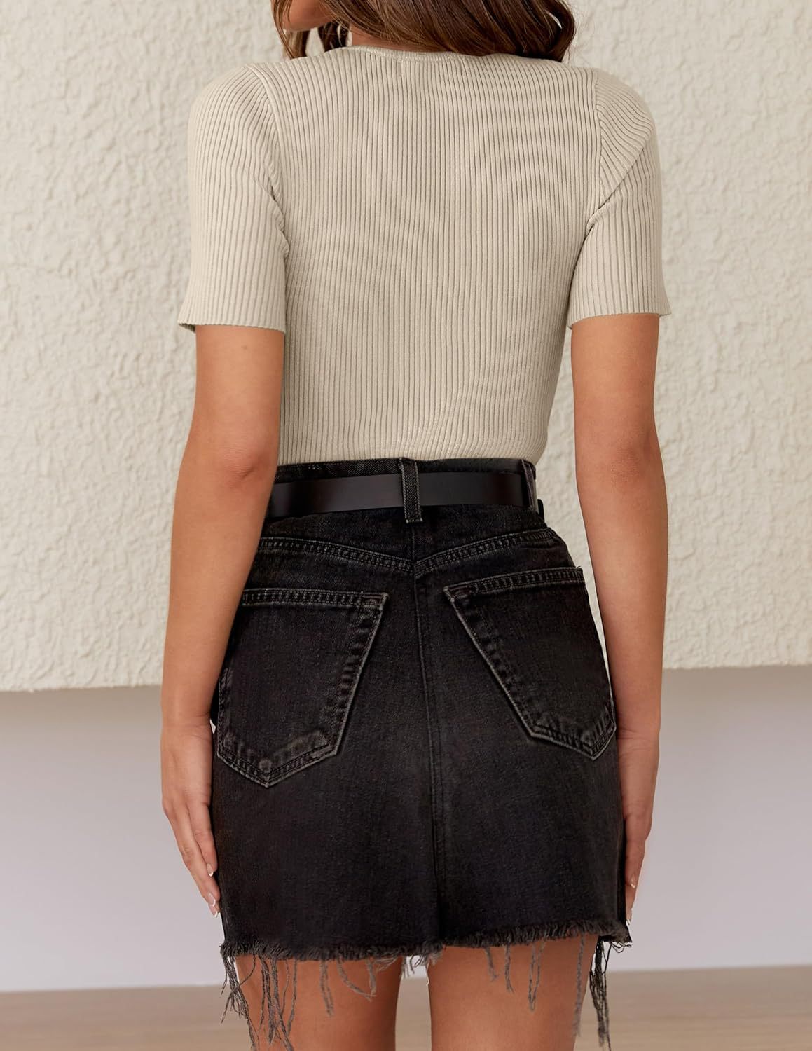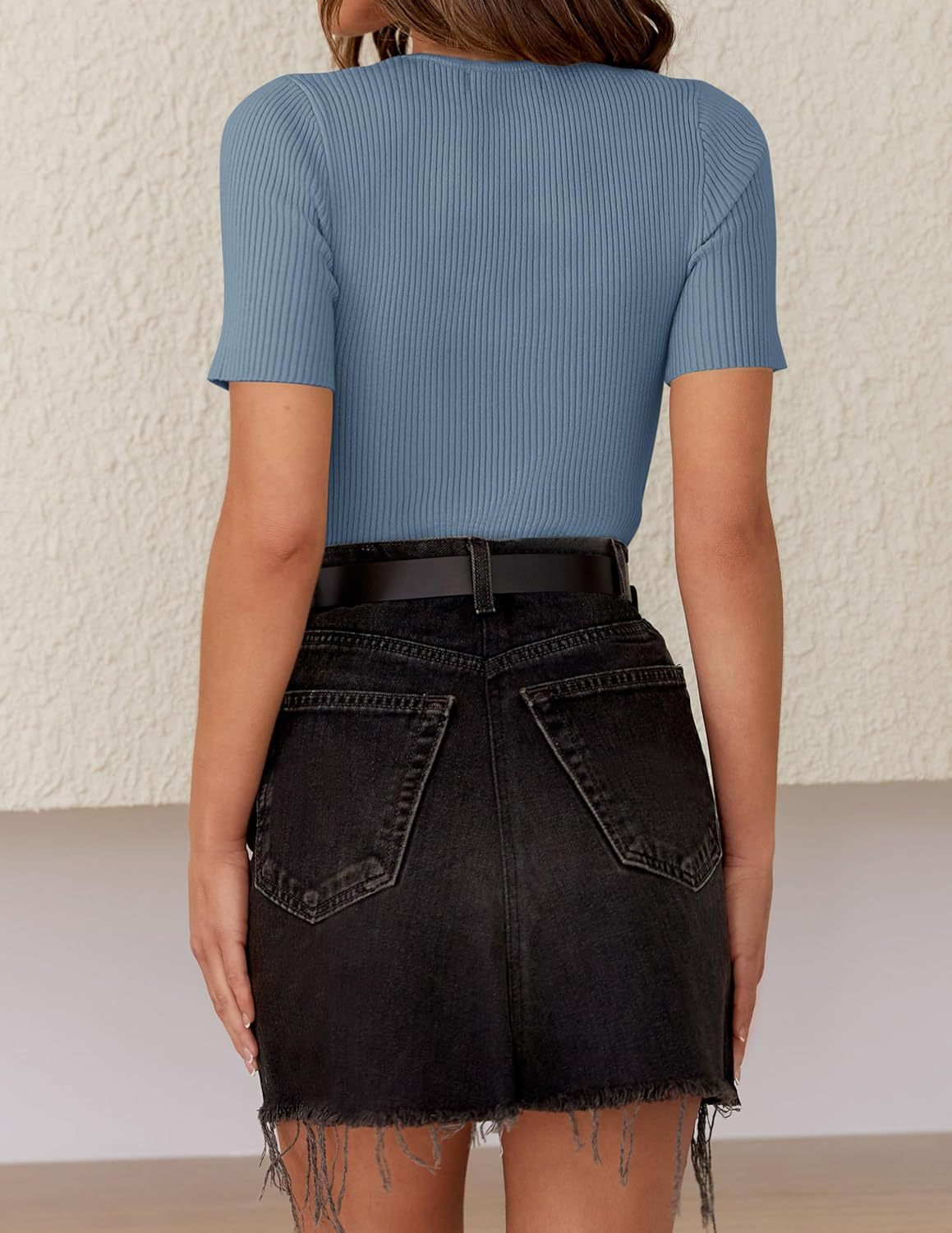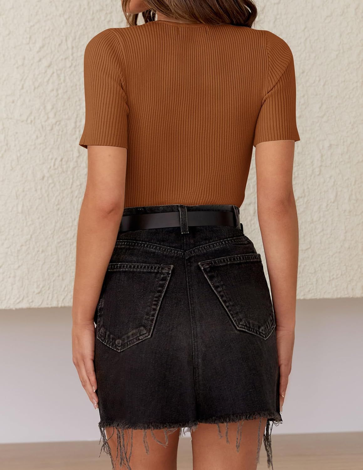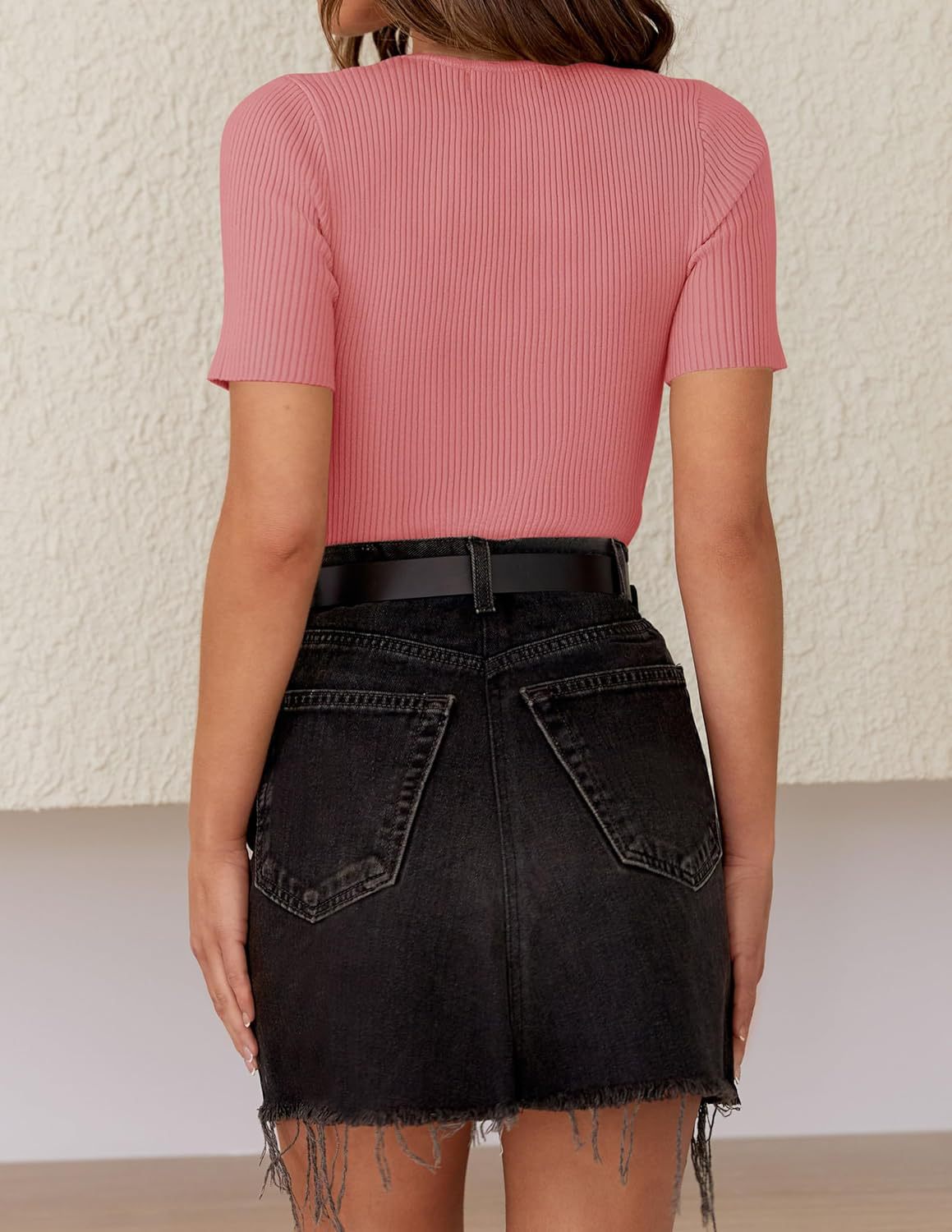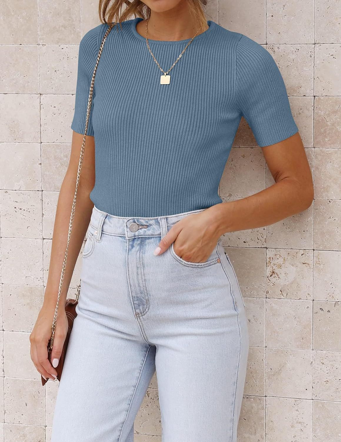 Женская футболка Amazon с короткими рукавами и круглым вырезом, 2024 Летняя вязаная тонкая Базовая однотонная вязаная рубашка с низом