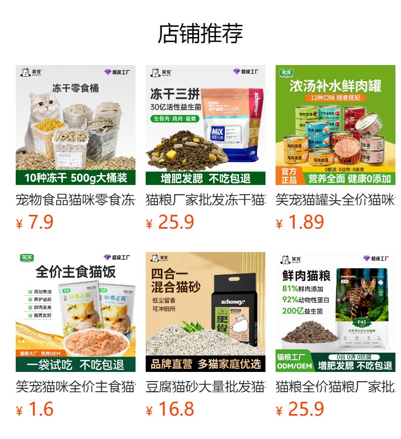 Корм-фосфор и скобы для креветок (полные волосы); Куриные сладкие креветки, скобные продукты (очищенная моча); Турецкие гребешки – основной продукт питания (помогает набрать вес); Мясо утки и арктические гребешки — основные продукты питания (очищают жар и уменьшают шум); Масло трески и криля [Красивые и блестящие волосы]; Лососевая кошачья трава [удаление шерсти]; Курица с клюквой [Уход за мочевыводящими путями]; Пребиотики из мяса кролика [уход за желудочно-кишечным трактом]
