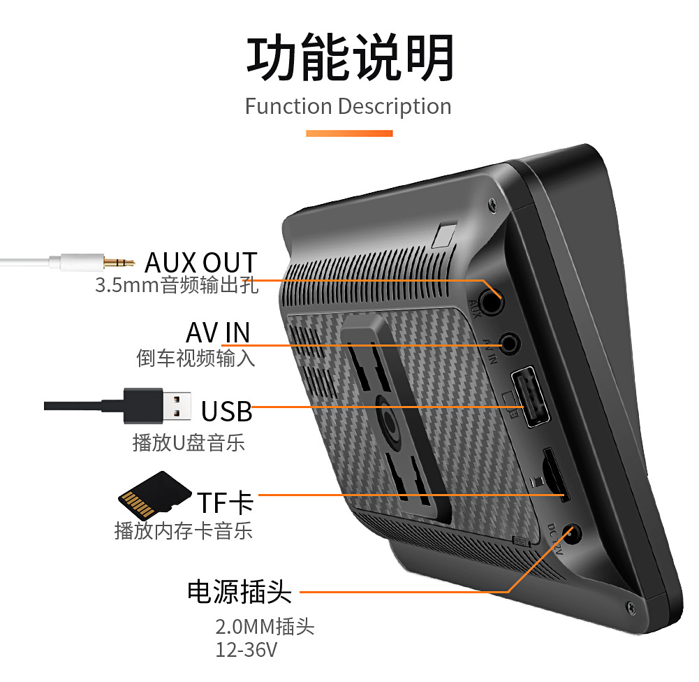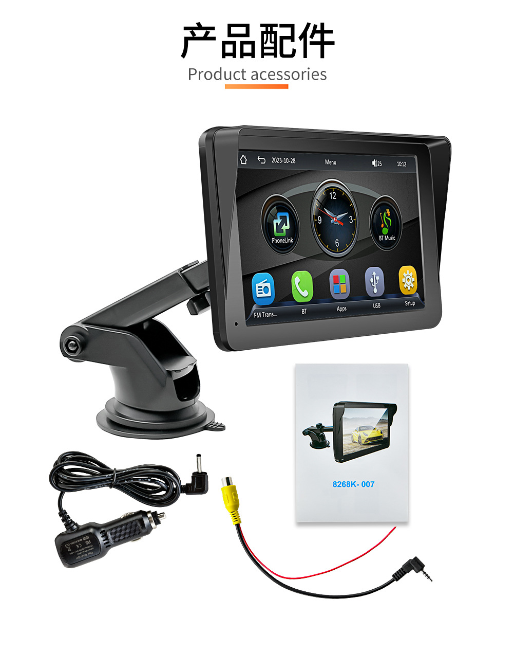配 件:1.主机 2.说明书 3.点烟器电源线 4.吸盘支架 5.倒车视频线(配件、说明书、包装会不定时更新,以实际收到货为准)