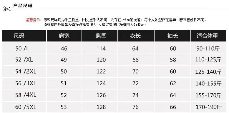 M50 ярдов (90-115 кг); L52 ярдов (115-125 кг); XL54 ярдов (125-140 кг); 2XL56 ярдов (140-160 кг); 3XL58 ярдов (155-180 кг); 4XL60 ярдов (180-200 кг)