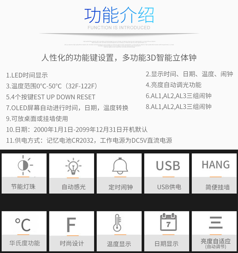 功 能:时间、温度、日期、闹钟、记忆、自动亮度调节、台式/挂式