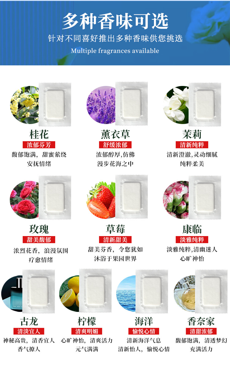 Жасмин; Османтуса; Дом Шаннаи; Древний дракон; Лимон; Розы; Лаванда; Ваниль; Океан; Кан Линсян; Клубничный аромат; Молоко; Циликсян