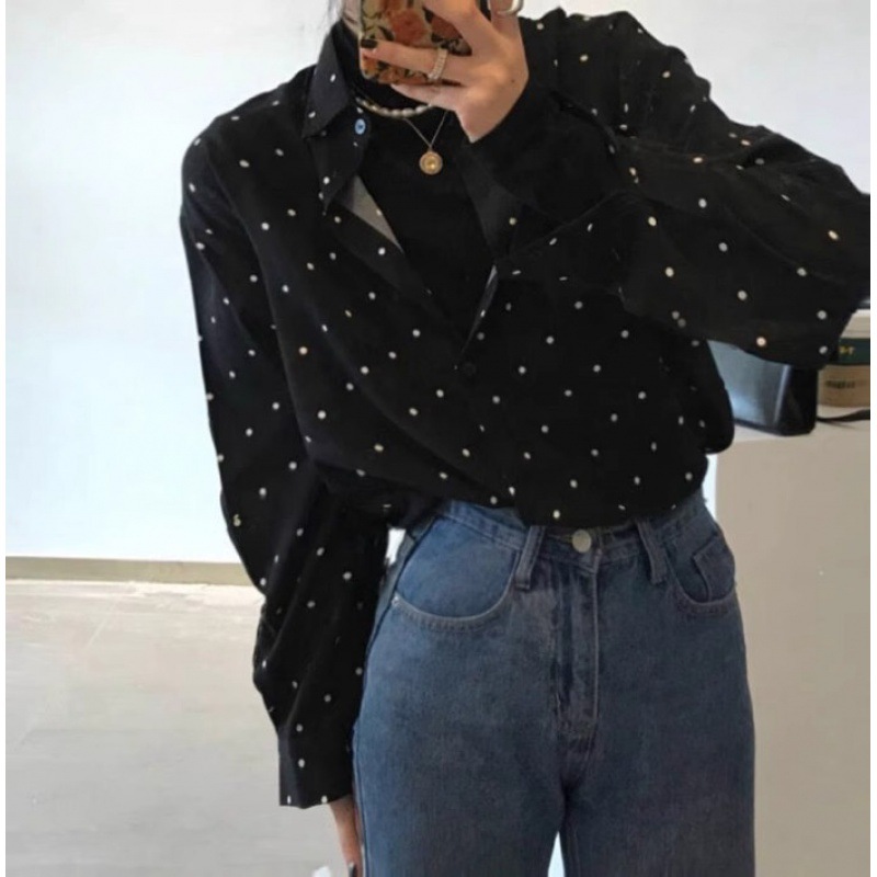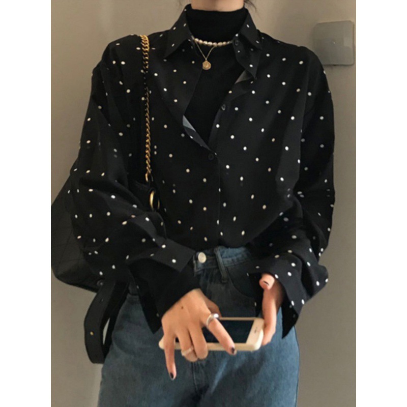 Корейский chic ретро Хепберн ветер лацканный воротник с контрастным цветом дизайн волновой точки свободный повседневная дикая рубашка с длинными рукавами для женщин
