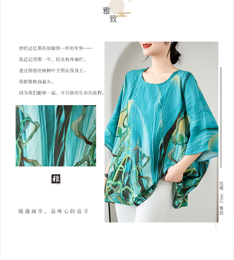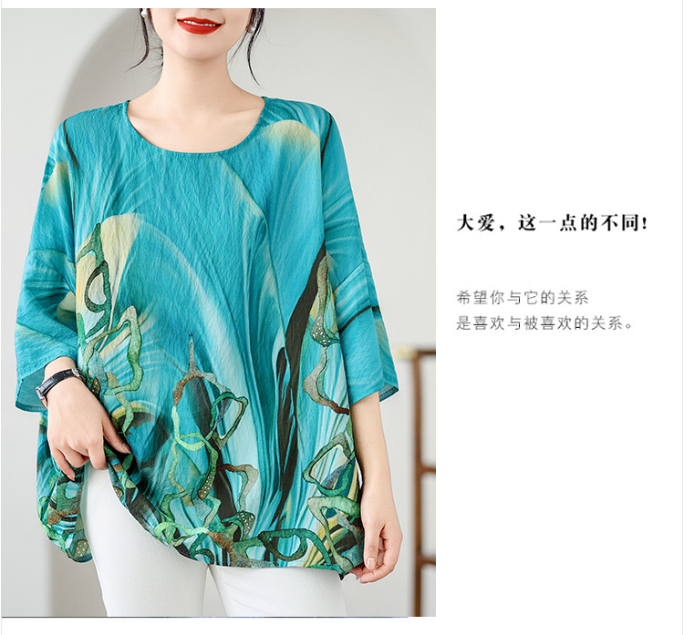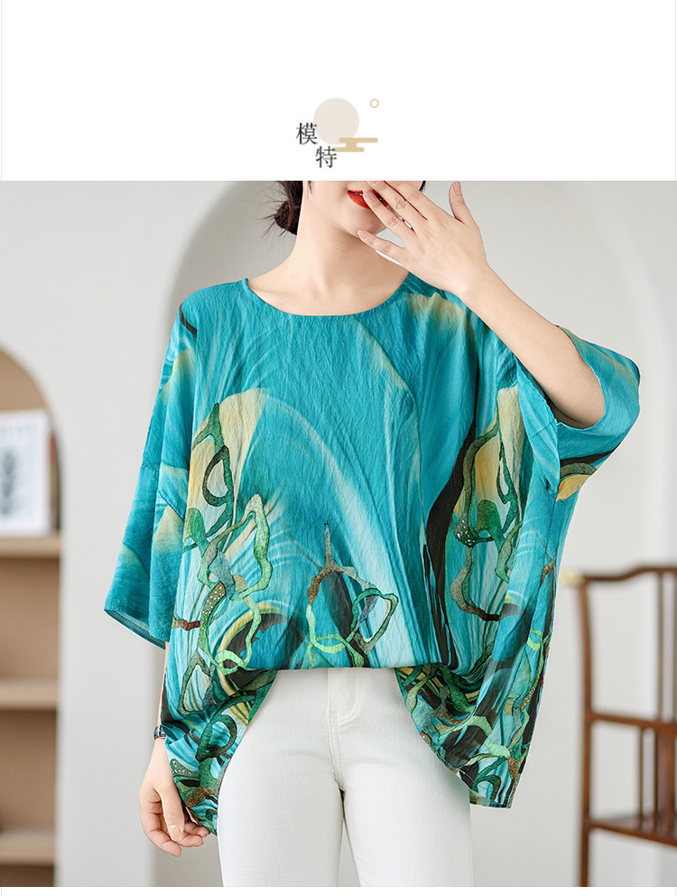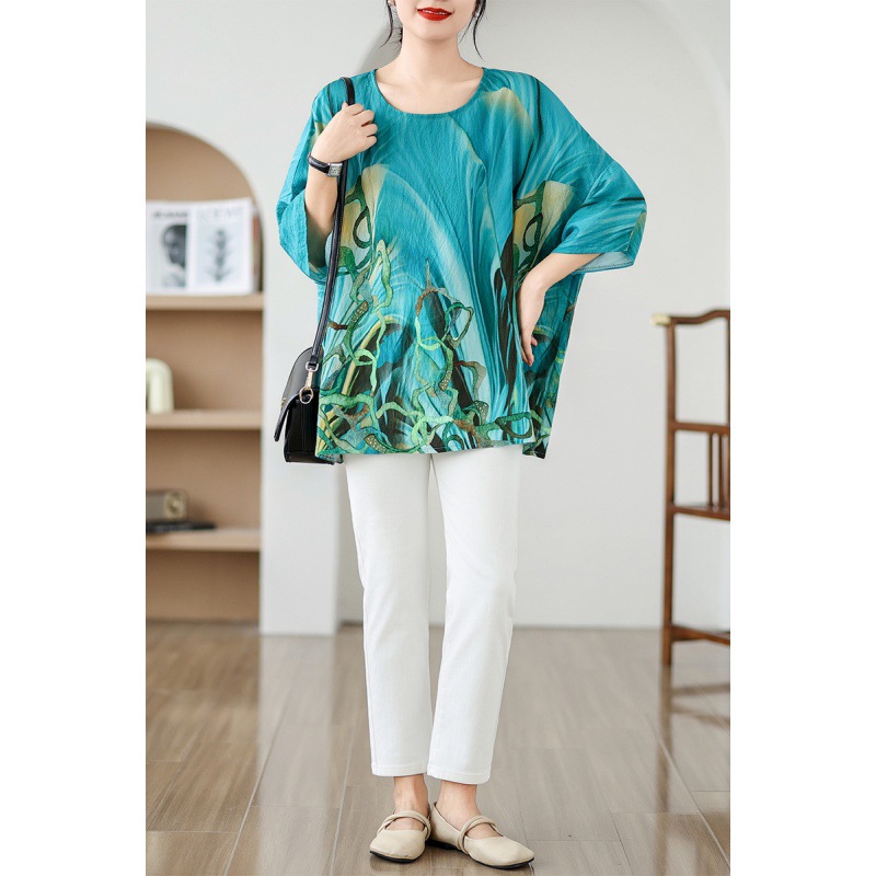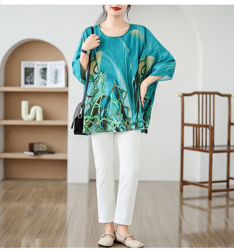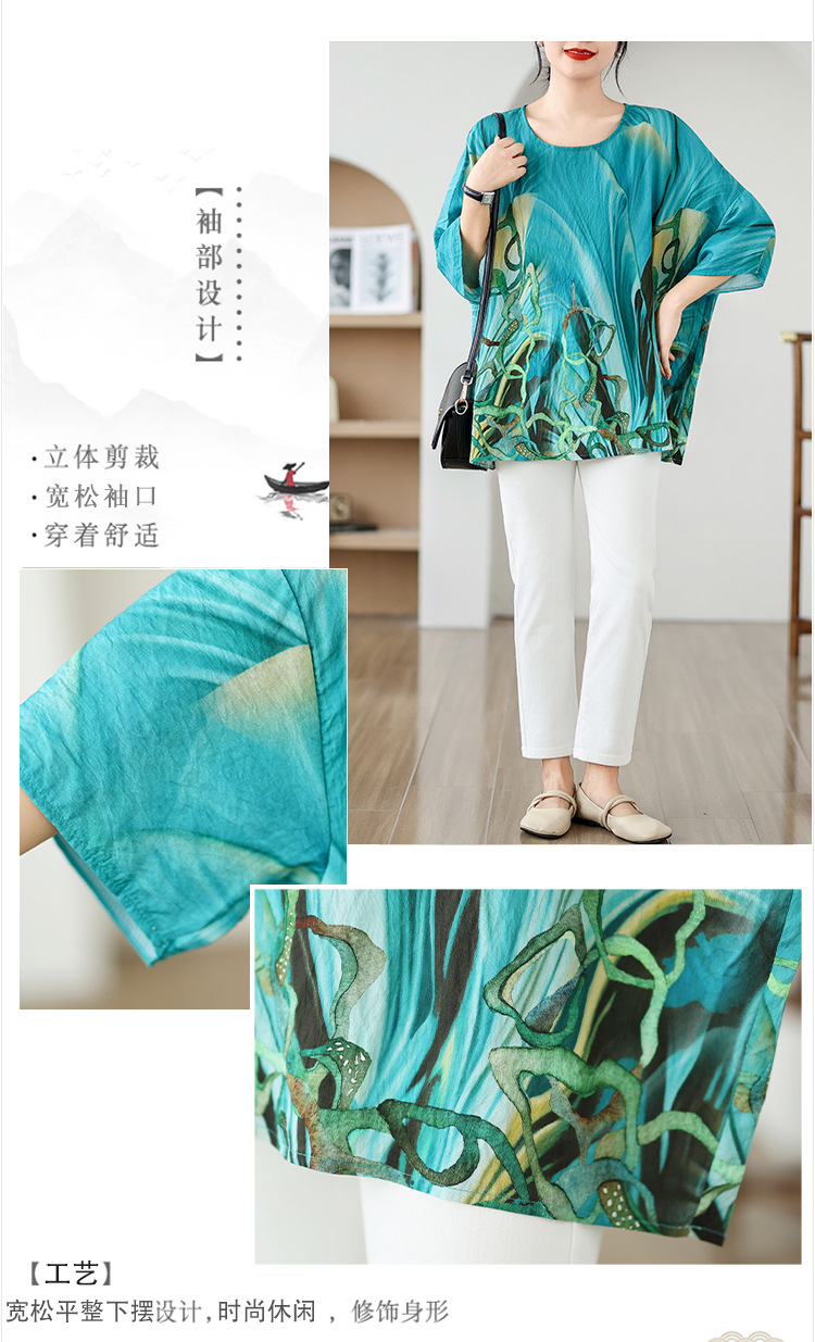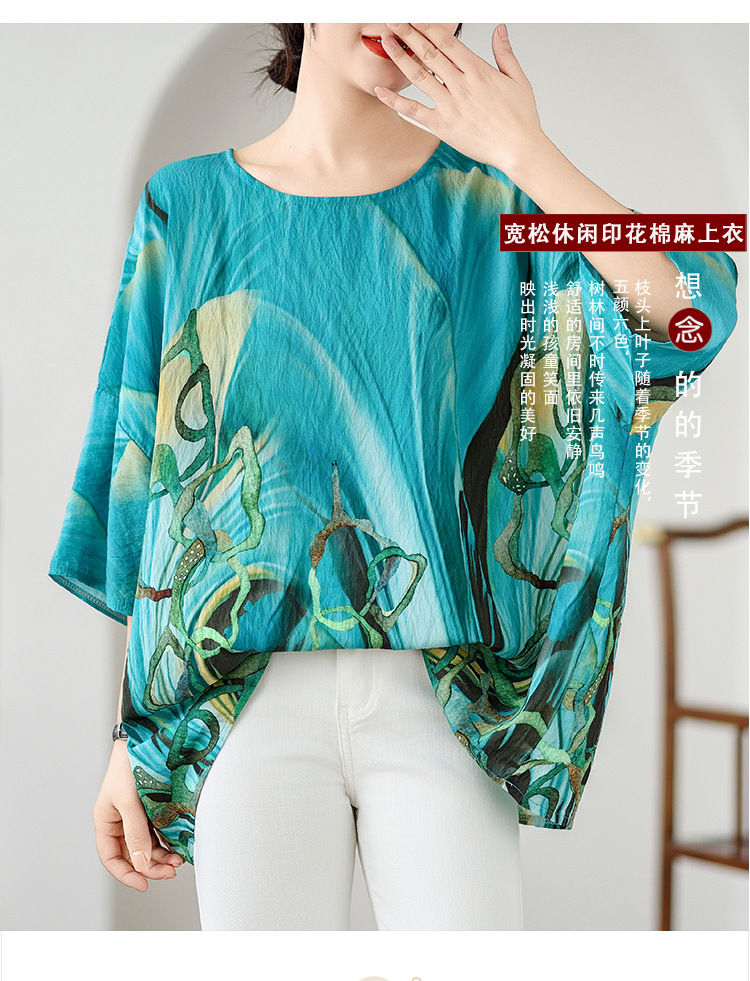 На самом деле 2024 новый летний хлопок конопли национальный ветер летучая мышь рукава свободная большая женская футболка с круглым вырезом женская 91738 #