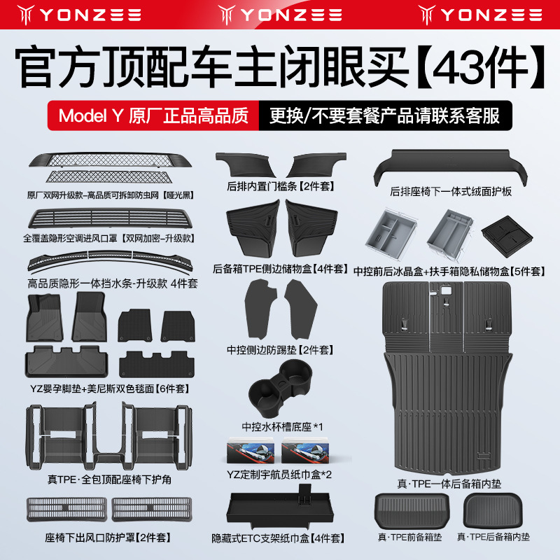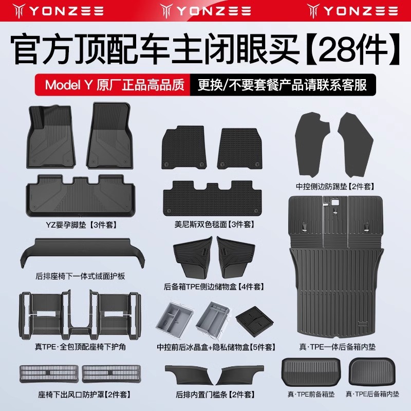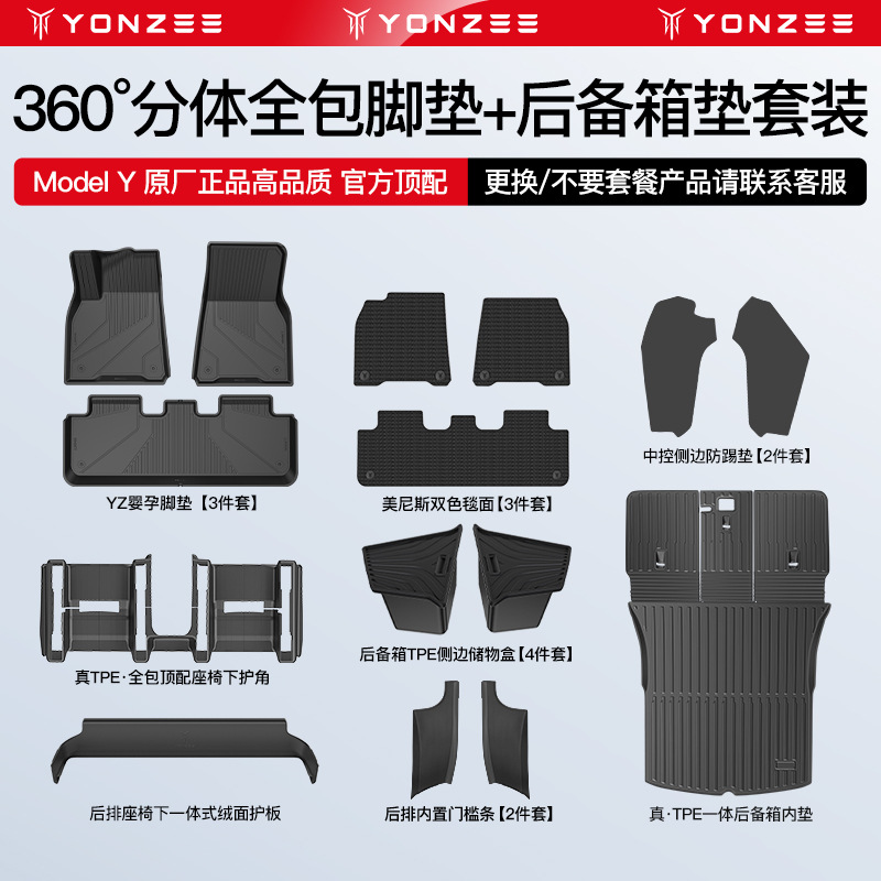 Модель Y-360 ° Комплект ковриков «все включено» [официальная верхняя версия]; Модель Y-360 ° Коврики «все включено» + комплект багажника [официальная верхняя версия]; Модель Y, встроенный коврик из ТПЭ + ящики для хранения вещей с обеих сторон багажника [официальная верхняя версия]; Модель Y для беременных, литые подушечки для ног из ТПЭ [оригинальный класс - водонепроницаемые и без запаха]; Модель Y для беременных, литые подушечки для ног из ТПЭ + поверхность ковра Menis высокой четкости [оригинальный класс - водонепроницаемый и без запаха]; Полностью литые напольные коврики из ТПЭ для беременных моделей Y + комплект передних и задних ковриков для багажника [оригинальный класс - водонепроницаемый и без запаха]; Модель Y для беременных, литой коврик для ног из ТПЭ + набор ковриков для переднего и заднего багажника + коврик для спинки сиденья [оригинальный класс - водонепроницаемый и без запаха]; Модель Y для беременных, литые напольные коврики из ТПЭ + поверхность ковра Menis высокой четкости + комплект передних и задних ковриков в багажник [оригинальный класс - водонепроницаемый и без запаха]; Модель Y для беременных, литые напольные коврики из ТПЭ + высококачественная поверхность ковра Menis + комплект передних и задних ковриков багажника + подушка спинки сиденья [оригинальный класс - водонепроницаемый и без запаха]; Закройте глаза и войдите в официальную подарочную упаковку для автомобилей высокого класса Model Y [набор из 43 предметов].; Закройте глаза и войдите в официальную подарочную упаковку для автомобилей высокого класса Model Y [набор из 28 предметов].
